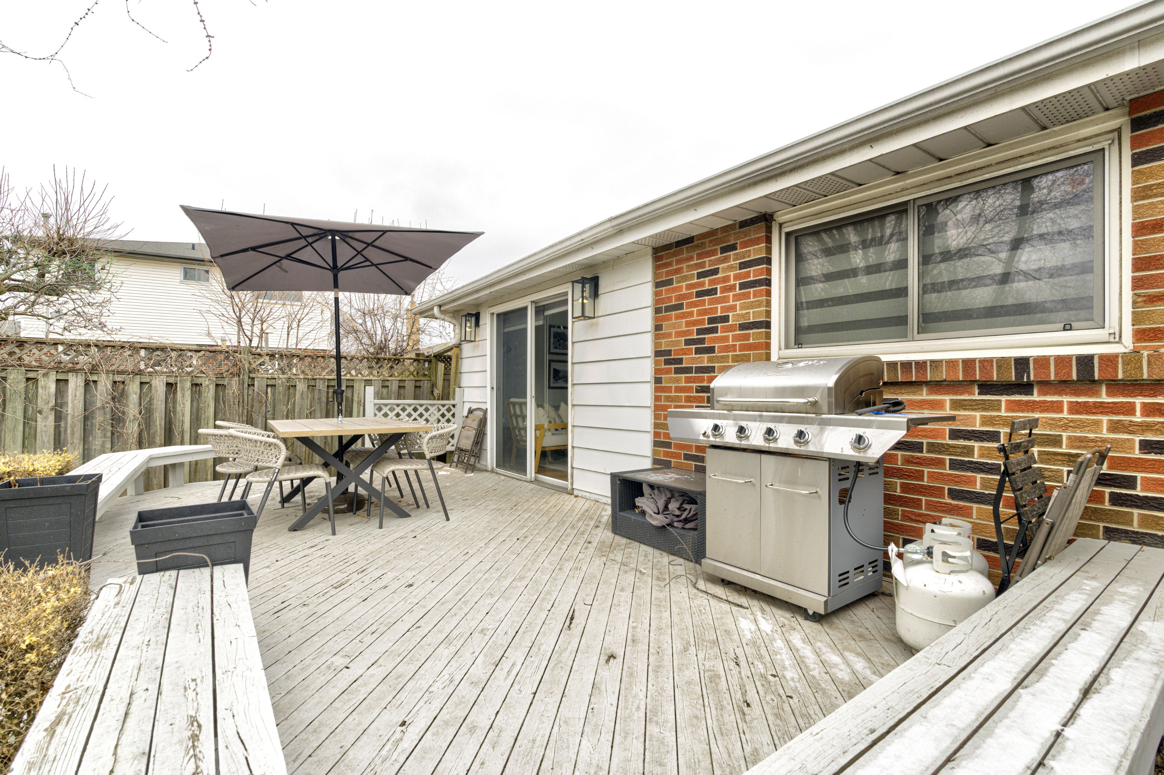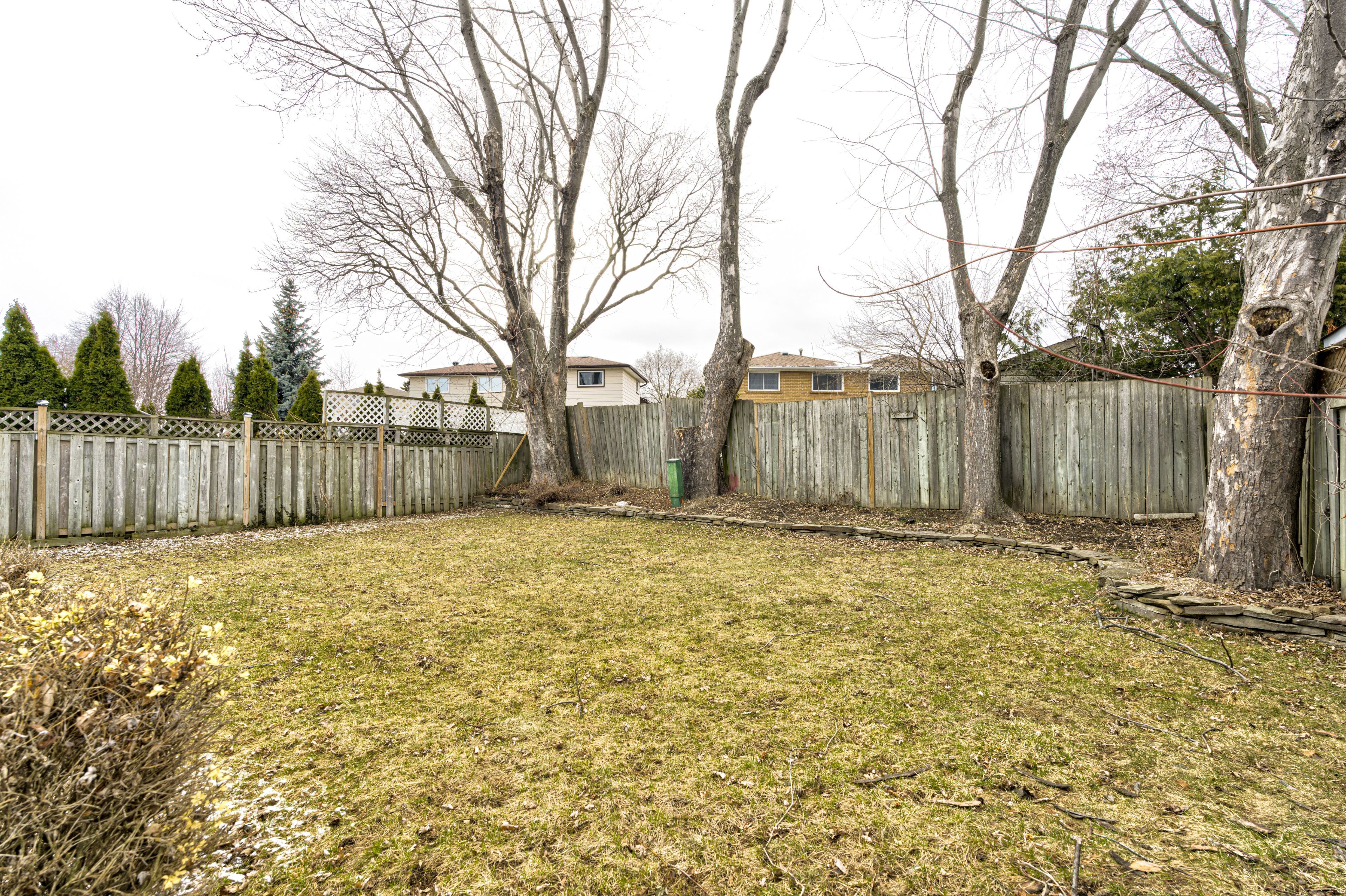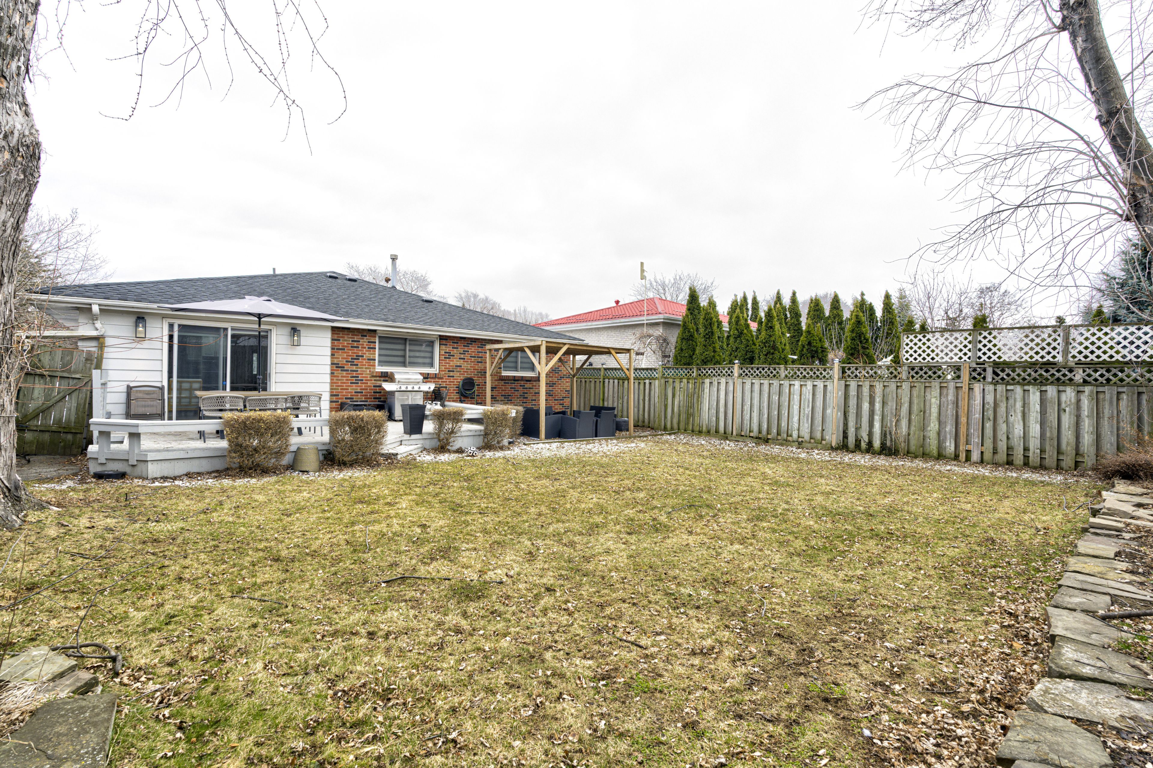 • Spacious backyard deck surrounded by mature trees, great for relaxing or entertaining.