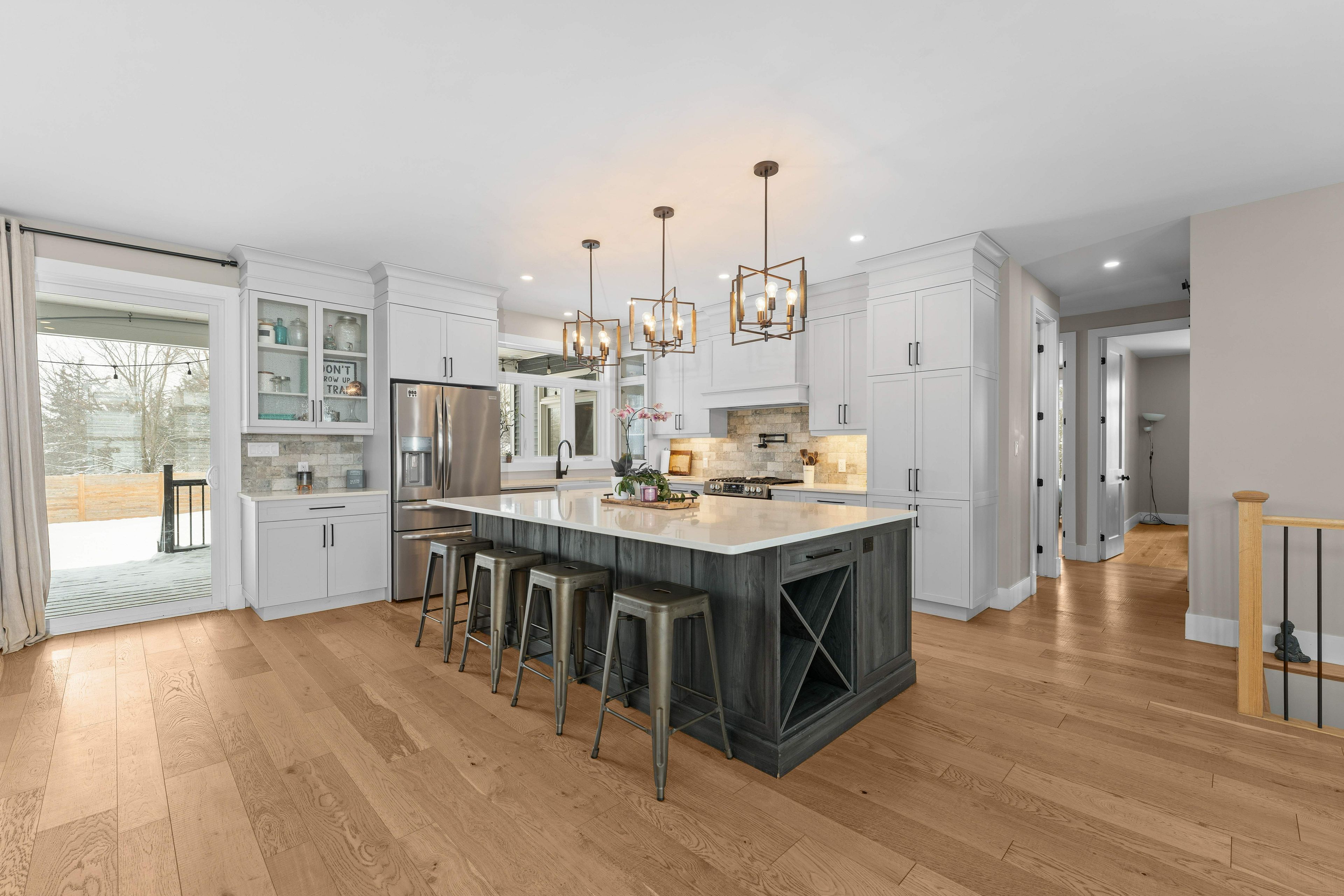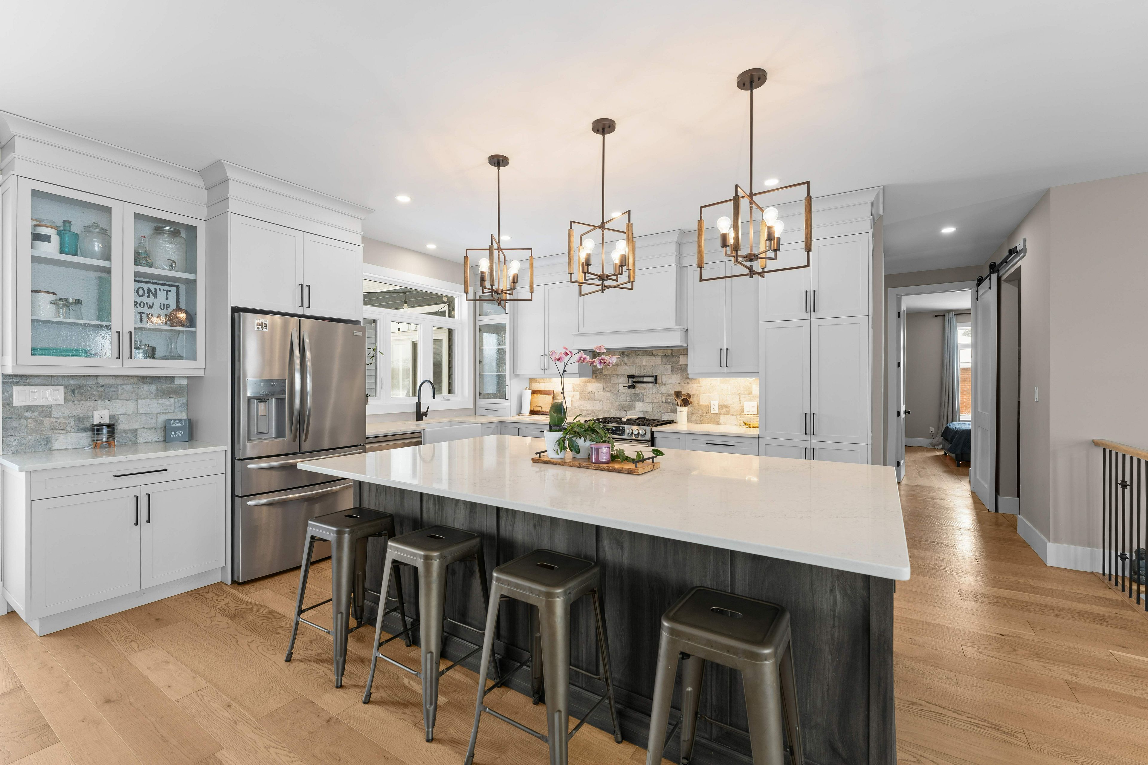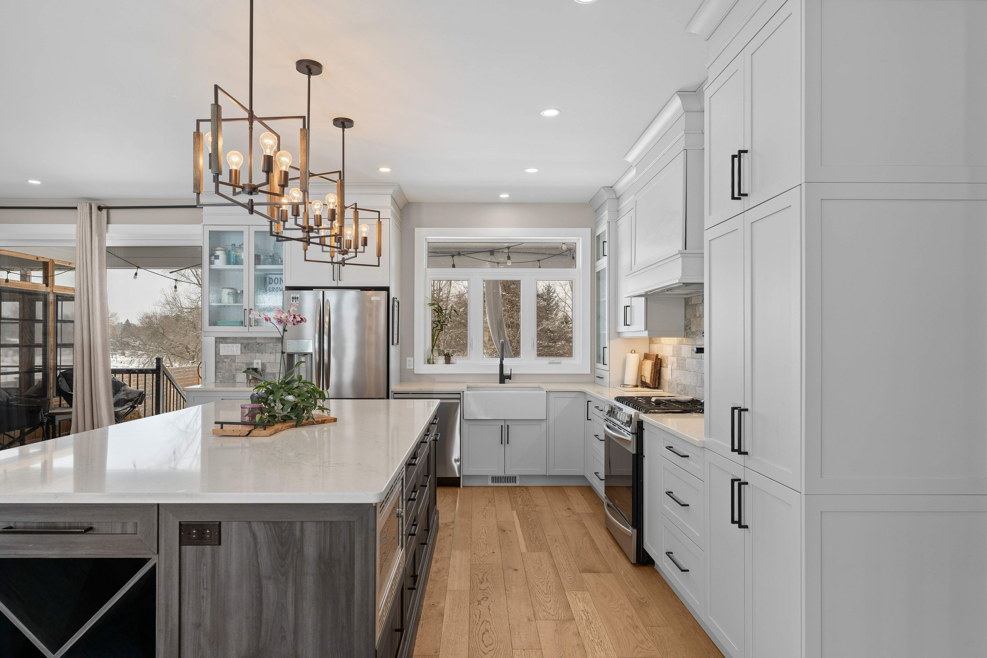 • Chef's kitchen with stainless steel appliances and large island for entertaining.