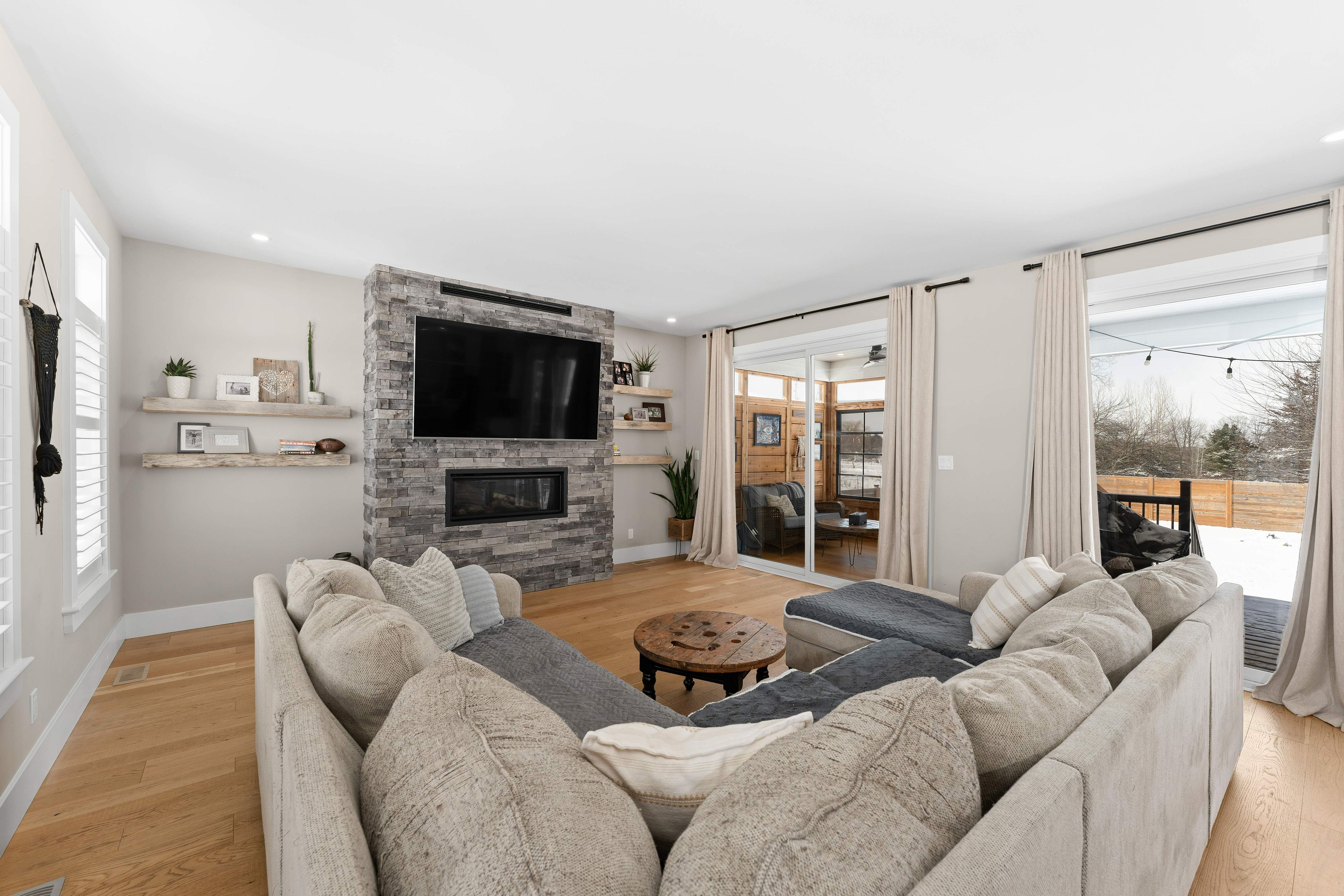 • Open-concept living area with 9ft ceilings and gas fireplace for cozy gatherings.