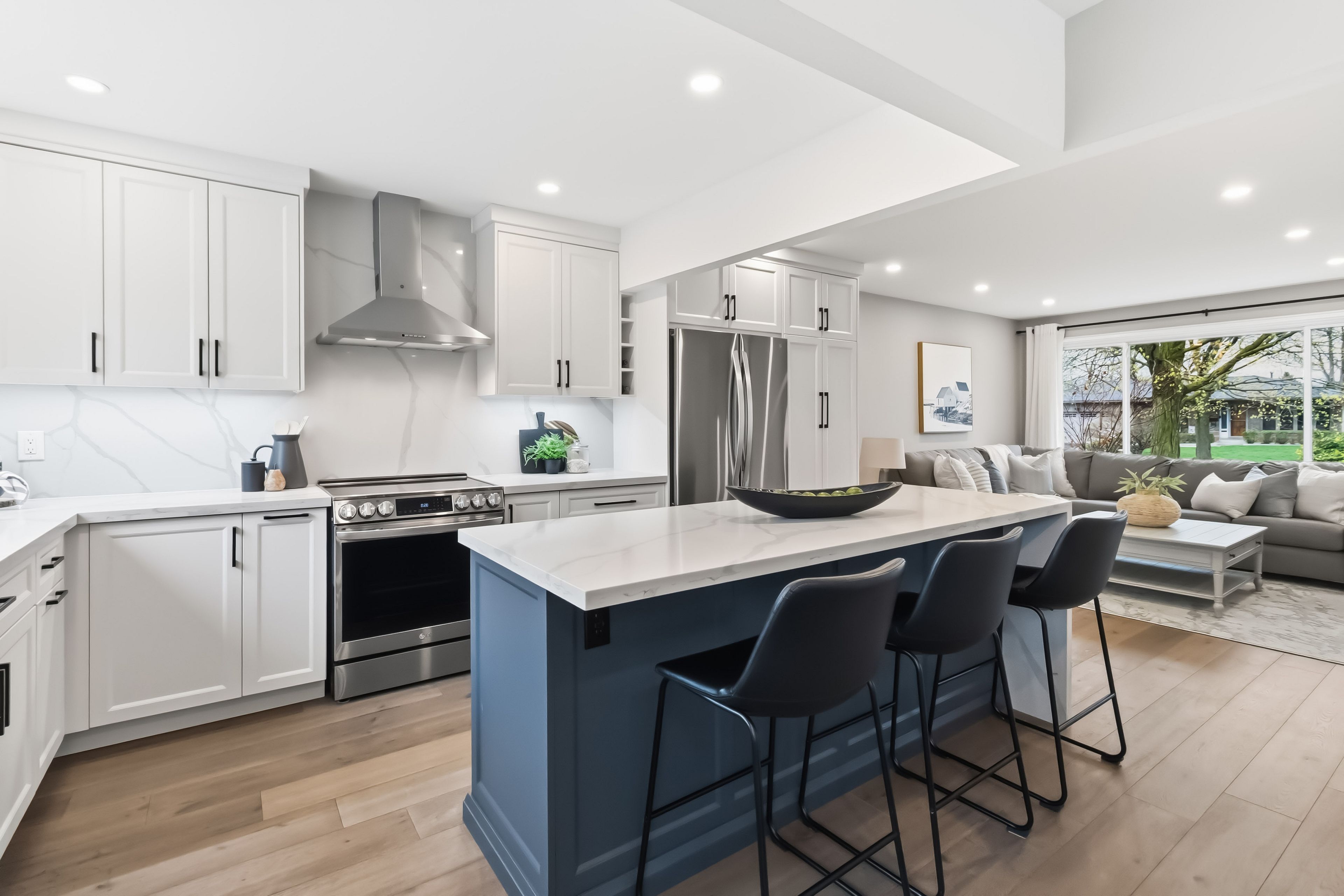 • Custom gourmet kitchen featuring quartz counters, large island, and stainless steel appliances.