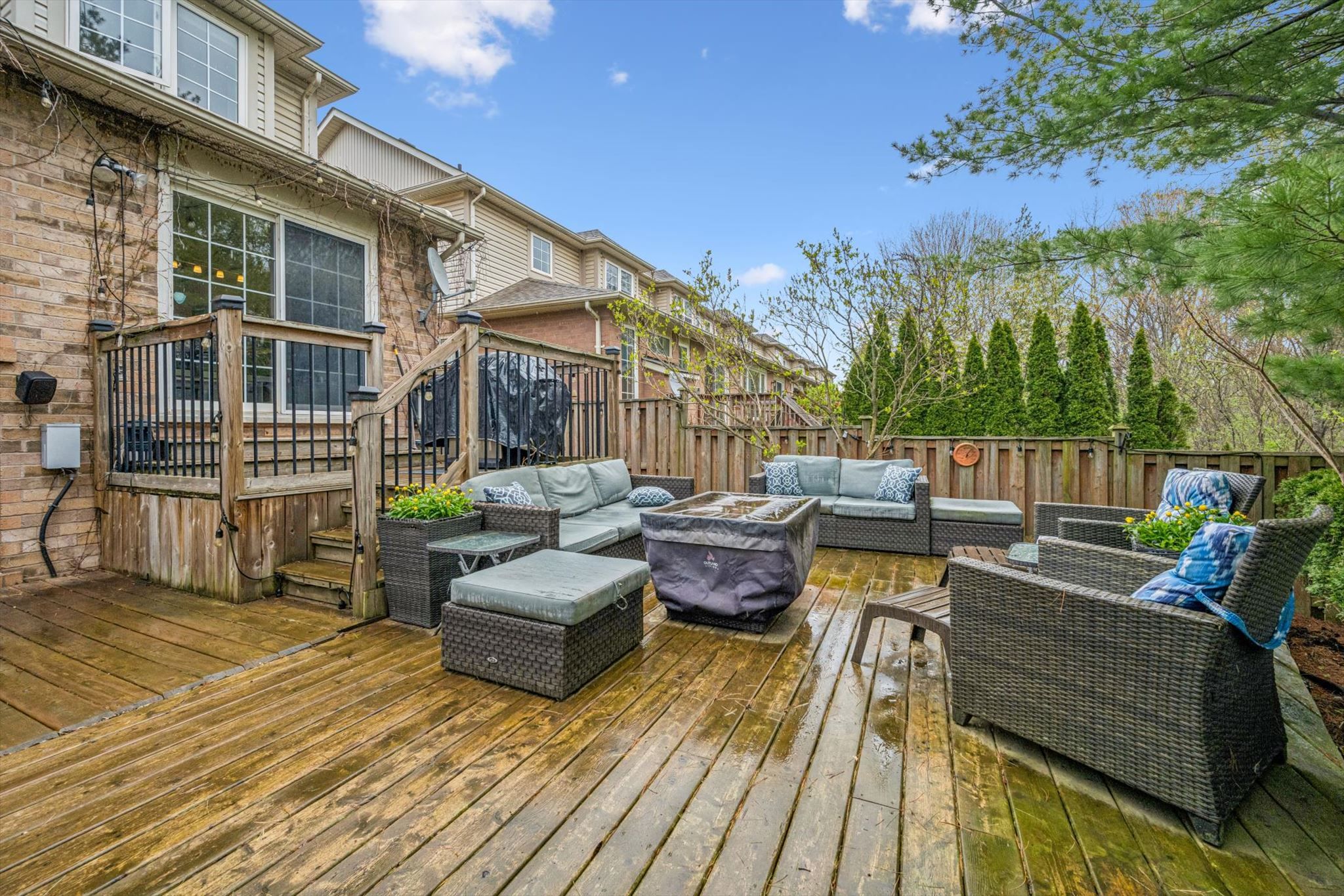 Welcome to this rarely offered end-unit townhouse, ideally situated on a quiet, family-friendly circle in the highly sought-after west oak trails community. Backing onto a lush ravine with no rear neighbours, this beautifully maintained residence offers an exceptional blend of privacy, comfort, and convenience. Filled with natural light from its desirable end-unit location, this townhome features a spacious and functional layout, perfectly suited for growing families and multi-generational living. The main level features a combined living and dining area, along with a well-appointed kitchen complete with granite countertops, stainless steel appliances, and a bright breakfast area with built-in bench seating and patio doors leading to your own resort-style backyard retreat. Enjoy a tiered deck and serene, private ravine views - ideal for relaxing or entertaining. A separate family room with a cozy gas fireplace adds warmth and versatility, completing the main level. Upstairs, a rarely offered second-floor laundry room enhances everyday convenience. Three generously sized bedrooms include a spacious primary retreat with a walk-in closet and four-piece ensuite, while a second four-piece bathroom serves the additional bedrooms. Professionally finished in 2016 the fully finished basement adds tremendous value, featuring a private in-law suite with a recreation area, kitchenette, bedroom, three-piece bathroom, and ample storage - perfect for extended family, guests, or flexible living arrangements. Additional highlights include inside access to the garage, a one-car attached garage, and two driveway parking spaces. Ideally located just minutes from major highways, oakville trafalgar memorial hospital, shopping, dining, the go station, parks, nature trails, and top-rated schools. Don't miss this rare opportunity to own a beautiful ravine-lot townhome in one of oakville's most desirable family-oriented communities.