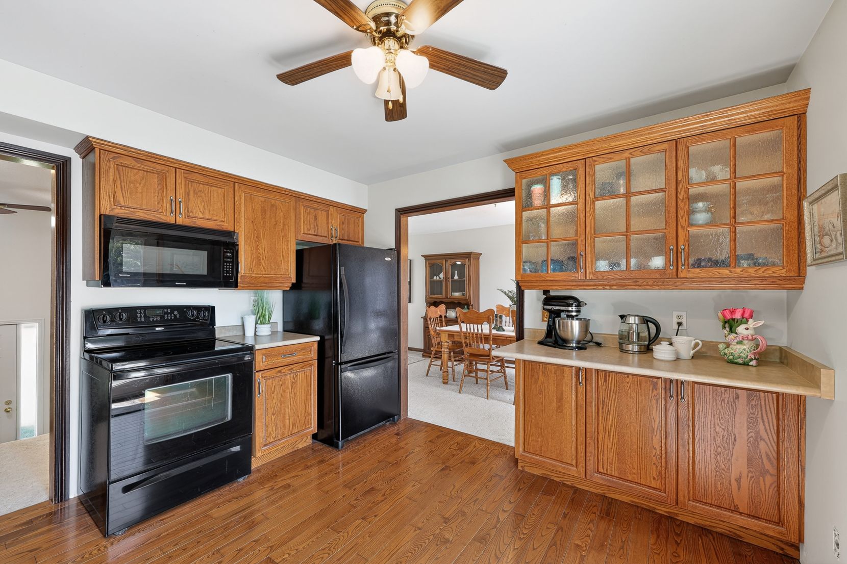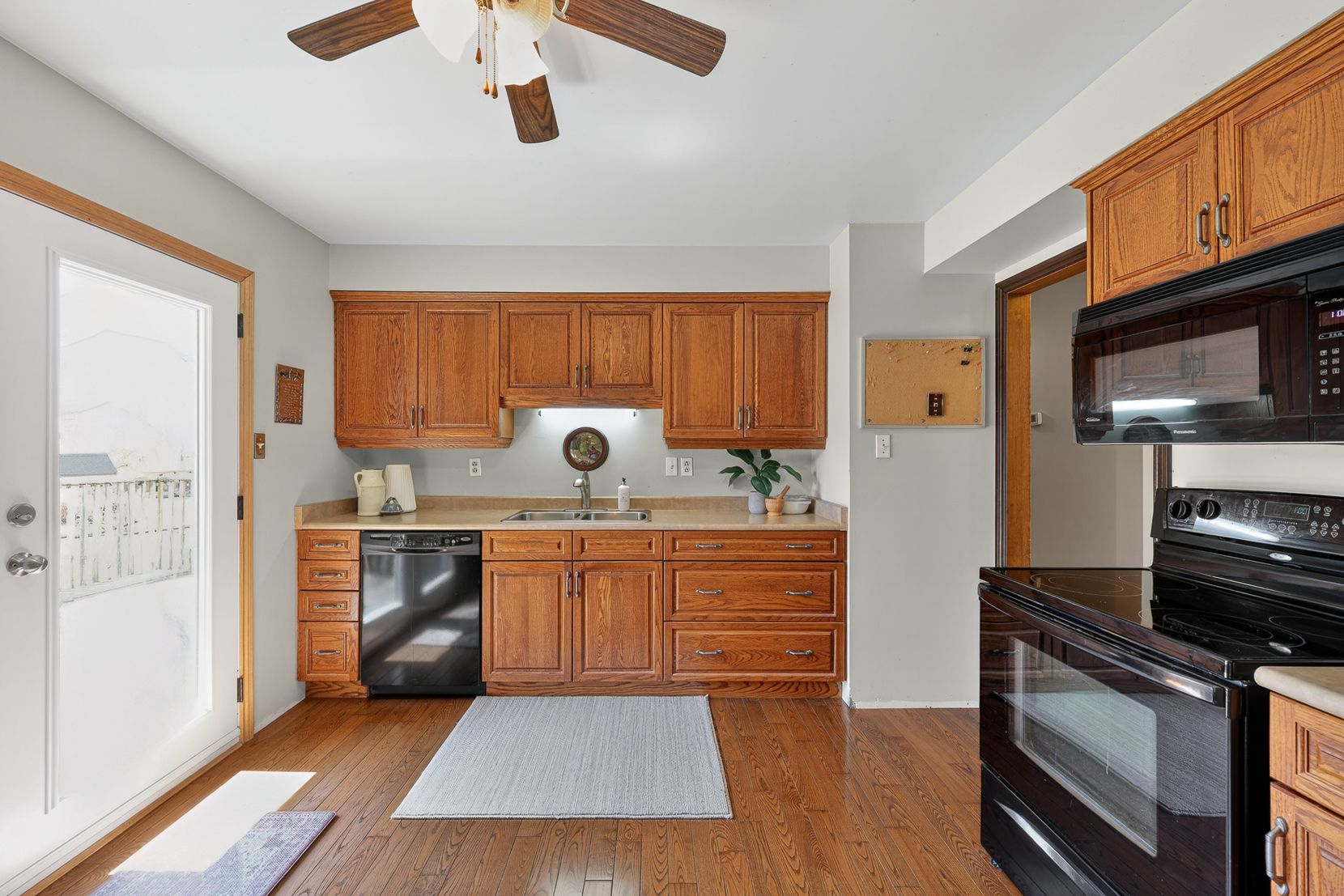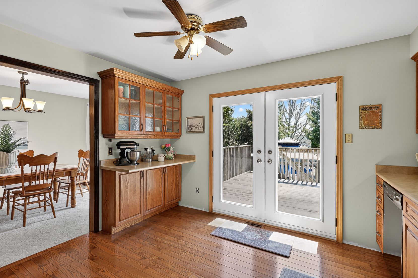 • Spacious kitchen with access to a deck and views of a landscaped yard.