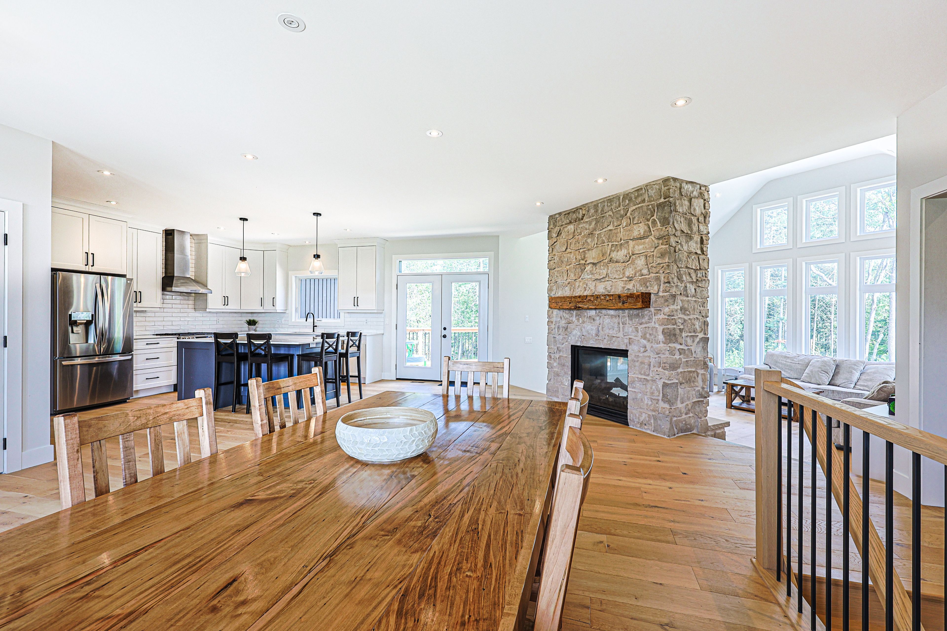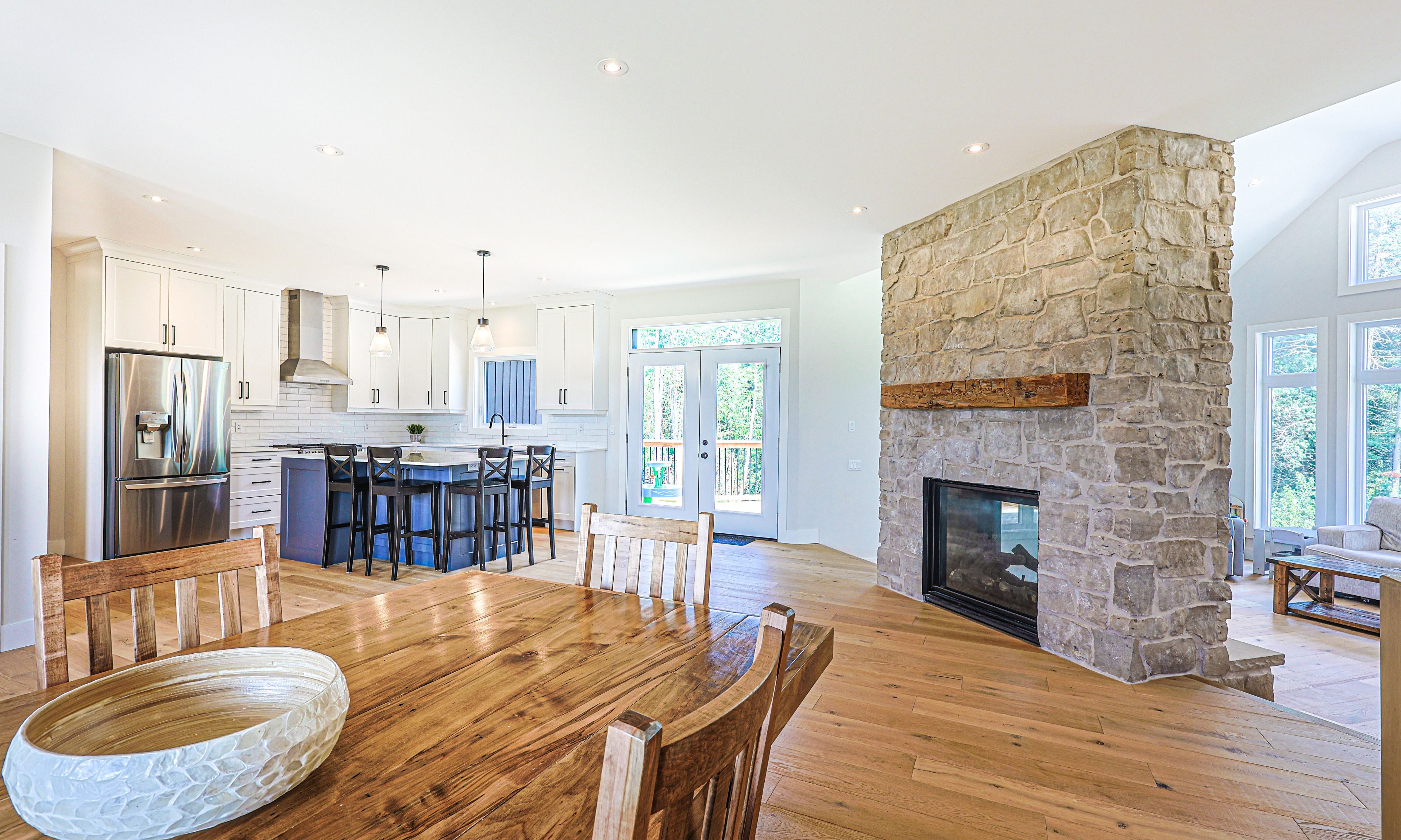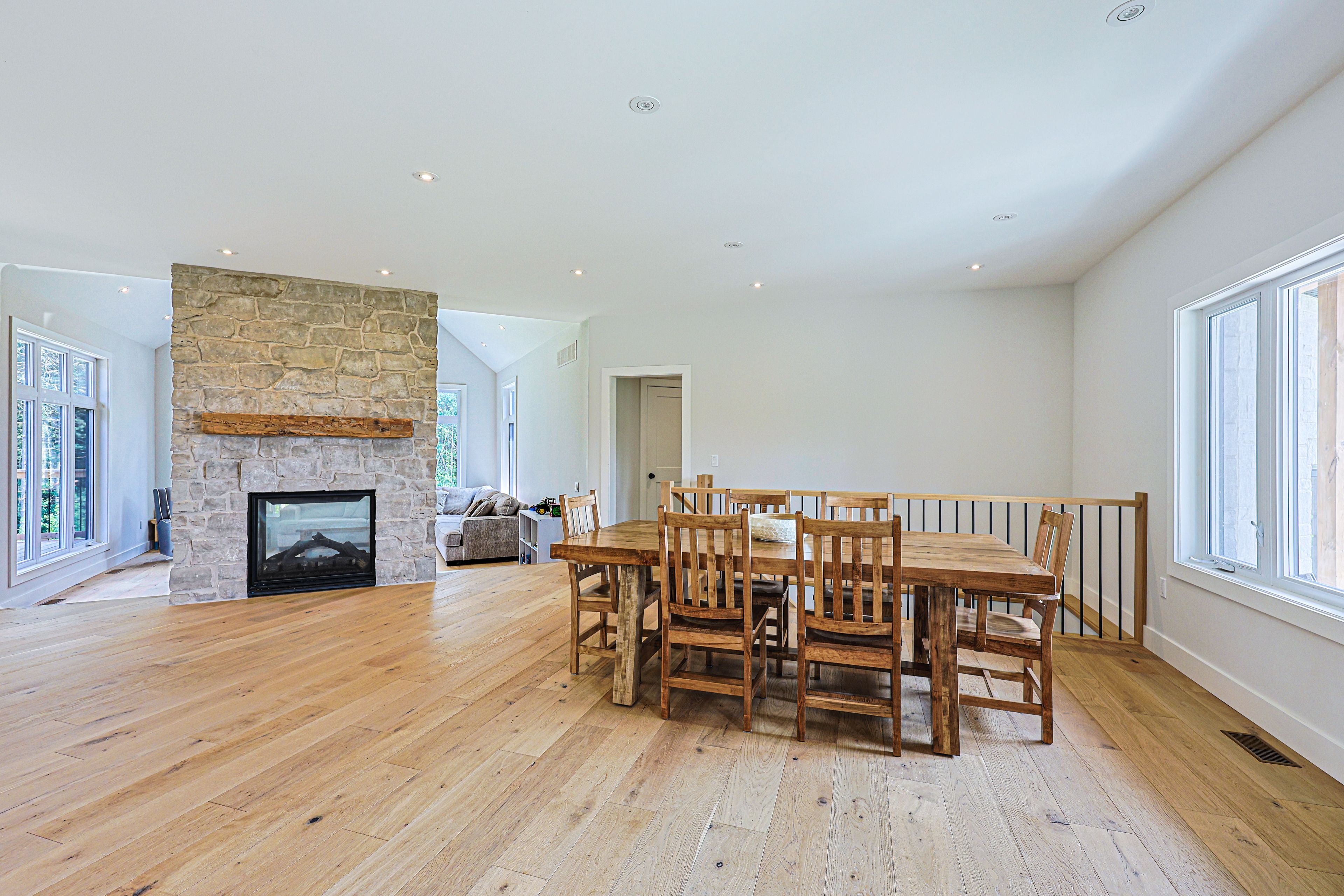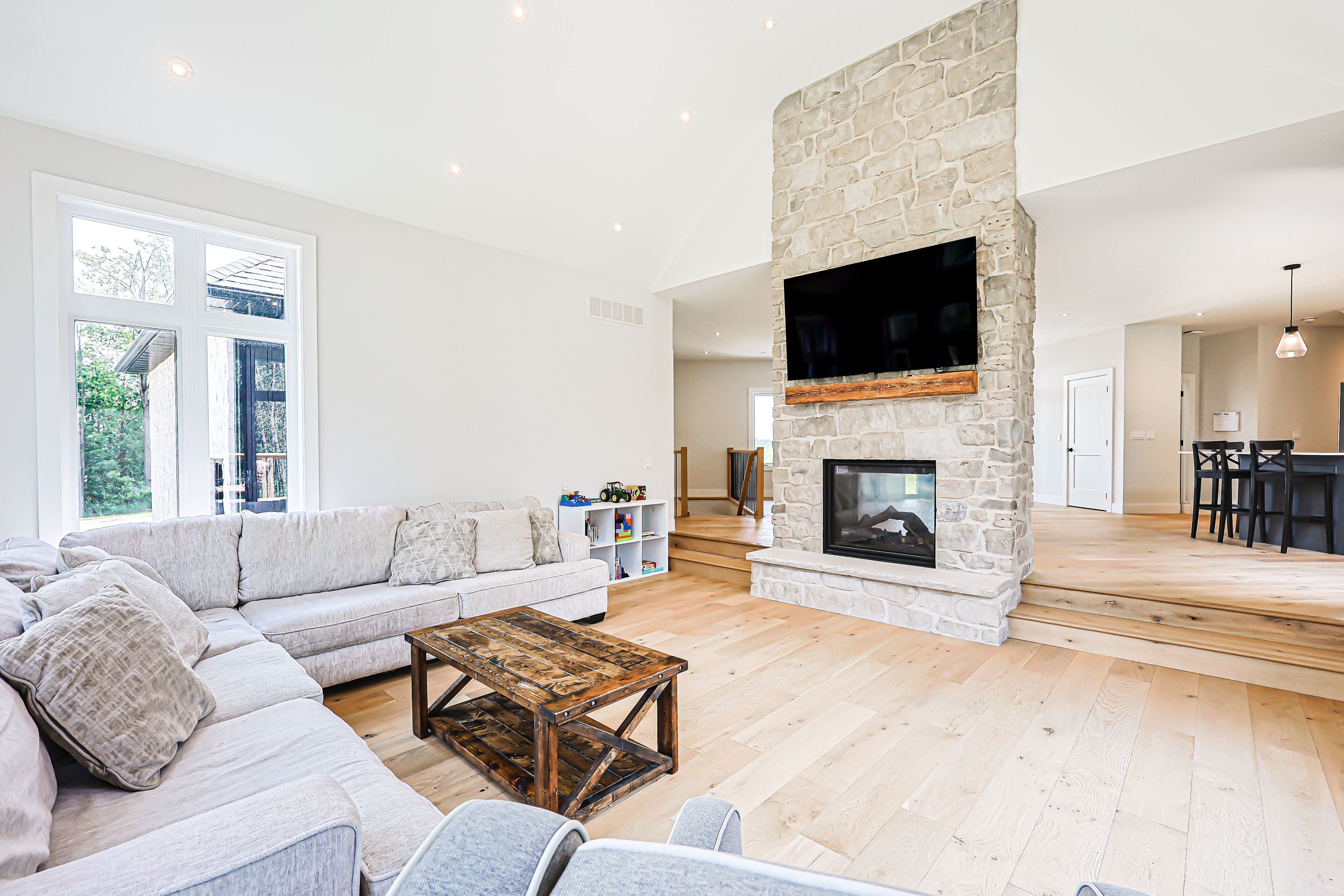 • Inviting open living space with vaulted ceilings and stone fireplace.