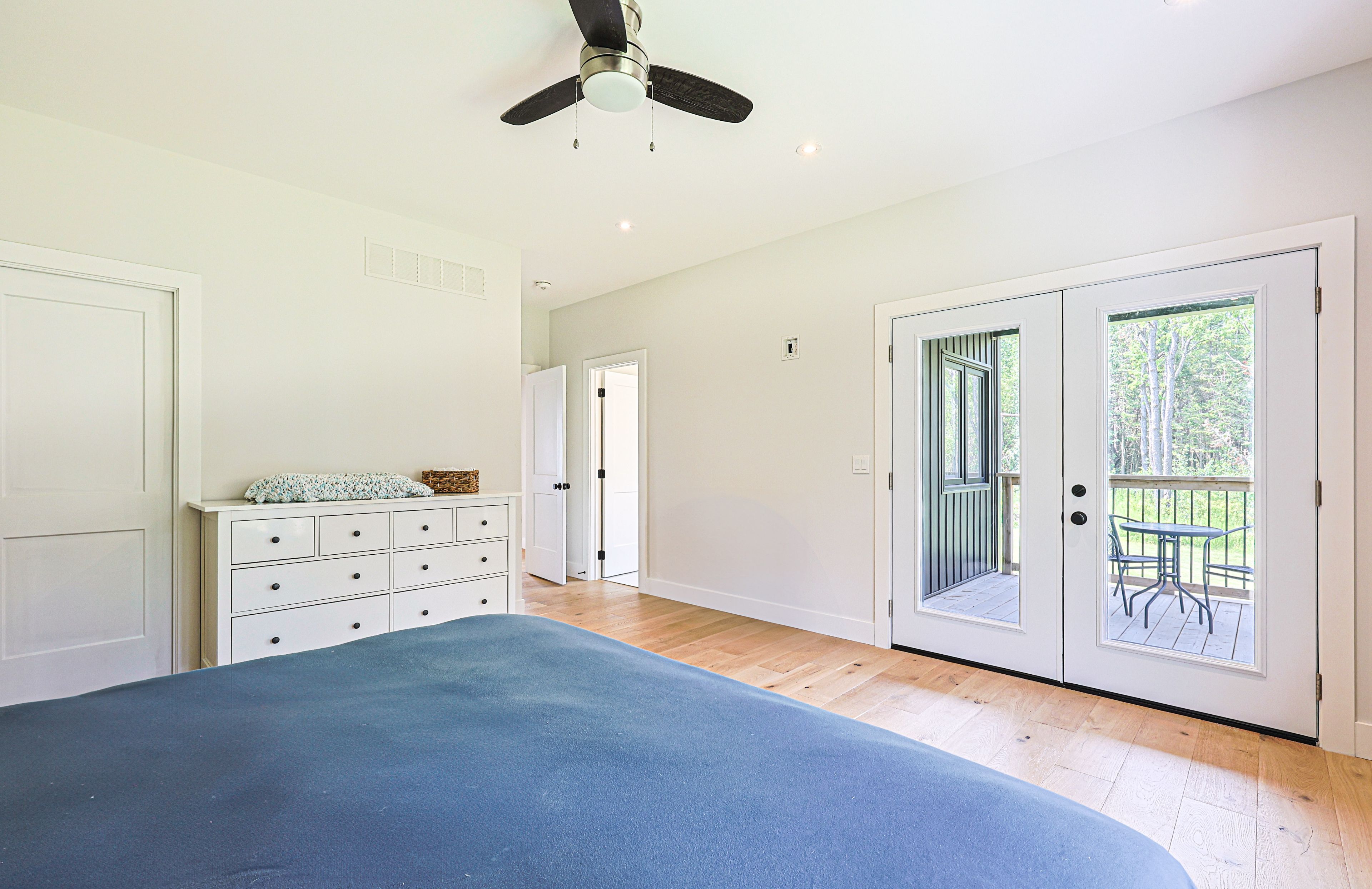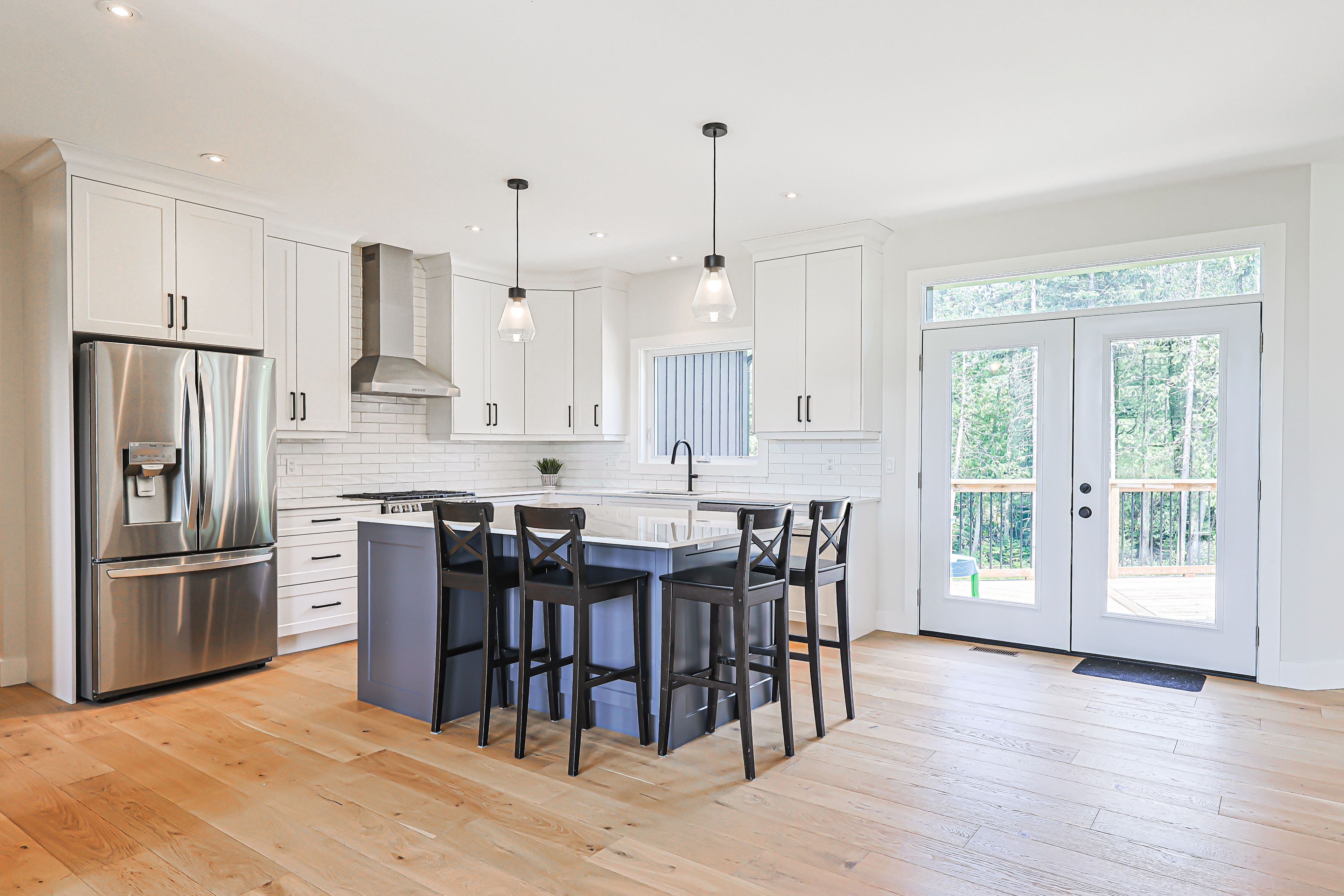 • Kitchen boasts large island, quartz countertops, and deck access.