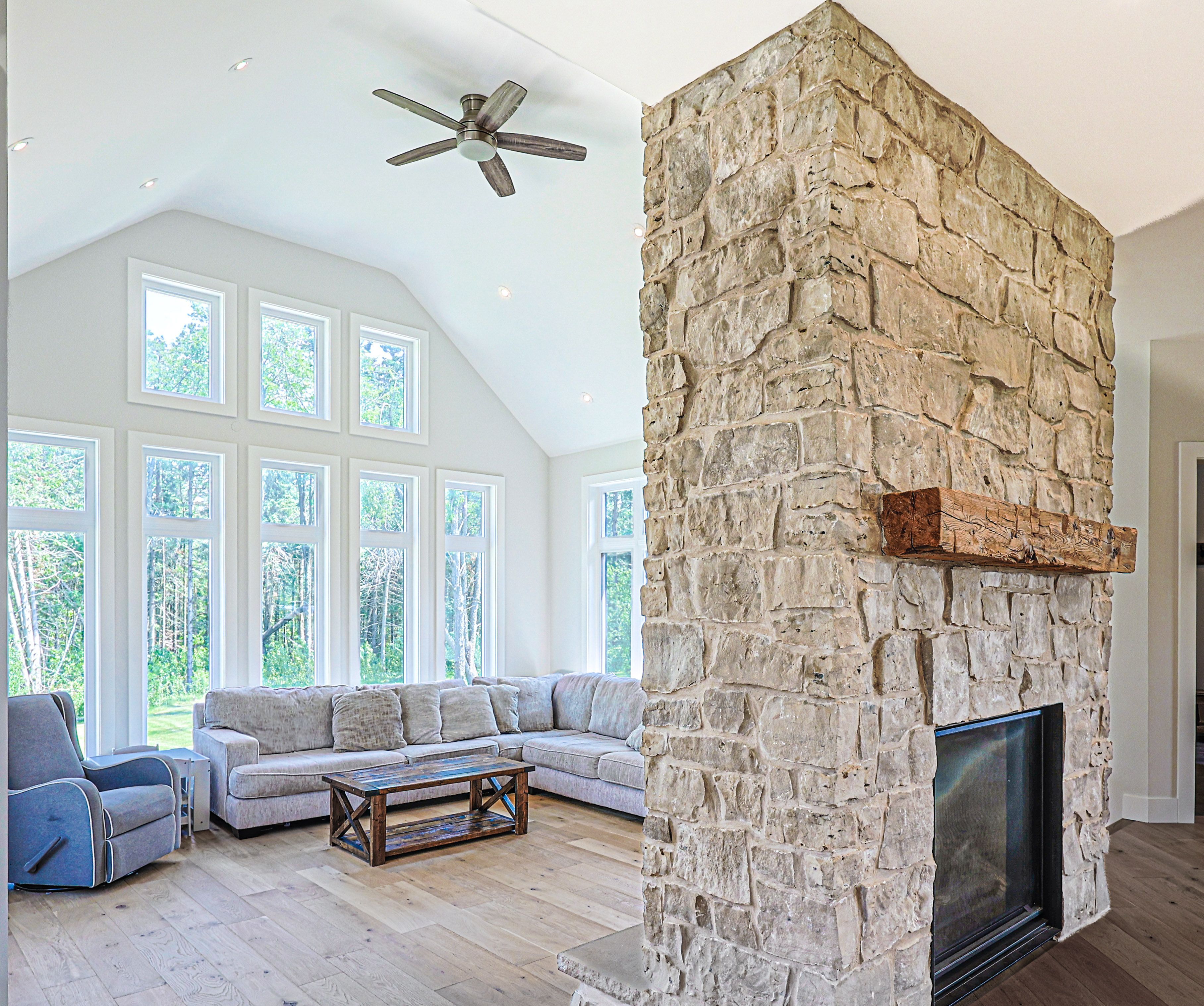 • Vaulted ceilings and a floor-to-ceiling stone fireplace in the main living space.