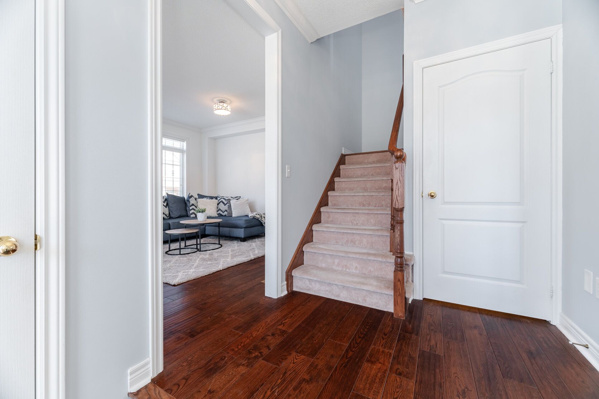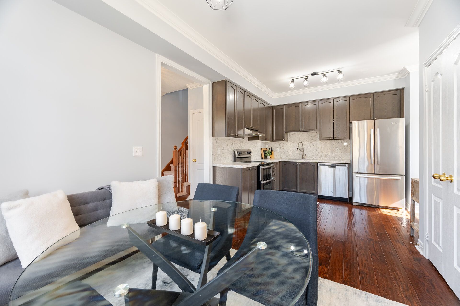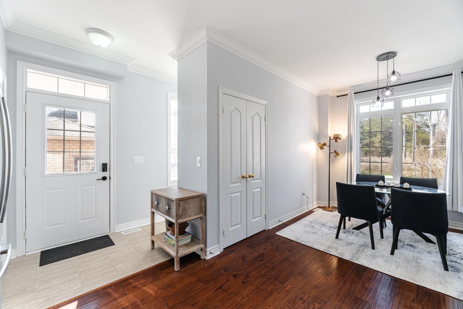 Impressive property, as good as semi-detached home in natural ravine frontage set-up with 3 (three) car parking spaces on extra wide freehold corner lot! Stunning end-unit freehold townhouse on a premium corner lot in desirable duffin heights! Welcome to this beautifully maintained home, proudly cared for by its owners. Nestled on an oversized premium corner lot, ths home offers exceptional space and a thoughtfully designed layout. Step inside to a bright and airy main floor featuring 9-foot ceilings adorned with elegant crown moulding. The open-concept design is enhanced by scraped solid oak hardwood floors, creating a warm and inviting atmosphere. A recently painted, sun-filled living room leads seamlessly to a formal dining area, perfect for hosting gatherings. The eat-in kitchen showcases stainless steel appliances, quartz countertops, a stylish backsplash, extended cabinetry, a double sink with a modern faucet, and a walk-out to a large deck ideal for relaxation and entertaining. Upstairs, the spacious primary suite boasts a walk-in closet and a luxurious 4-piece ensuite. The separate garage provides added convenience, while unfinished basement is a blank canvas awaiting your personal touch - complete with a 3-piece rough-in bath and large egress-style windows, offering endless possibilities. Unique features: for townhouse having 3 (three) car parkings! Located in a quiet, family-friendly neighbourhood, this home is just minutes from major highways (401 & 407), shopping centers, pickering golf club, greenwood conservation area, and the scenic duffin heights forest & river trail. Don't miss this incredible opportunity to own a home in one of pickering's most sought-after communities! Whether you're a growing family, a professional couple, or a savvy investor, this home offers the perfect blend of comfort, space, and future potential. Fall in love at first sight, unique property in natural ravine with parkings!!
