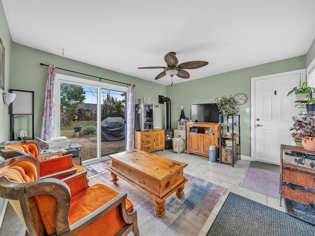 • Cozy sunroom with gas fireplace overlooking the private backyard.