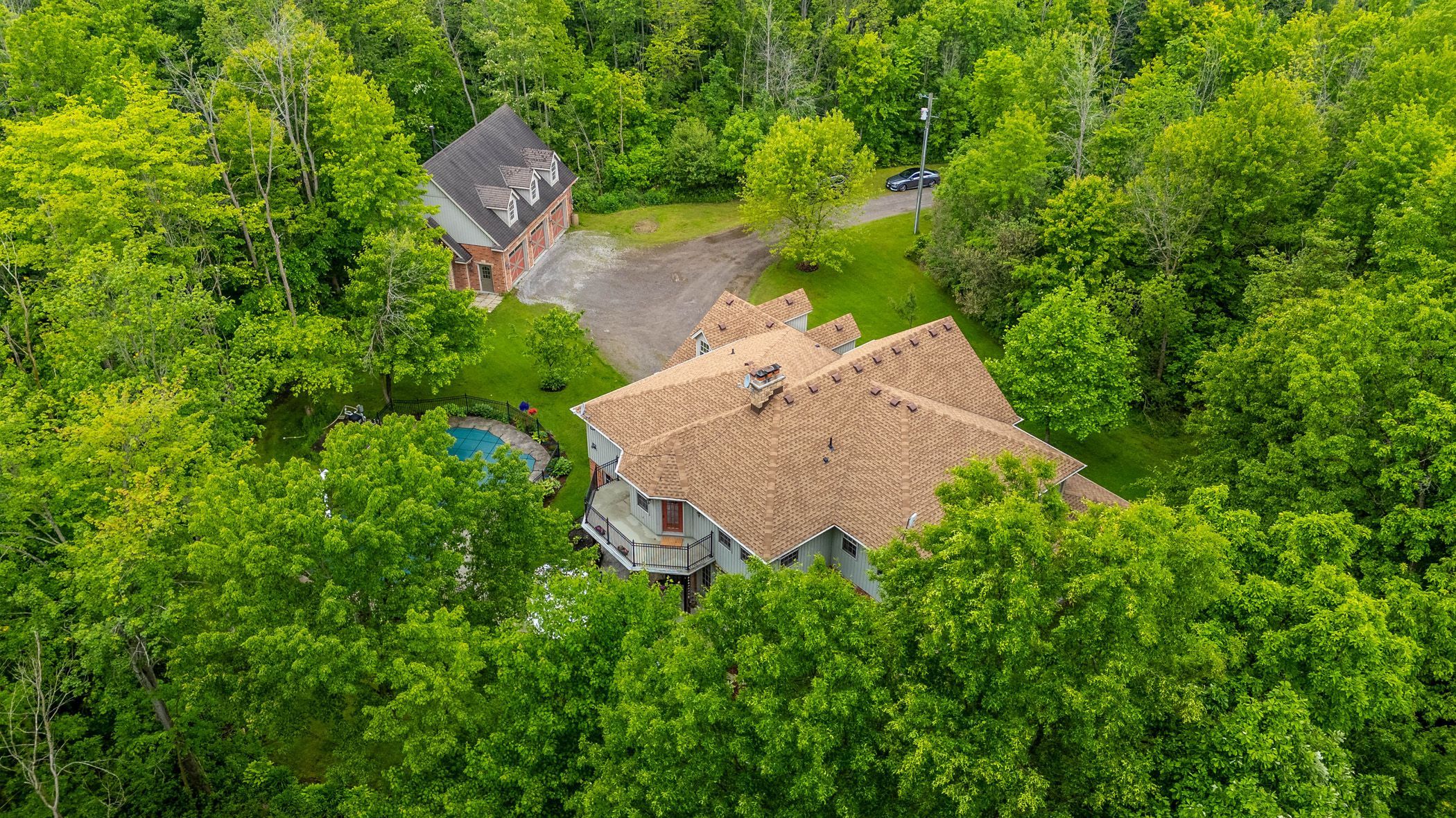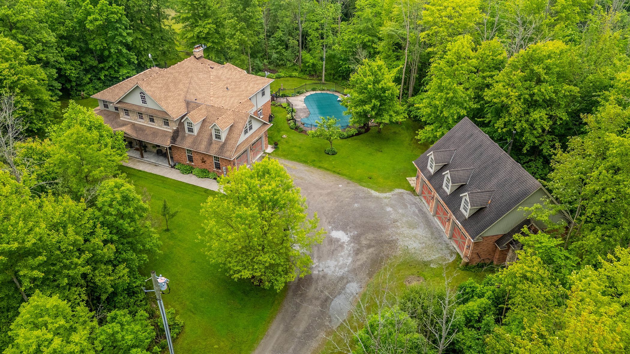 Welcome to "the headwaters"! Nestled on 50 acres of pristine forest and 6 mile creek, this custom built, 2 storey estate offers the perfect blend of luxury, comfort and natural beauty. From the moment you pass through the gated entrance and travel along the tree lined driveway a sense of serenity will surround you. Whether you're unwinding by the inground pool, basking in the warmth of the wood burning fireplace, every moment here feels like a peaceful escape. As you step inside you're welcomed by soaring ceilings and an open concept design that bathes the home in natural light, creating an airy and inviting atmosphere. The upper level showcases 5 spacious bedrooms and 5 thoughtfully designed bathrooms, including 2 with jack -and-jill configurations. A convenient laundry chute adds a practical touch! The primary bedroom is an inviting retreat. Generously sized, this serene space offers a sitting area, a private balcony and the comfort of a gas fireplace. Complete with a 5 pc ensuite and an oversized dressing room style closet! The heart of the home is a grand family room with double doors opening to lush gardens, completed with a rumford wood fireplace. The remainder of the main level is thoughtfully designed offering a spacious dining area with classic french doors, a formal living room with a gas fireplace, a cozy breakfast nook overlooking the gardens and a quiet study with a private entrance. Here you will also find the laundry room, plenty of storage and 2 washrooms. Additional features include an attached double garage and a secondary entrance through the basement. For the hobbyists or those in need of extra space, the detached 2 storey triple garage is fully equipped with 2 wood stoves and is perfect for storing equipment, vehicles, or pursuing your passions! The property invites endless outdoor adventures, whether you enjoy gathering around campfires, exploring trails on your atv, or snowmobiling through your very own backyard! This home is a timeless beauty.