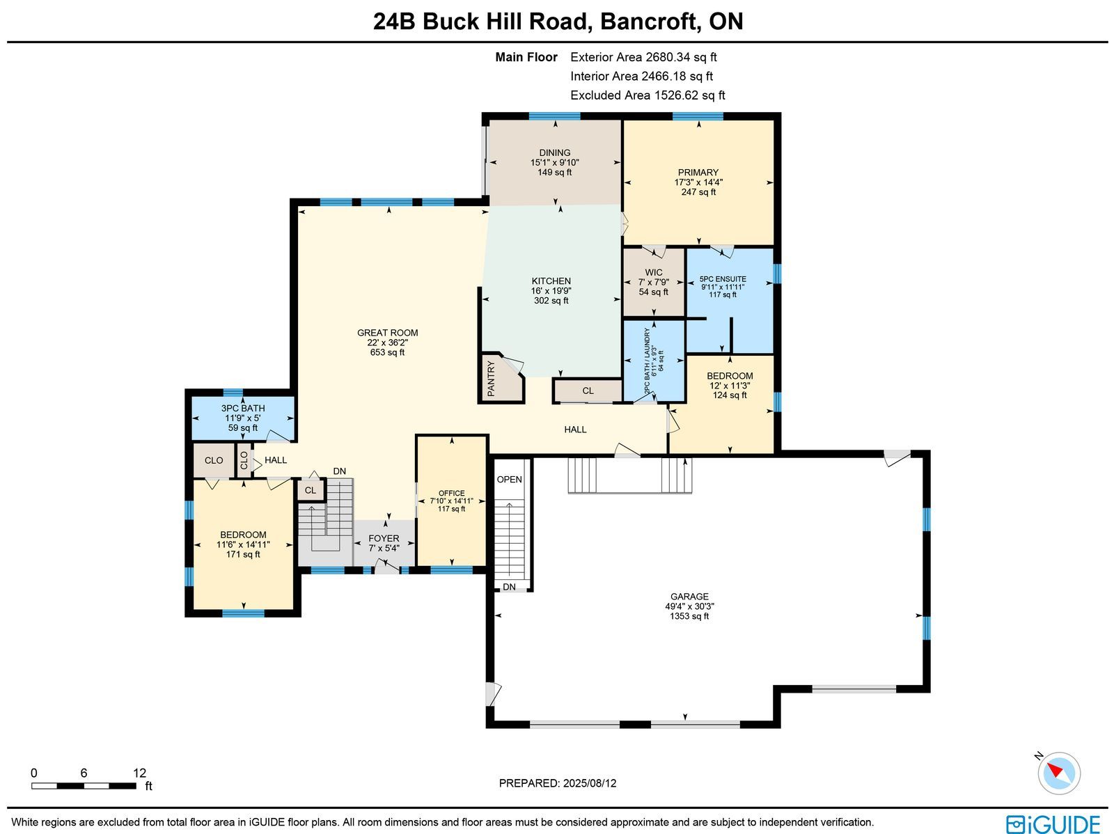 Gorgeous newer bungalow on 1 acre, nearly 2,600 finished sq ft, heated, insulated & drywalled triple garage, 7-person hot tub & 600 sq ft deck! Built in 2022, 24b buck hill is turning heads with stone accents, vinyl siding, bold peaked roof lines, black-framed windows, and soffit lighting that steals the show at dusk. The attached triple-car garage spans nearly 1,500 sq ft, heated, insulated, and drywalled, built with 12-foot ceilings, 220-volt welder plugs, led strip lighting, and three modern 10 ft x 10 ft doors powered by side-mounted liftmaster wi-fi openers. Step inside and the great room makes an immediate impression, a wood-plank vaulted ceiling soaring above a dramatic wall of windows that brings the outdoors into every hour. The kitchen keeps things social and current with quartz countertops, a central island designed for conversation, and a tile backsplash. The main-floor primary bedroom offers a calm, private retreat with a 5-piece ensuite featuring a soaker tub, walk-in shower, dual sinks, and a stand-up shower. Two additional bedrooms and a full bathroom create quiet pockets for family and visitors, the main-floor office earns its place for uninterrupted work, and a laundry room plus a powder room complete a layout that simply works. The basement remains untouched, offering a separate entrance from the garage and a partially completed 3-piece bathroom, giving future owners a head start on flexible guest space or private living quarters. Less than 10 minutes from downtown bancroft for gas stations, restaurants, grocery stores, schools, parks, medical services, and daily essentials, this #hometostay makes every arrival feel like something worth looking forward to.