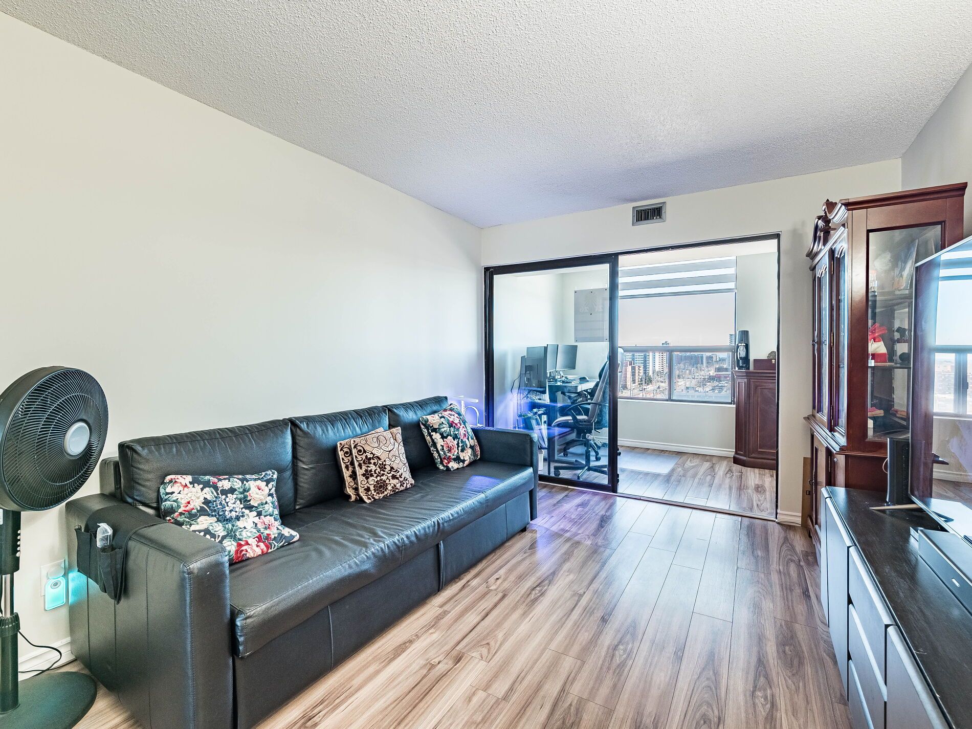 • Modern laminate flooring and elegant quartz countertops throughout the spacious unit.