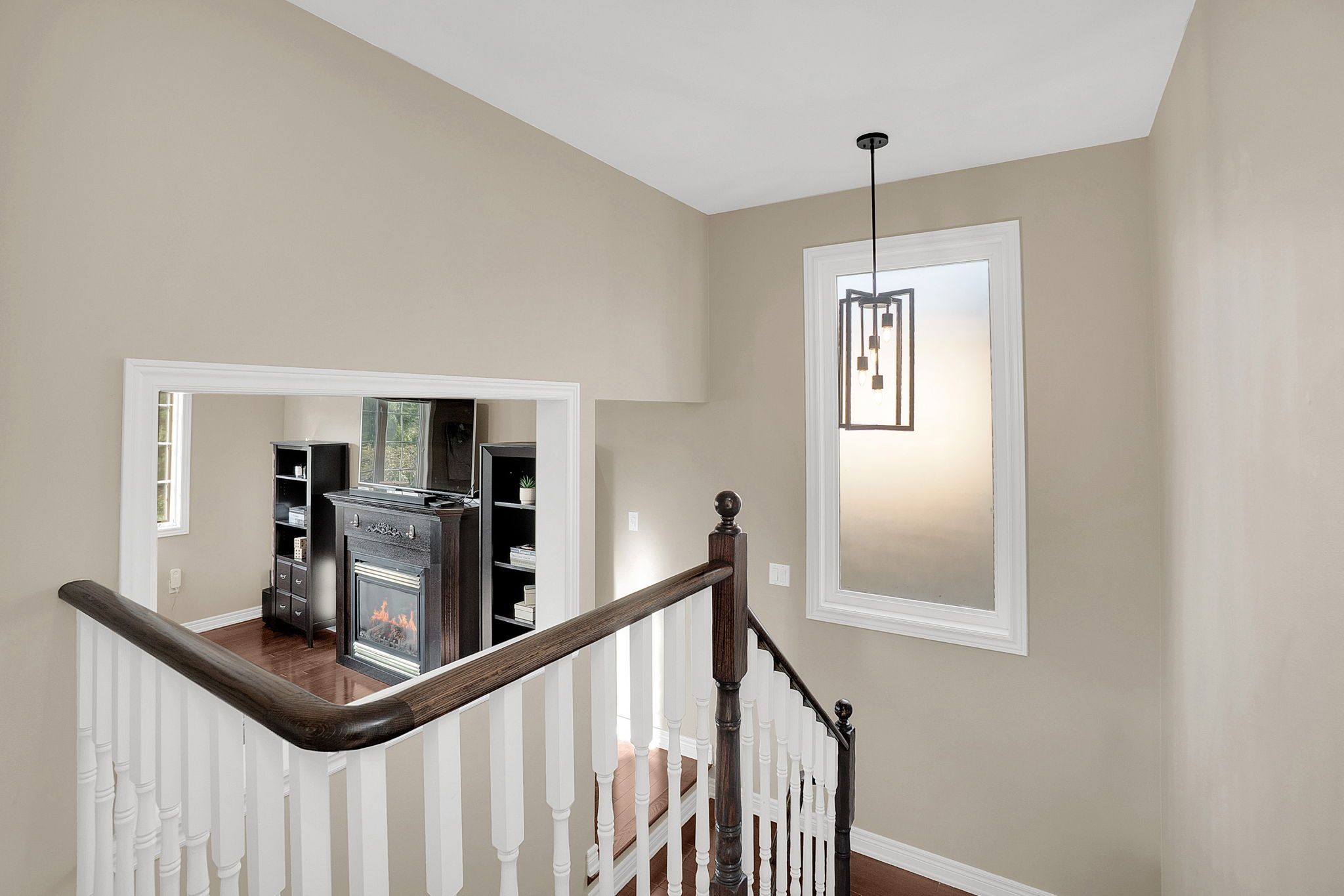 • Open living area with high ceilings and a cozy gas fireplace.
