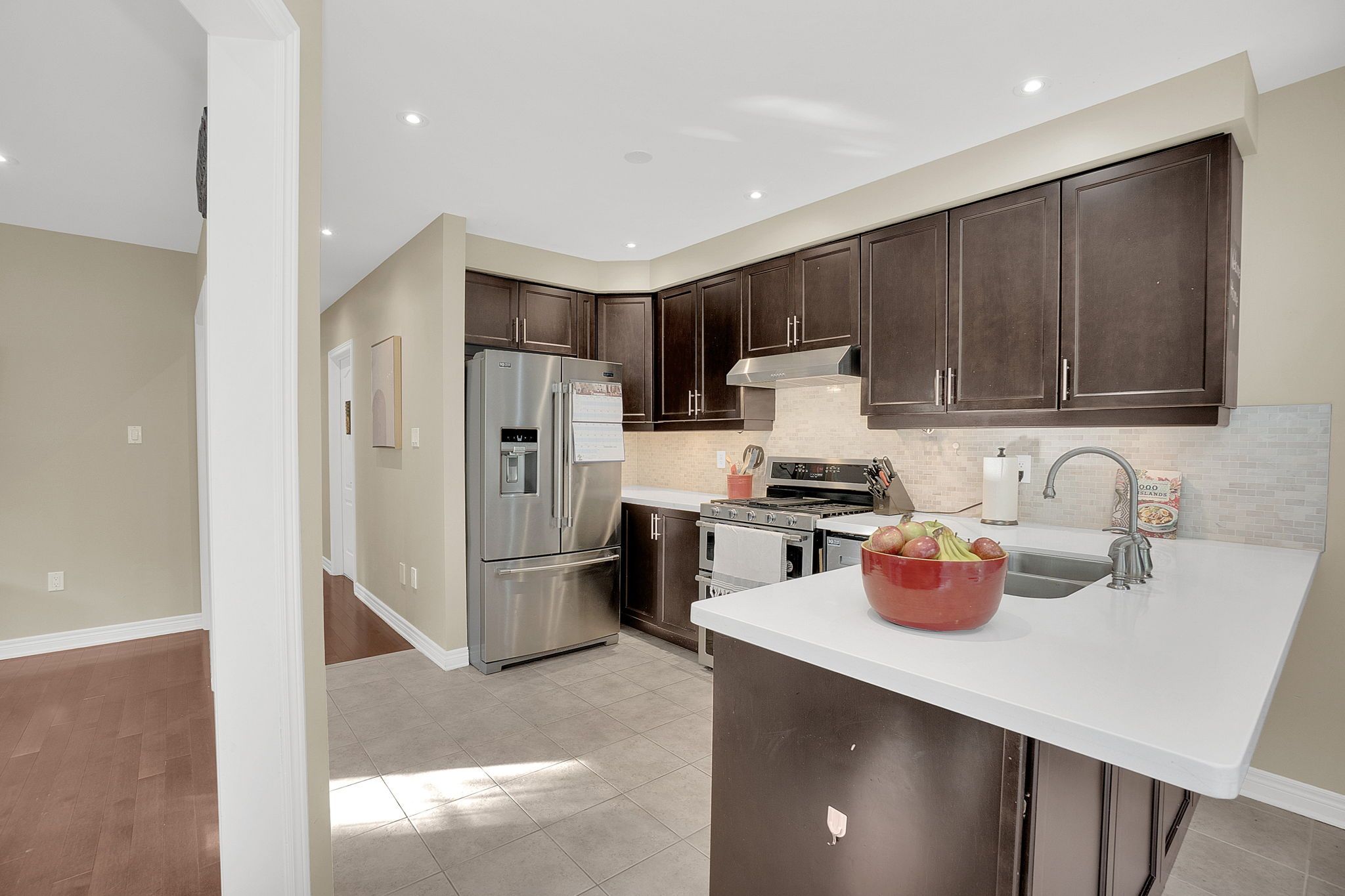 • Modern kitchen with stainless steel appliances and quartz countertops.