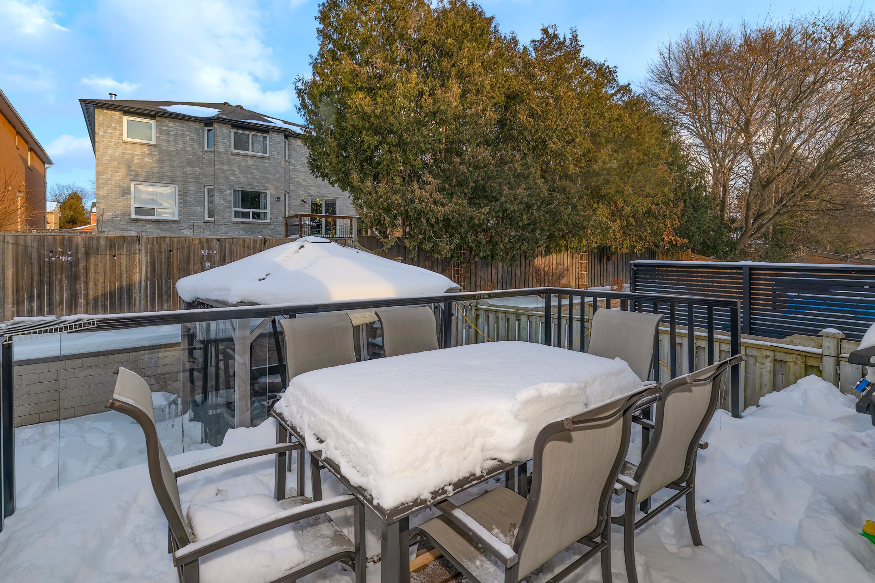 • Private backyard with a raised deck and stone patio for entertaining.