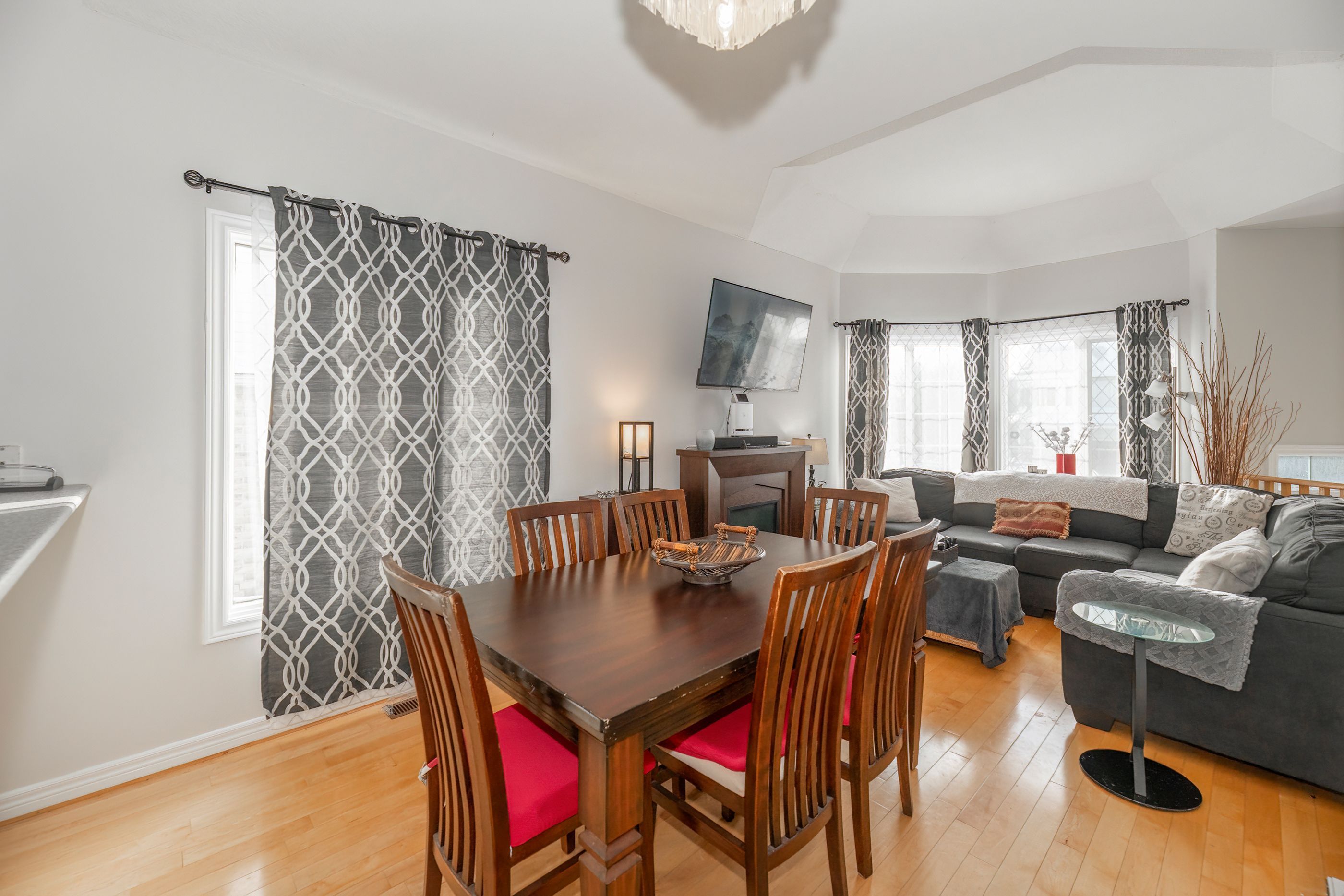 • Bright, open-concept living area with vaulted ceilings and hardwood floors.