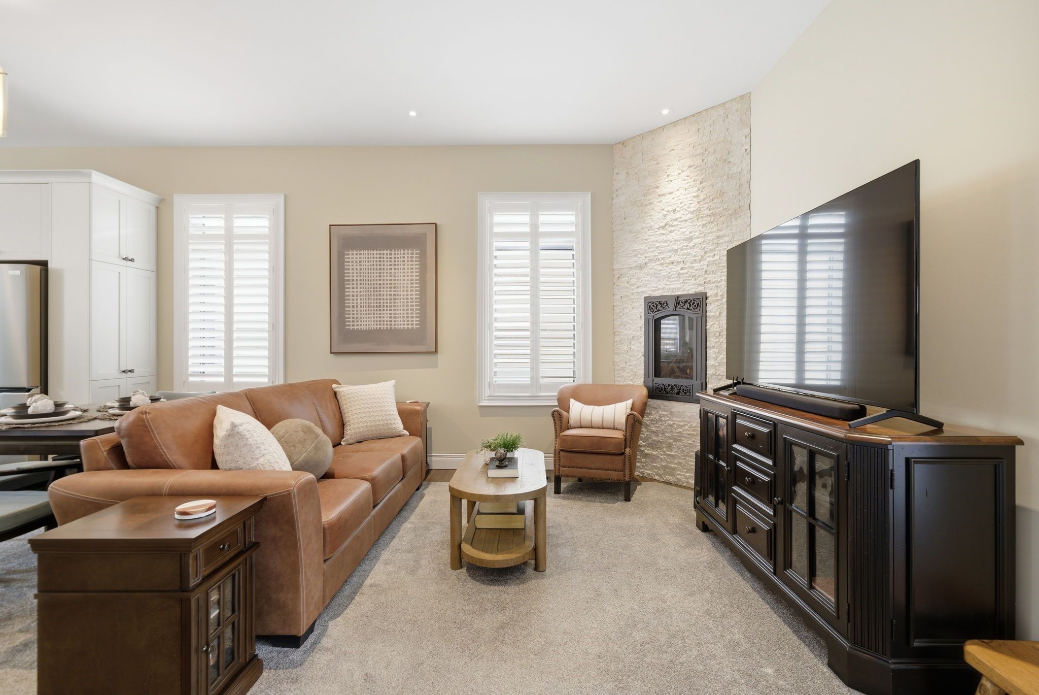 • Bright open-concept space with 10-ft ceilings and cozy natural gas fireplace.