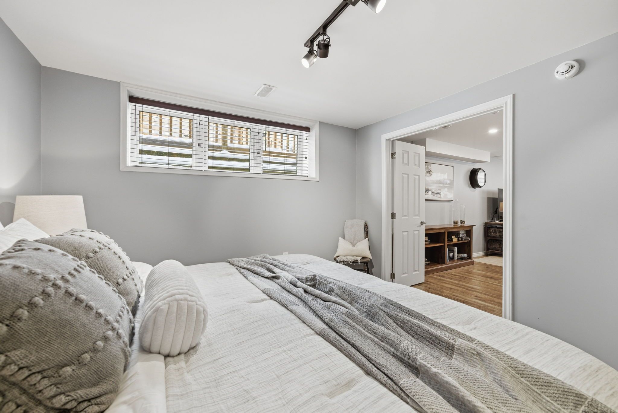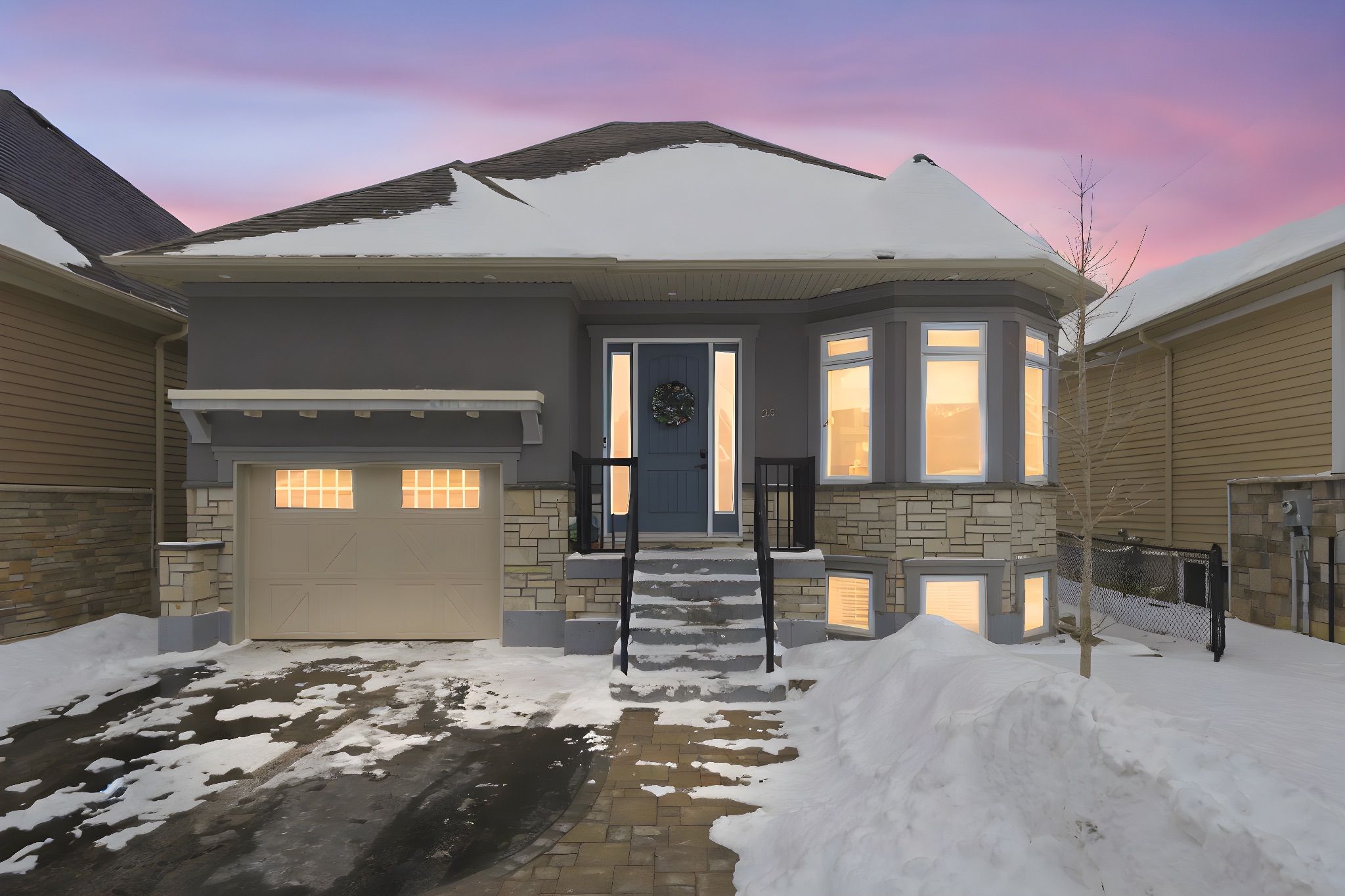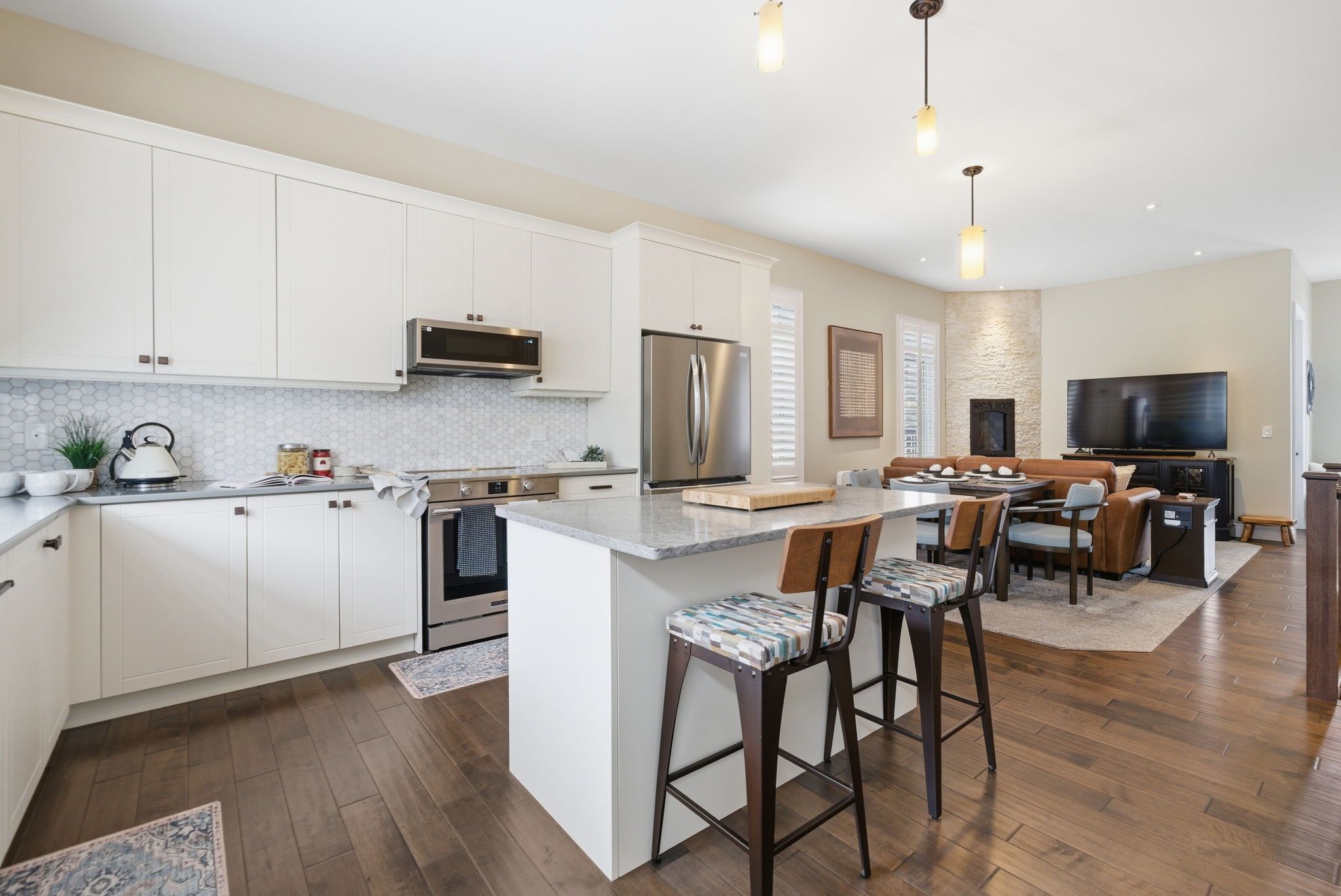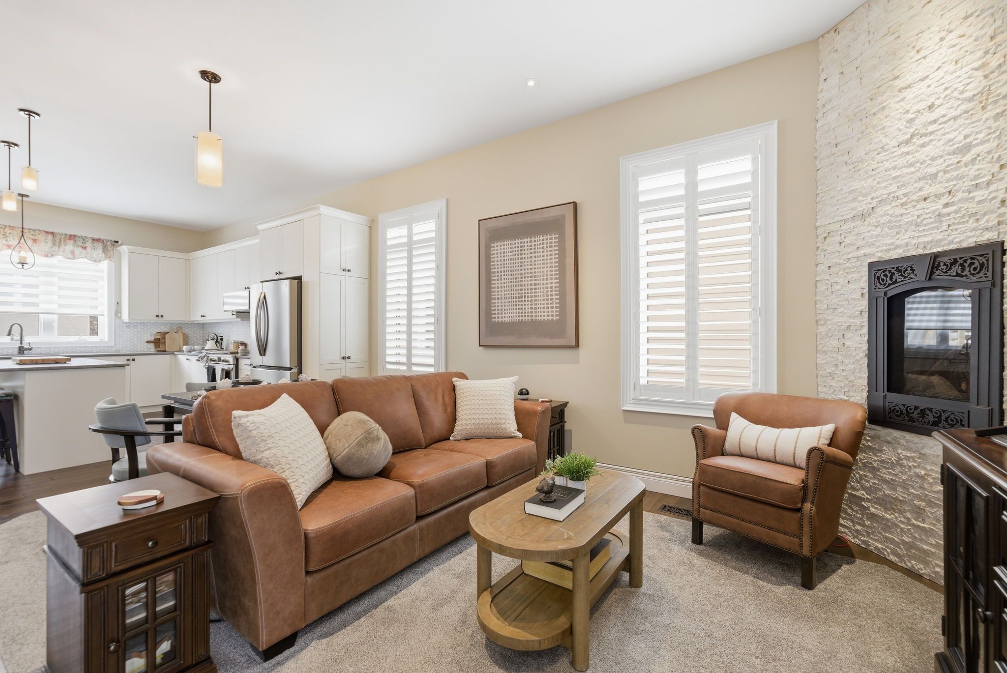For those looking to downsize without compromise, this upgraded home at life at lock 19 checks every box. The work is done, the upgrades are in place, and the lifestyle is exactly what easy living should feel like. Curb appeal welcomes you with upgraded front blockwork, driveway pavers, with parking for two this is perfect. Inside, soaring 10-ft ceilings, neutral tones, upgraded light fixtures, and pot lighting throughout create a bright, modern space. The open-concept living, dining, and kitchen area is designed for comfort and connection, anchored by a natural gas fireplace with striking stone fascia. The kitchen features quartz countertops, an island with seating, upgraded cabinetry with crown moulding, slide-out drawers, and undermount lighting. A walk-out to the deck makes morning coffee or summer evenings outside effortless. A custom coffee and wine bar with sink and brickwork backsplash adds a unique touch. The primary suite offers a relaxing retreat with custom closets and a spa-inspired ensuite with quartz counters and an upgraded tiled shower. The finished lower level extends the living space with a second gas fireplace, a 3 piece bathroom with heated floors, a full laundry room, and a generous sized bedroom. With smart-home features, custom window treatment, a wifi thermostat, wifi garage door, and extra storage in the garage loft, this thoughtfully upgraded home delivers comfort, convenience, and truly easy living.