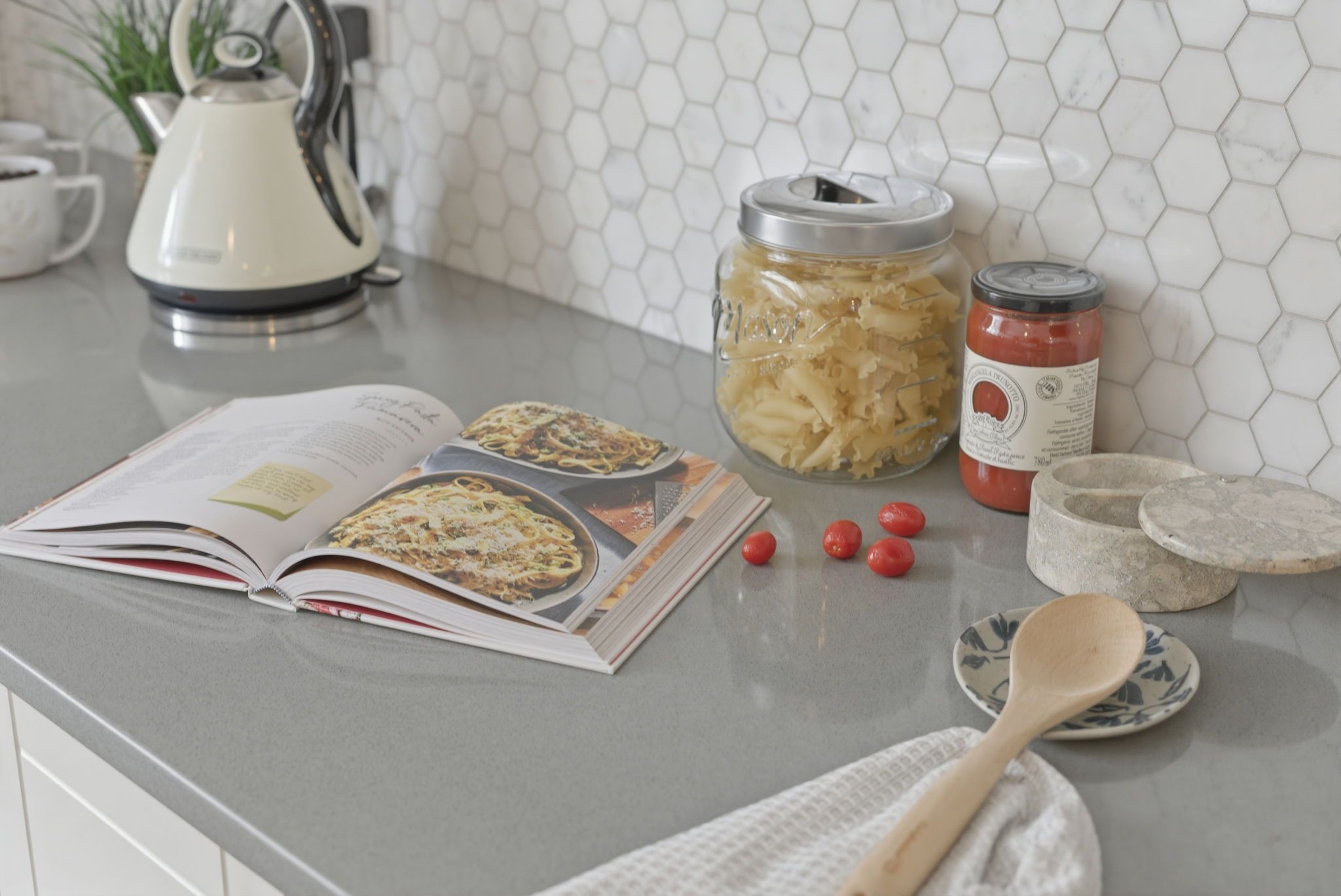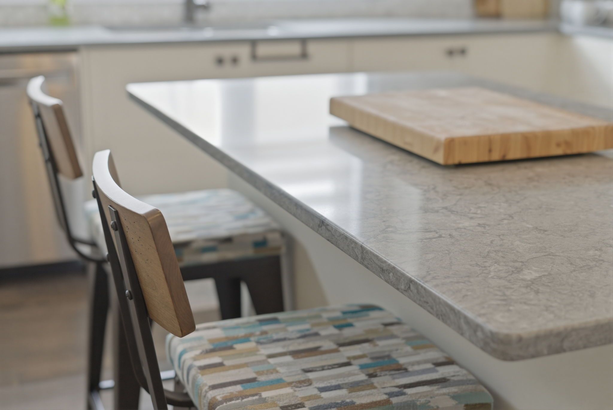 • Gourmet kitchen features quartz countertops and a custom coffee and wine bar.