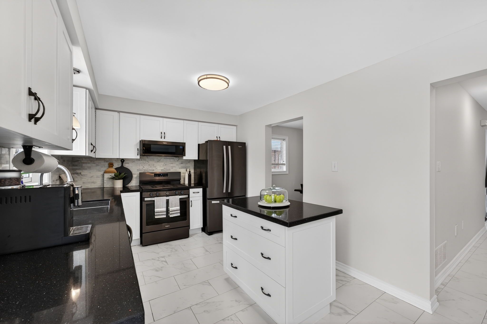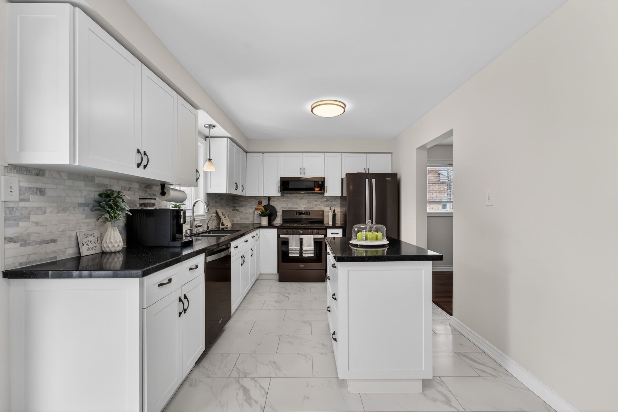 • Bright eat-in kitchen with island, stone countertops, and gas stove.