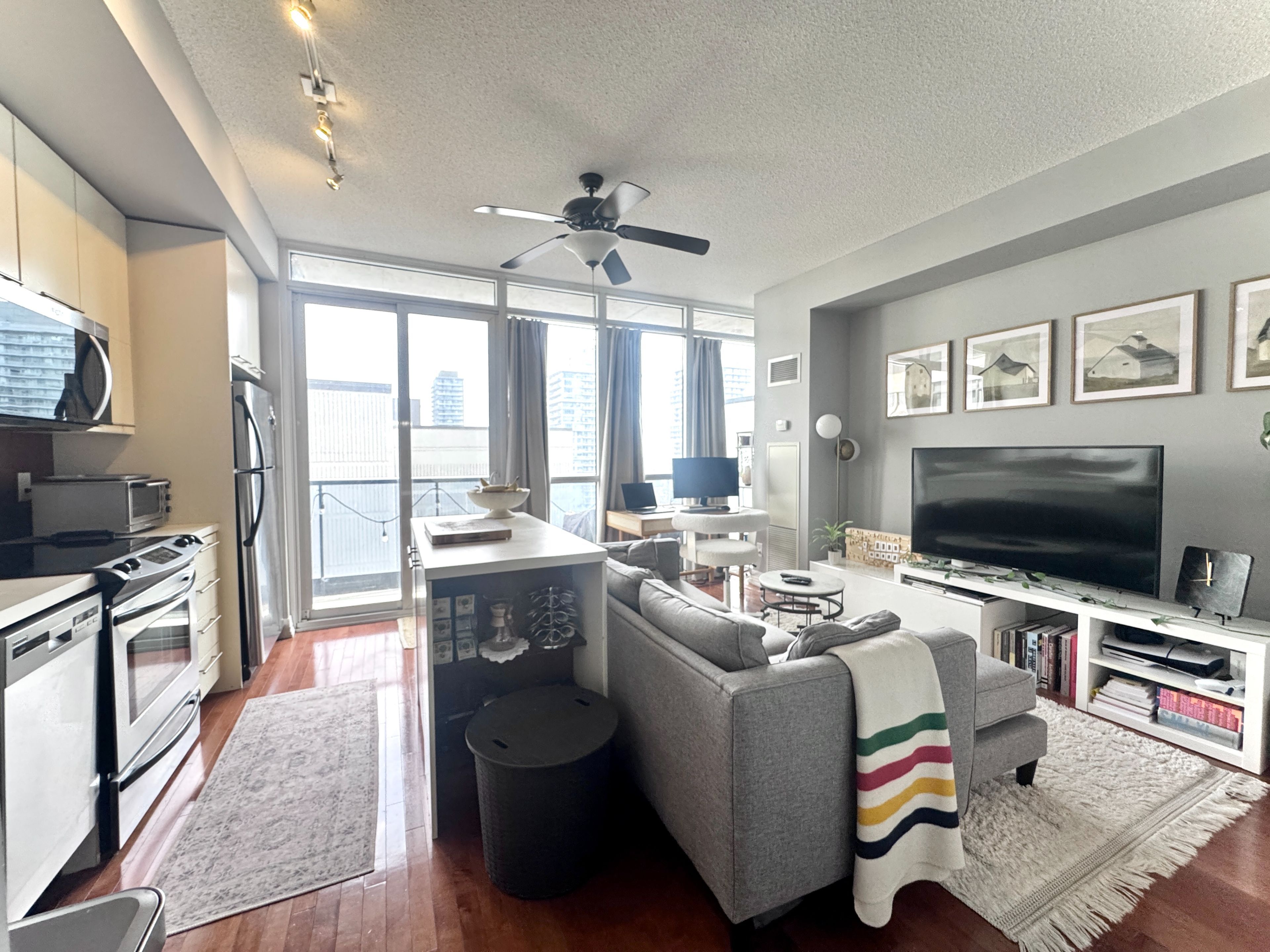 Enjoy carefree living in this professionally managed one bedroom, one bathroom condo centrally located in the heart of downtown w/ panoramic city views. This sophisticated unit boasts hardwood floors in main area, open concept designer kitchen w/centre island, s/s appliances, full access to excellent building amenities & located close to ttc & subway. **appliances: fridge, stove, b/i microwave, dishwasher, washer and dryer **utilities: heat & water included, hydro extra
