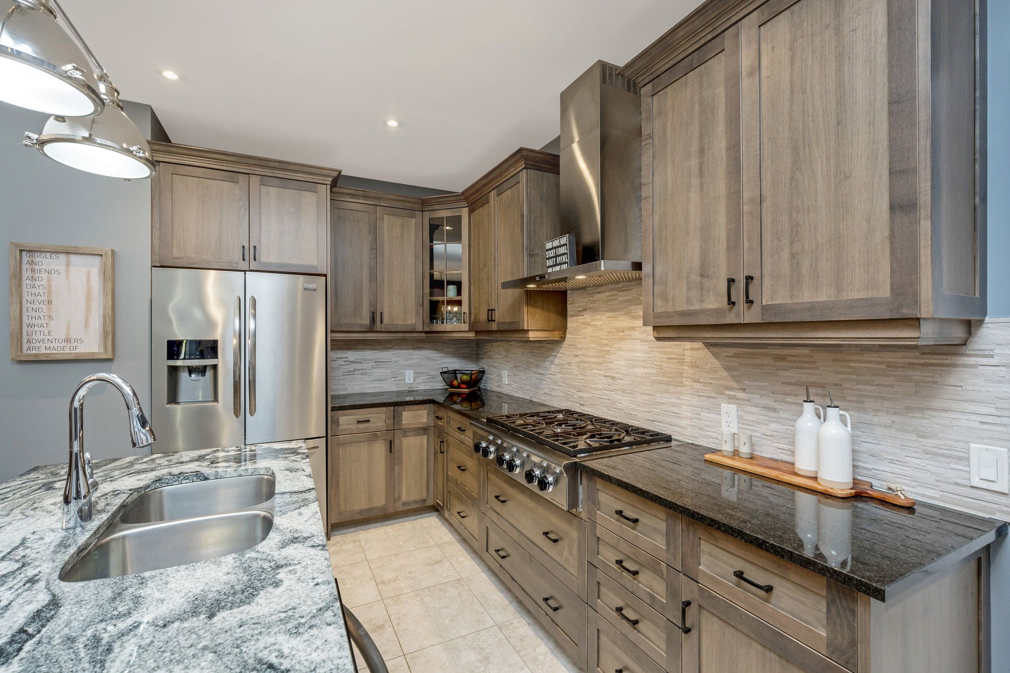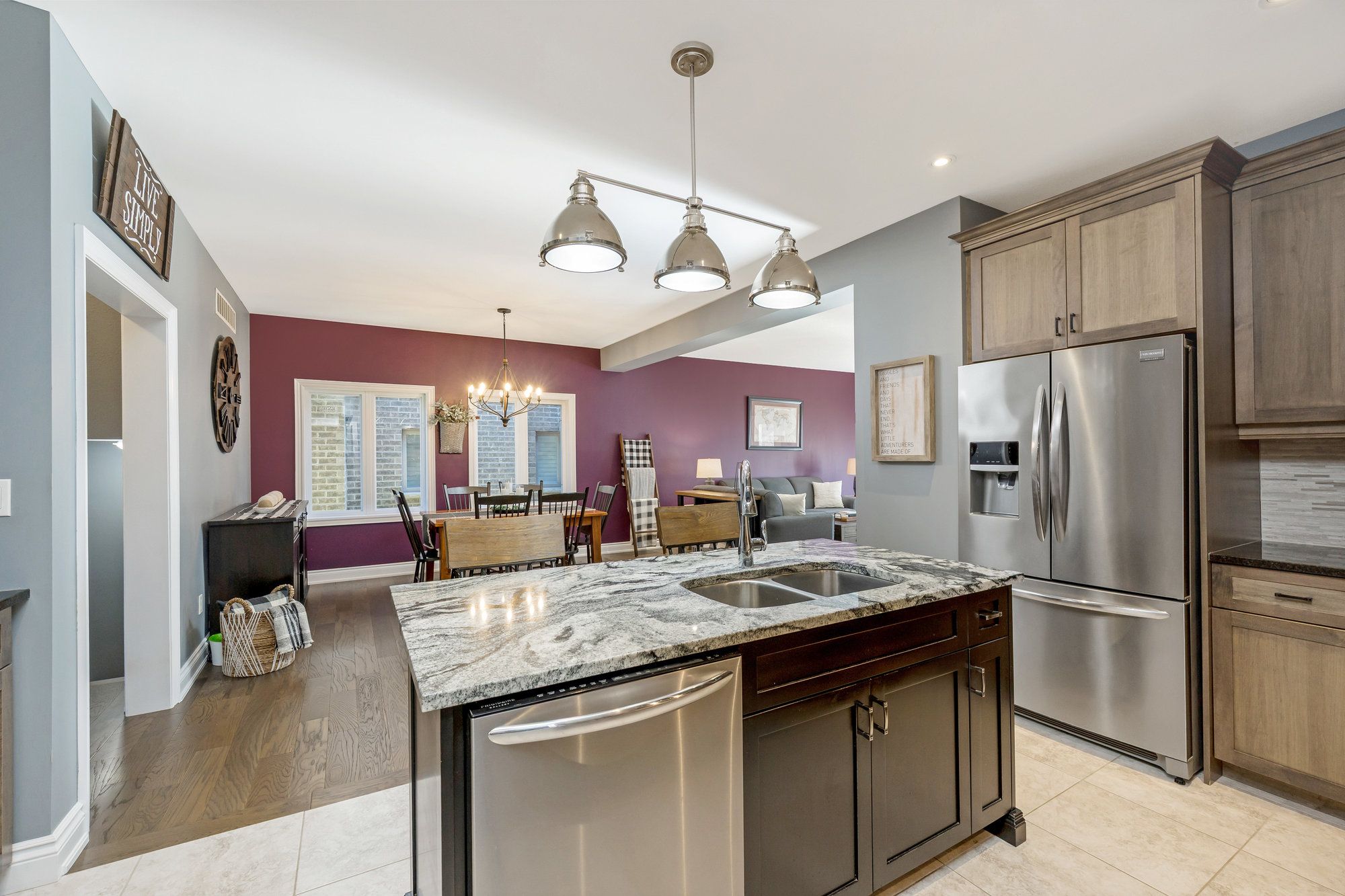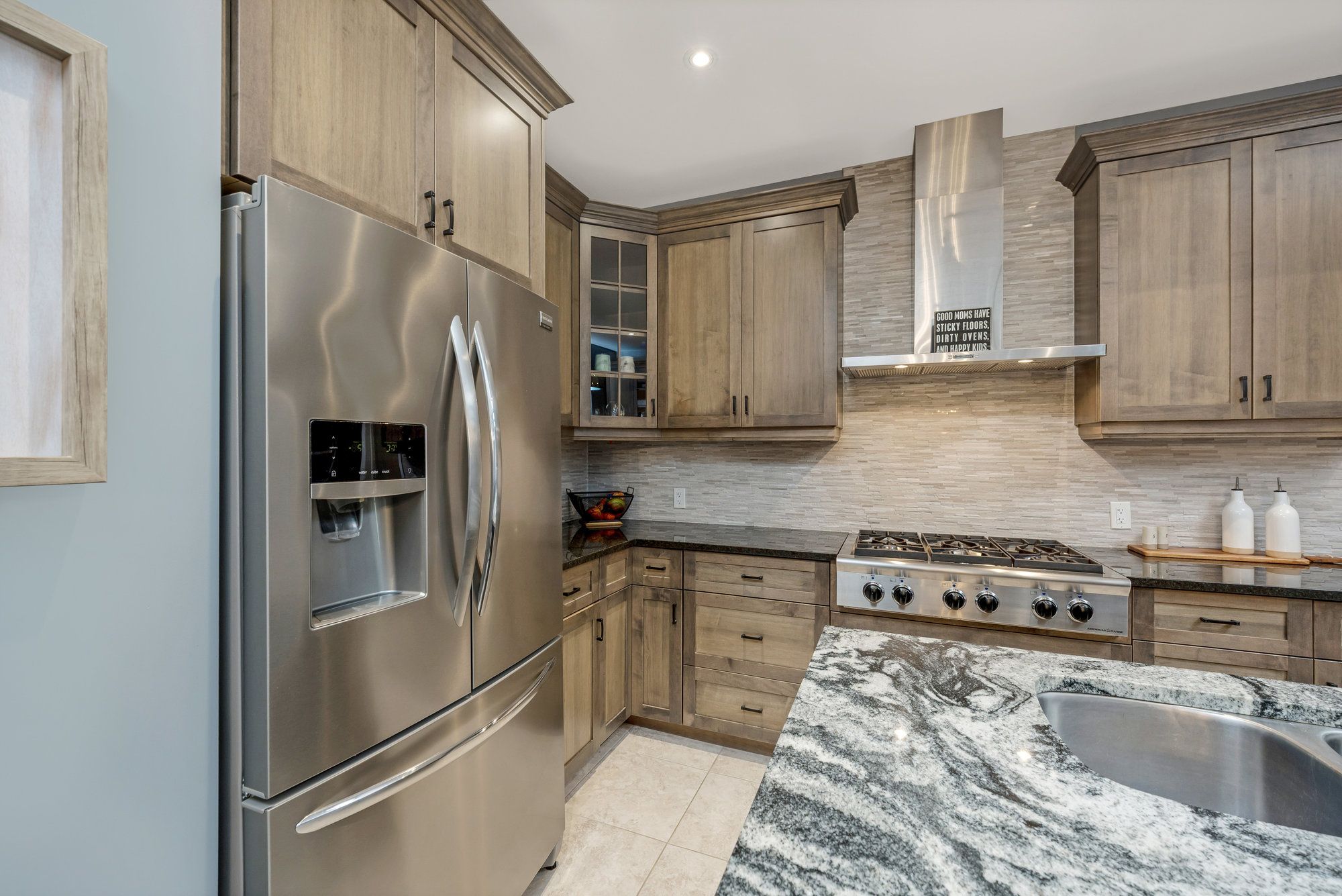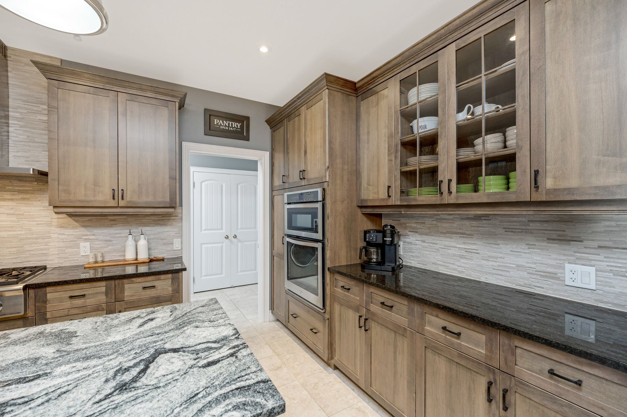 • Modern kitchen featuring granite counters and stainless steel appliances.
