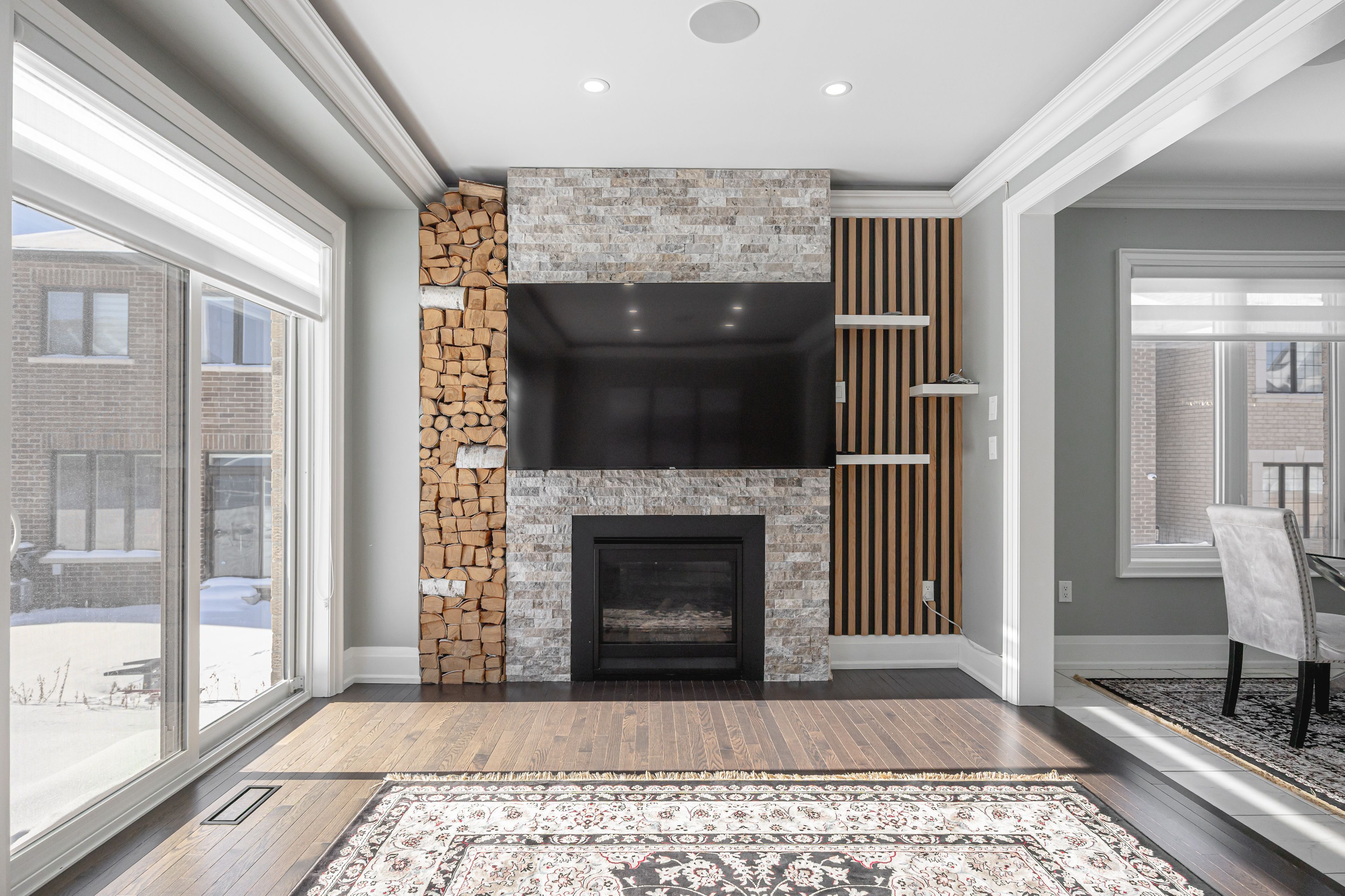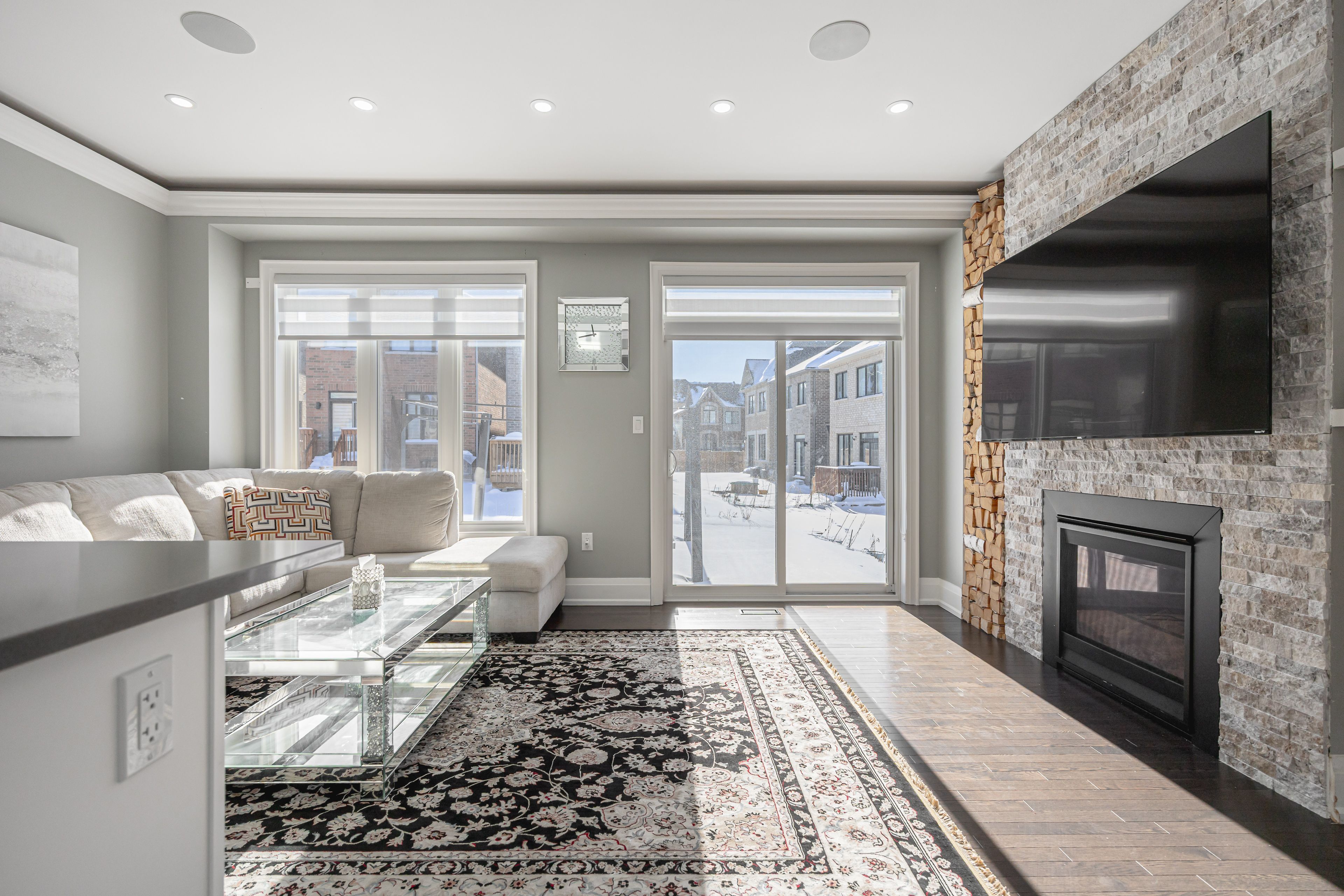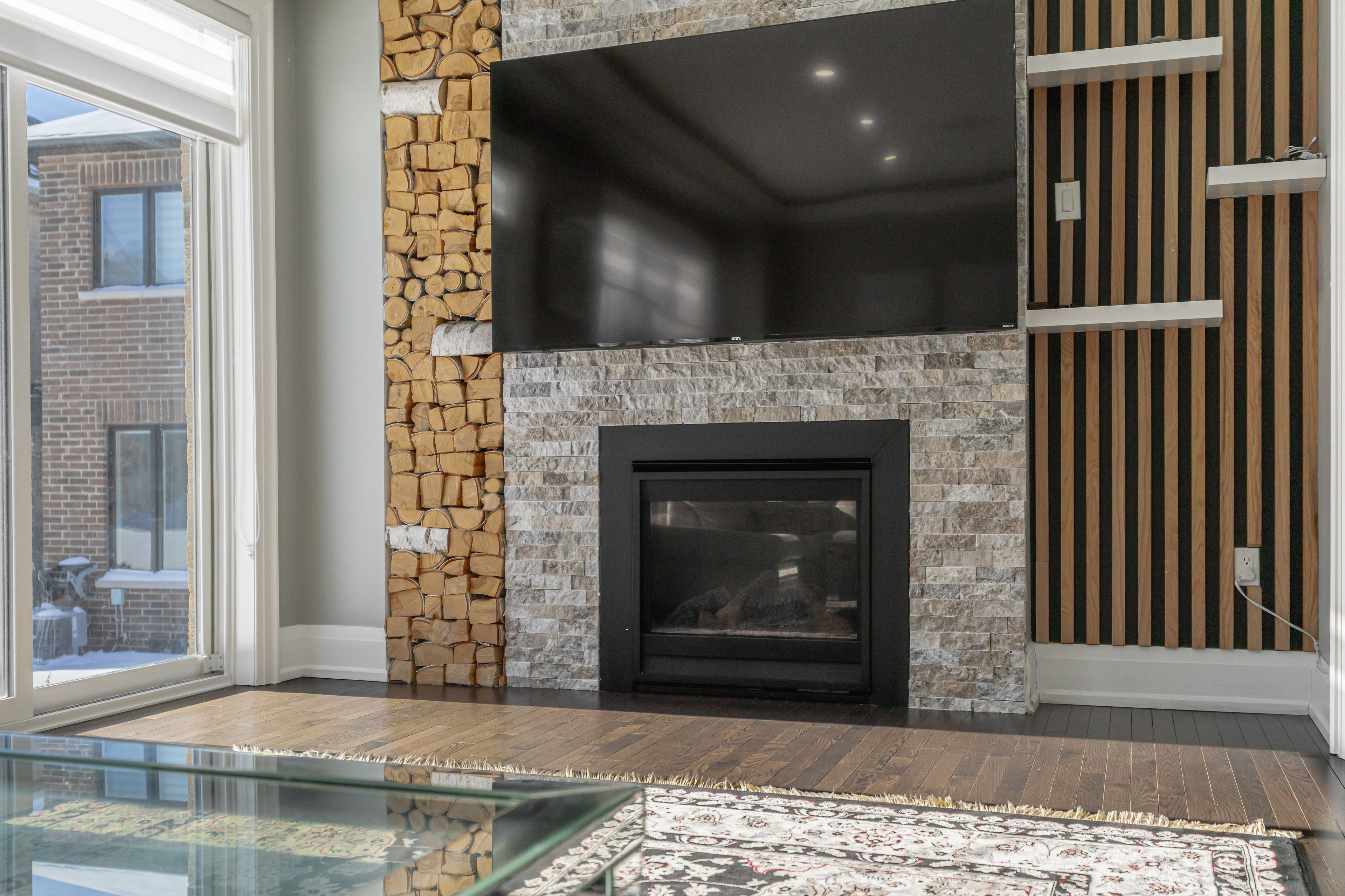 • Bright layout with 9-foot ceilings and a cozy gas fireplace.