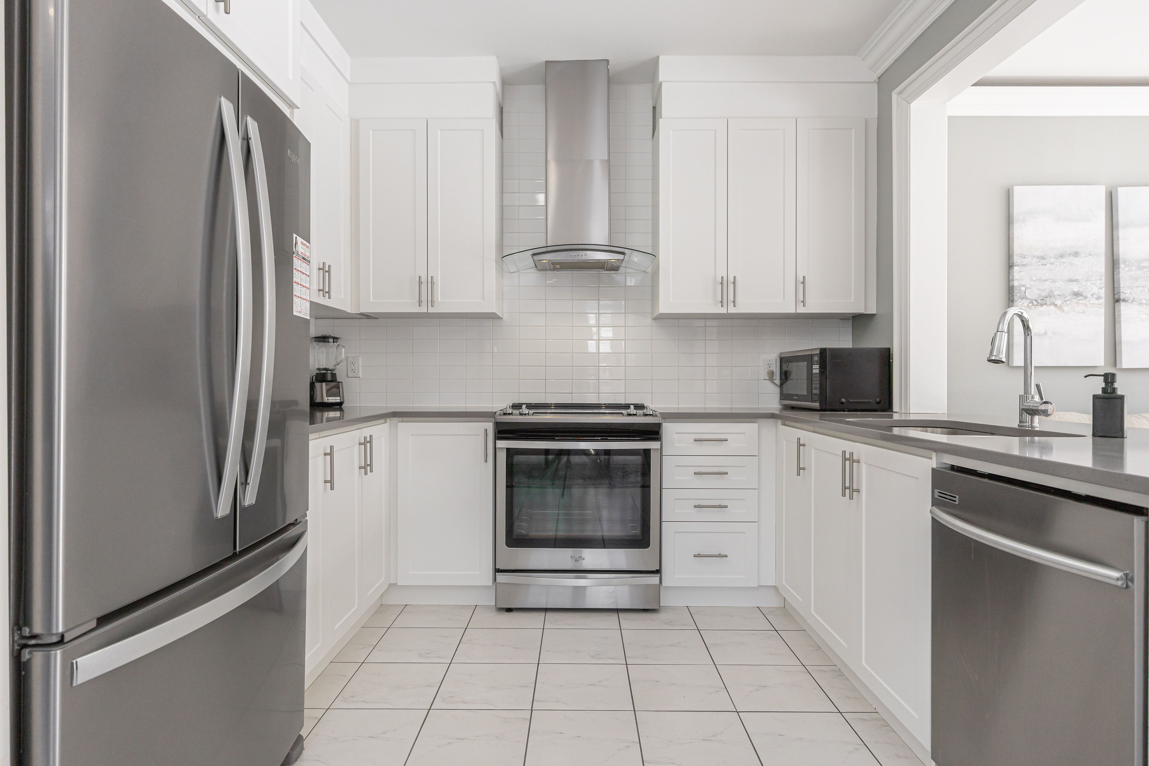 • Upgraded kitchen featuring quartz countertops and stainless steel appliances.