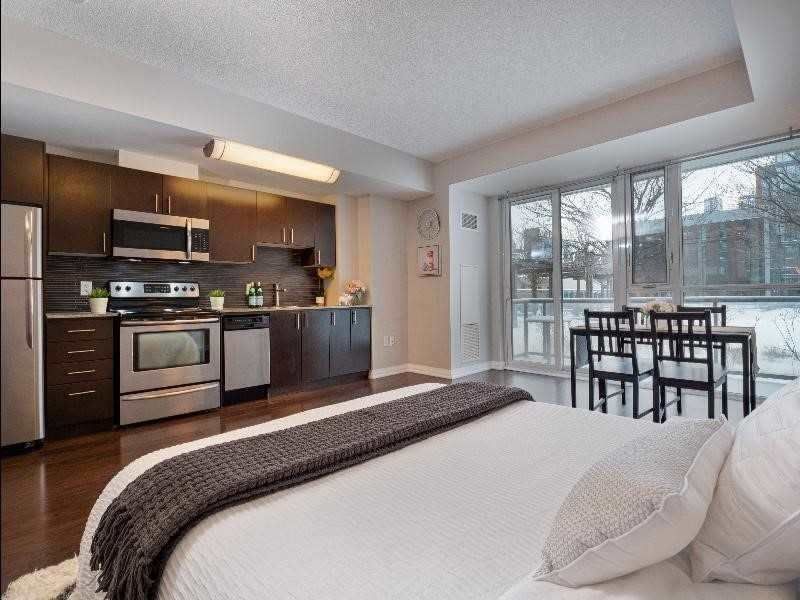 Client remks: bright and spacious studio 455 sq. Ft. + 81 sq. Ft (terrace) in immaculate condition. Balcony with sun-filled west exposure located at the heart of regent park. 9' ceiling, floor to ceiling windows with views of beautiful rooftop garden. Tasteful finishes: stainless steel appliances, granite kitchen countertop, premium laminate flooring, large closet. Steps away from public transportation, groceries, bank, restaurants, park and community centre.
