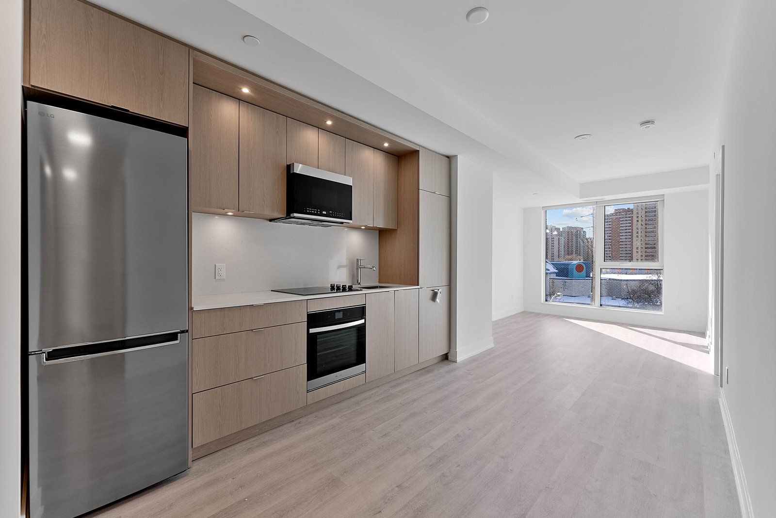 • Open concept kitchen with built-in appliances and storage options.