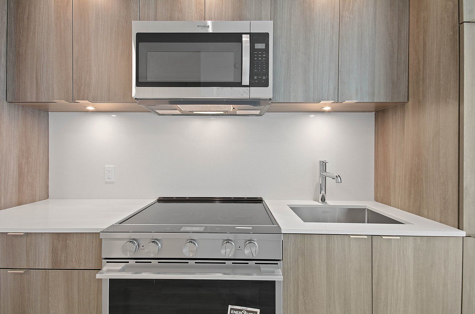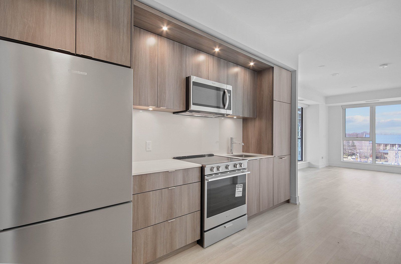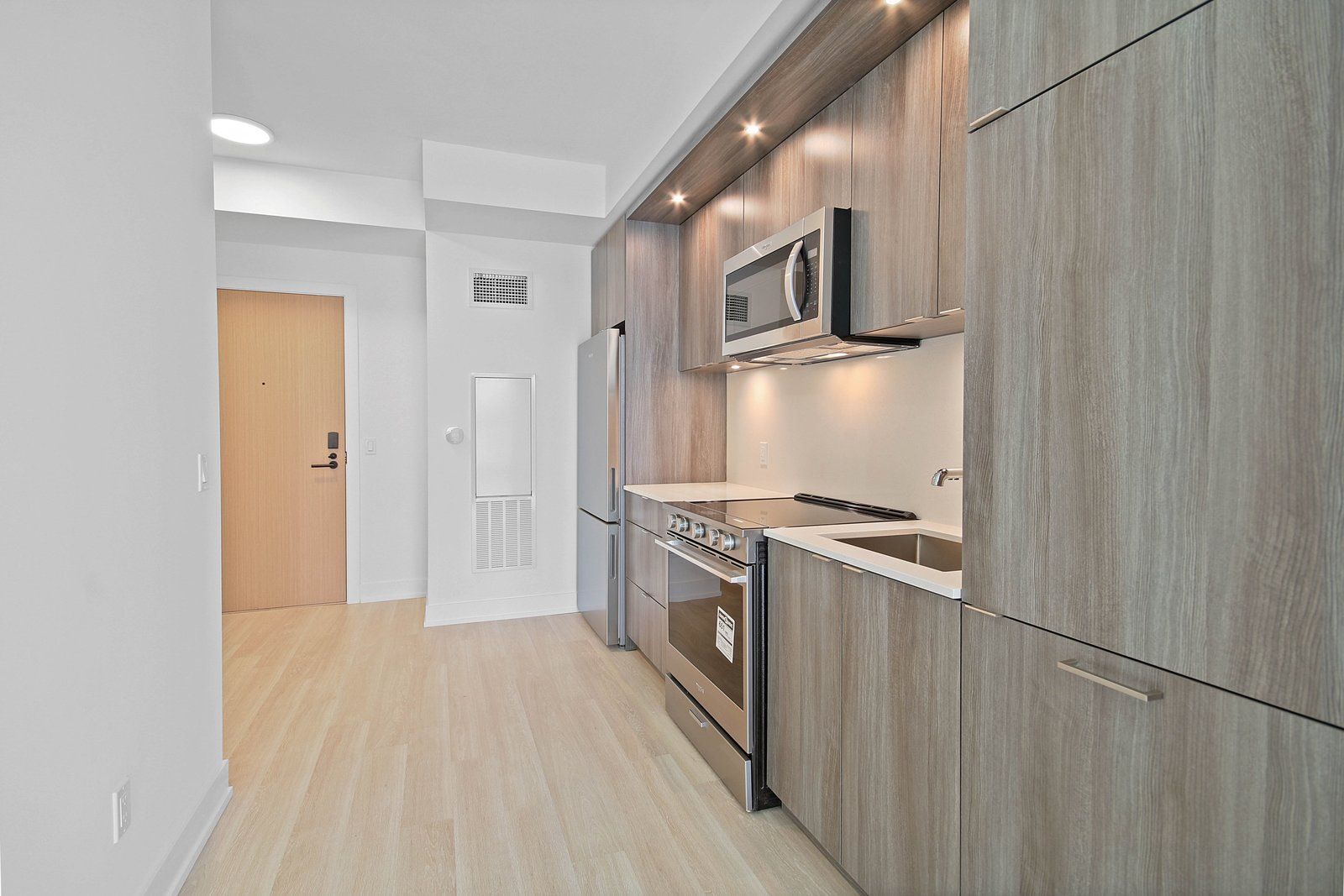 • Modern kitchen features tall cabinets, large appliances, and stone counters.