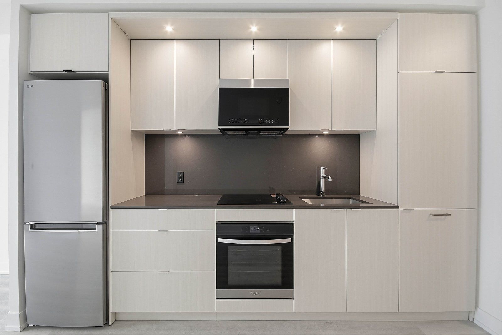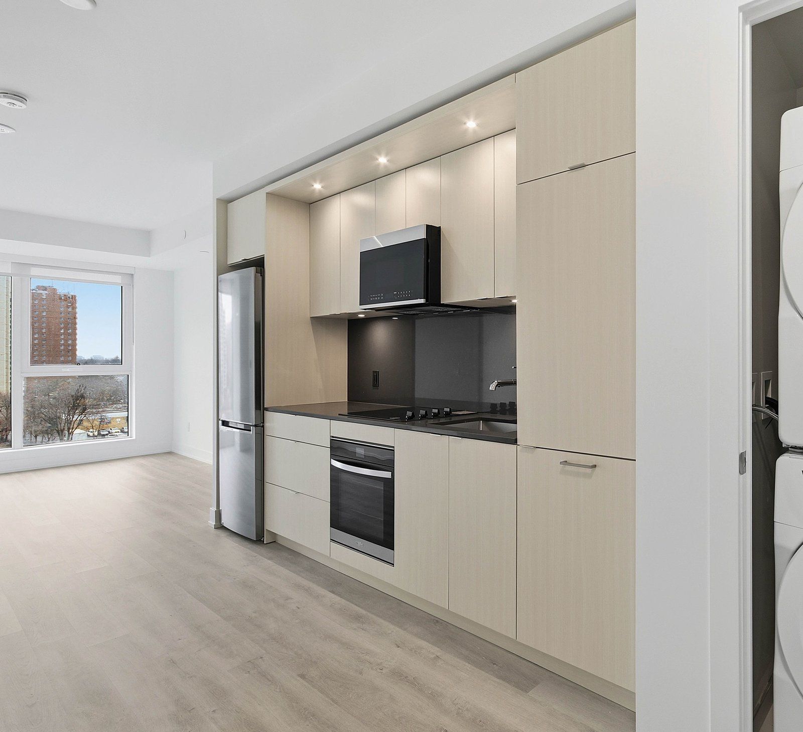 • Open concept kitchen with ample storage and modern stainless steel appliances.