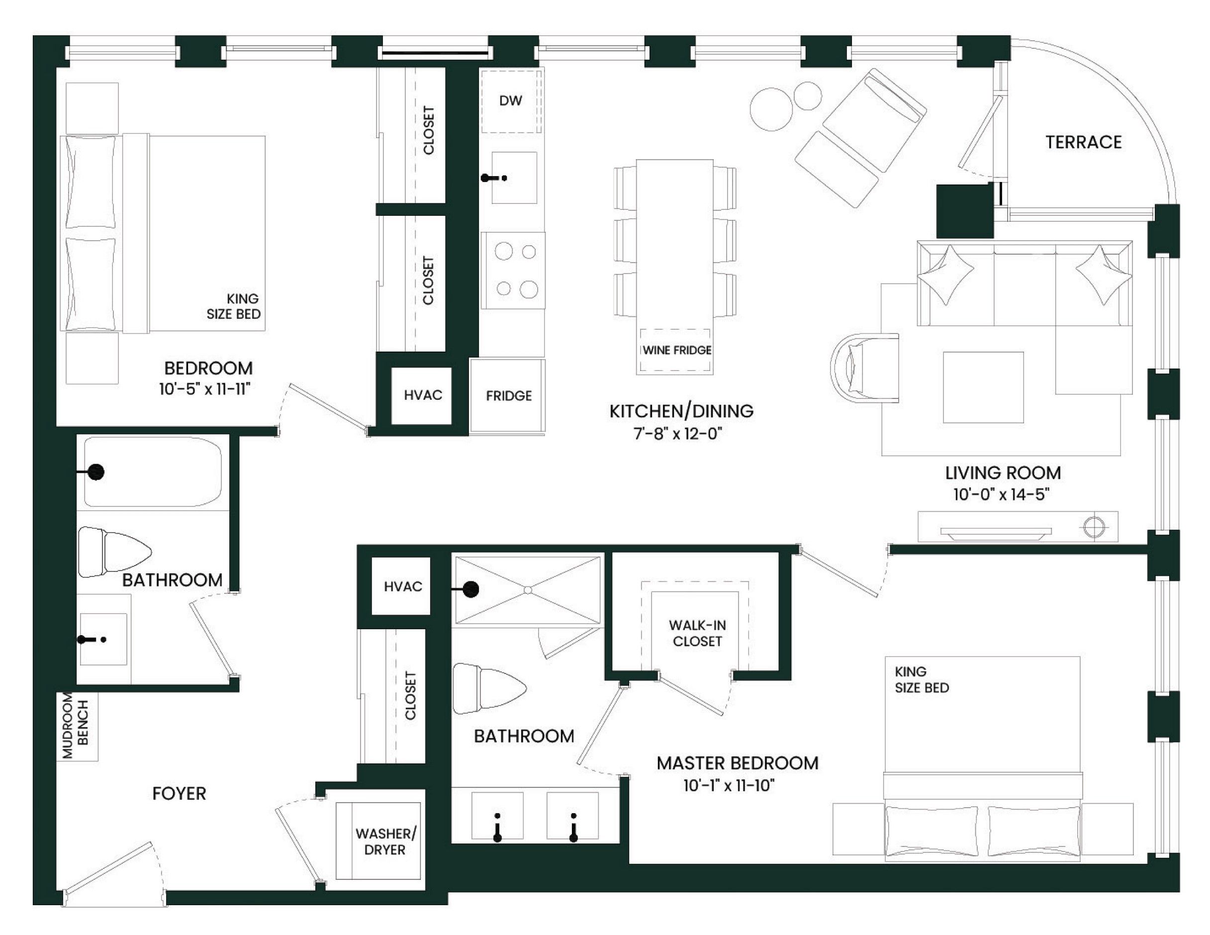 • Luxury one-bedroom unit with quartz countertops and 9' ceilings.
