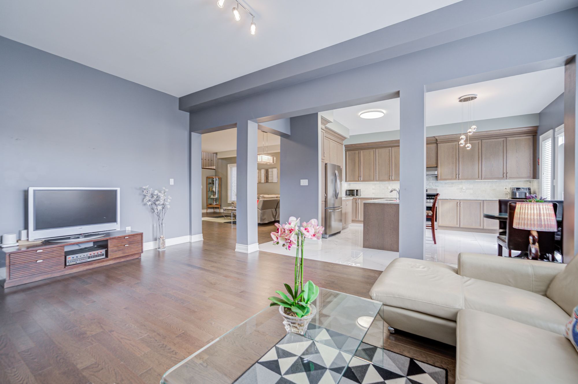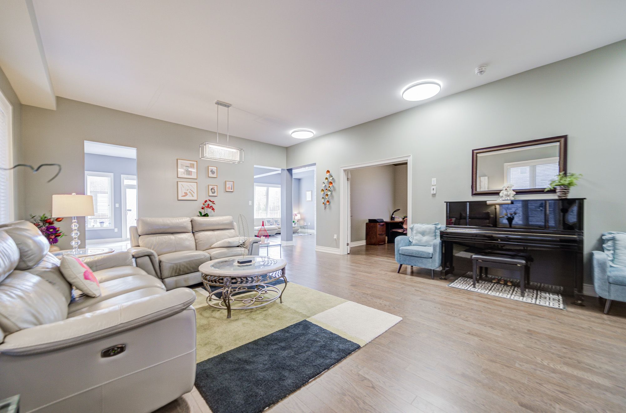 Welcome to your spectacular smart dream home in the desirable sharon community! Nestled on a quiet street, this luxurious residence offers over 3,600 sq. Ft. Of elegant living space above ground. Featuring 4 spacious bedrooms and 5 baths, this home combines modern comfort with timeless sophistication. Step into grandeur with soaring 10 ft ceilings on the main and 9ft ceilings on the 2/f, creating a bright, airy and open atmosphere. The gourmet chef's kitchen is a true showpiece- complete with custom cabinetry, full backsplash, high performance range hood, gas stove, and a large centre island, ideal for both cooking and entertaining. Enjoy the warmth of the cozy family room with a fireplace, or host guests in the sun filled living room with its dramatic high ceilings. The main floor office enclosed by elegant french doors and the 2/f sitting area offer flexibility perfect as potential 5th or 6th bedrooms. Upstairs, you'll find 4 generously sized bedrooms, all with hardwood flooring, the primary master features a large walk in closet and a spa like 5 pcs ensuite. A unique separate entrance provides exciting potential for a future in law or income opportunity. Located in a prime sharon location, just mins to hwy 404, go train, public transit, upper canada mall and all amenities.