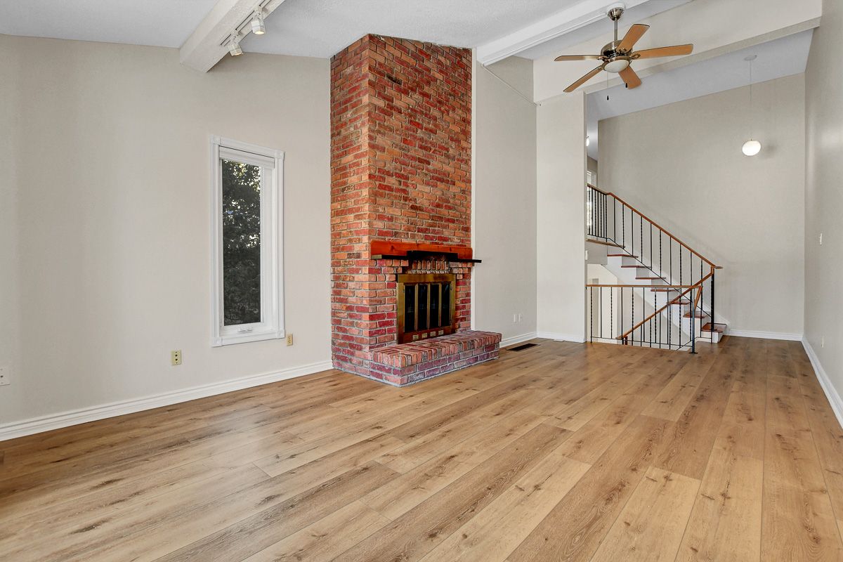 • Bright second-floor family room with vaulted ceiling and fireplace.