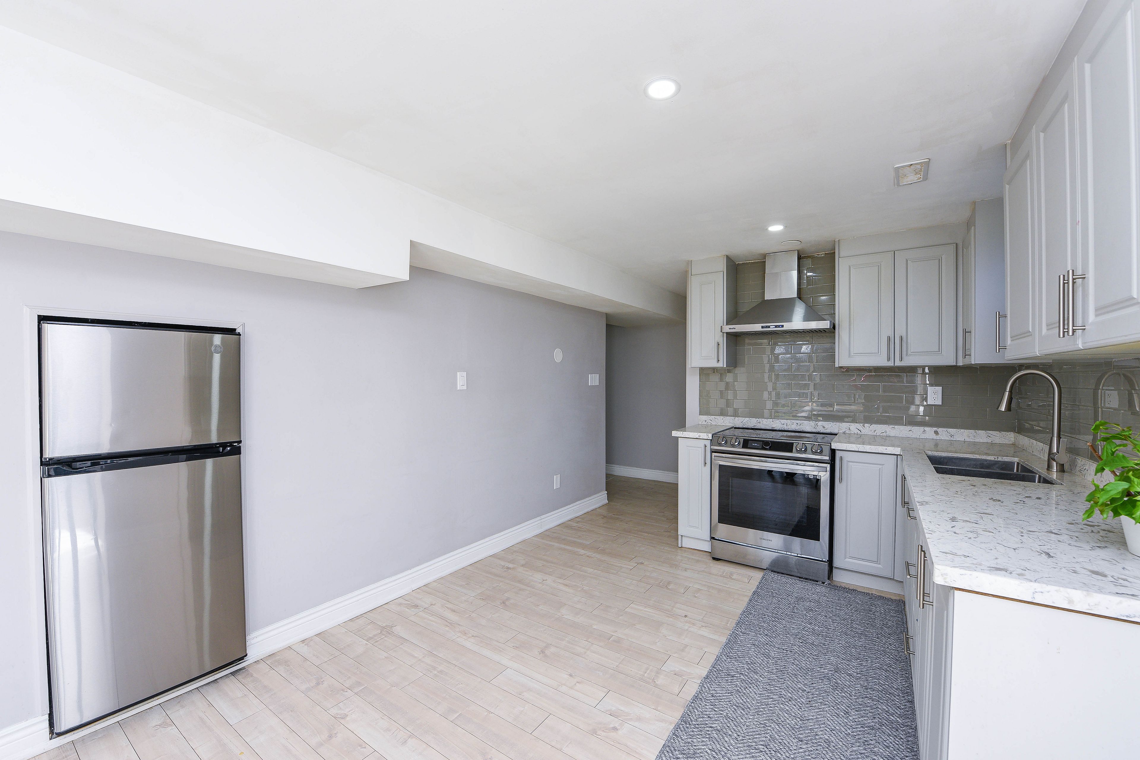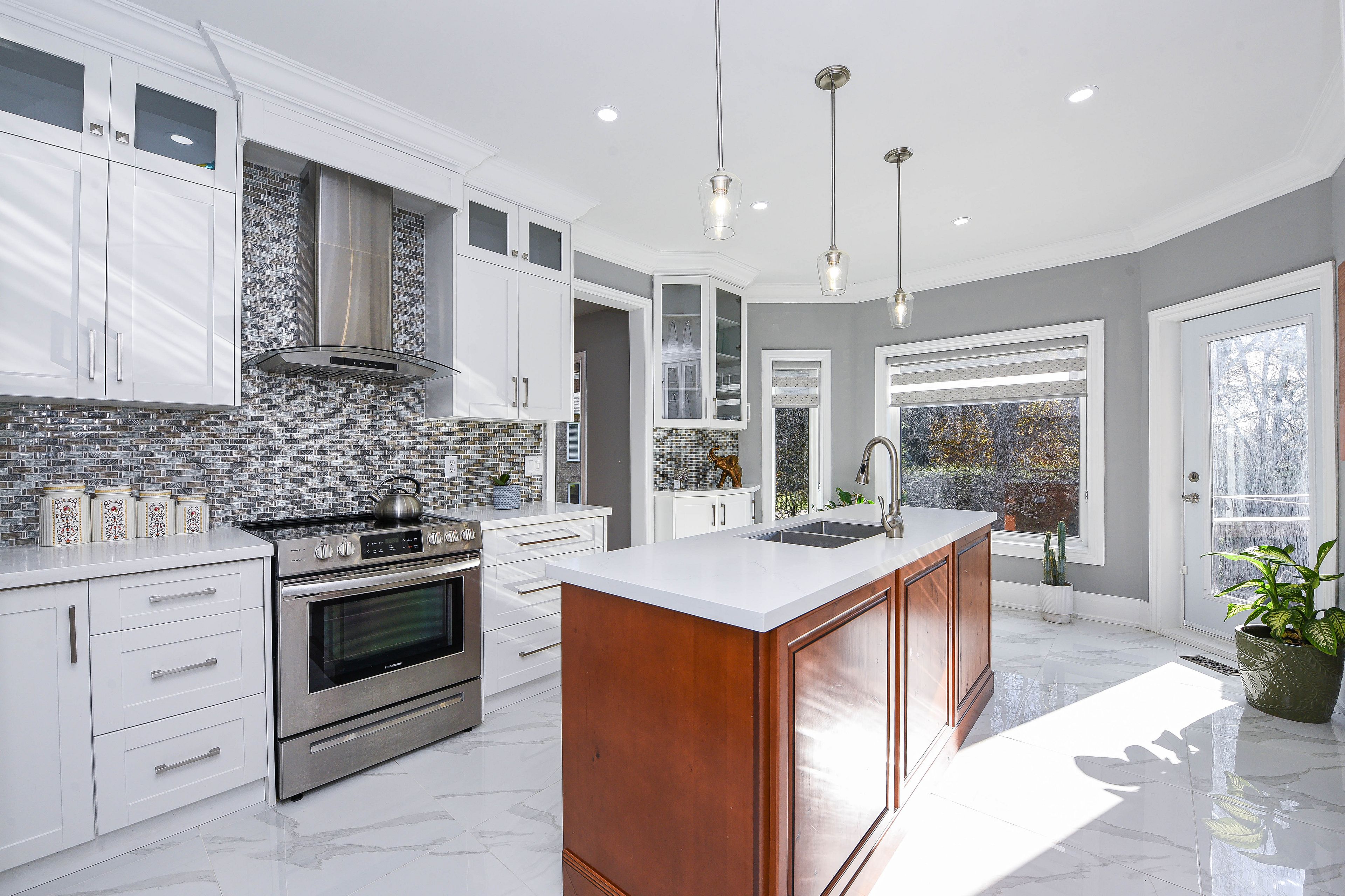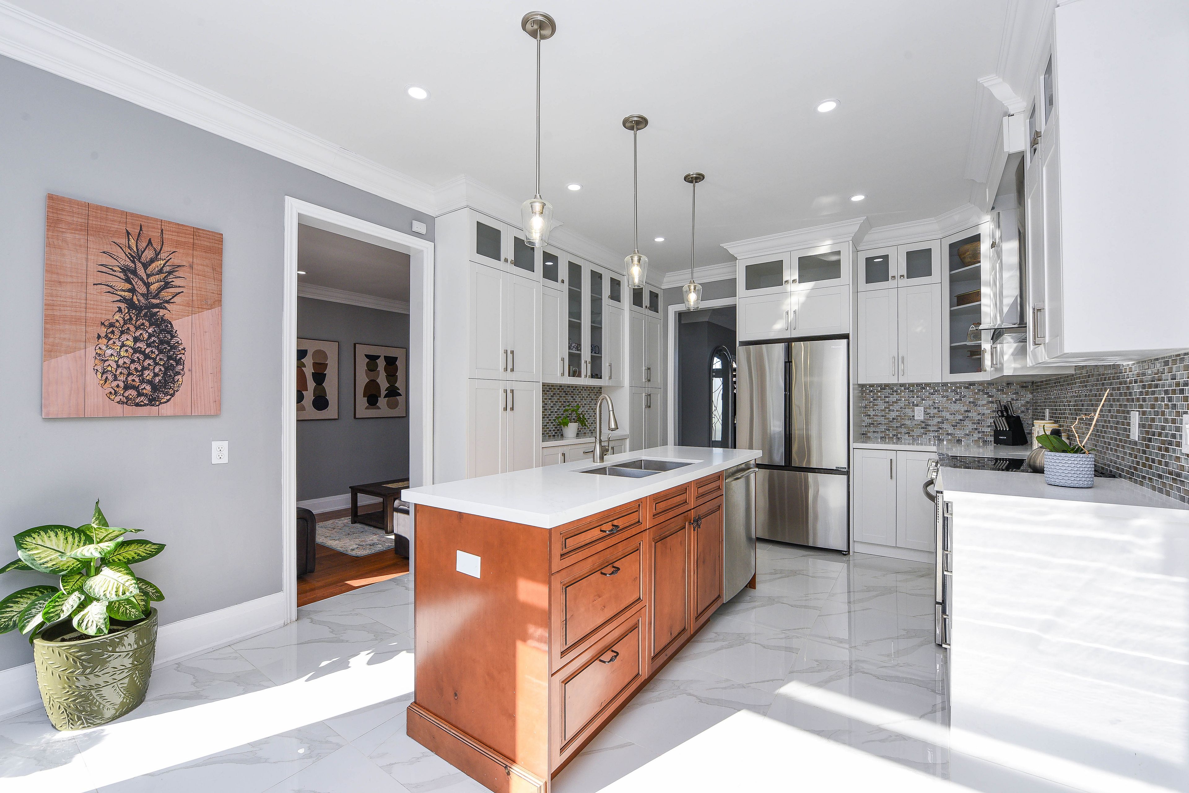 • Large eat-in kitchen with center island and quartz countertops.