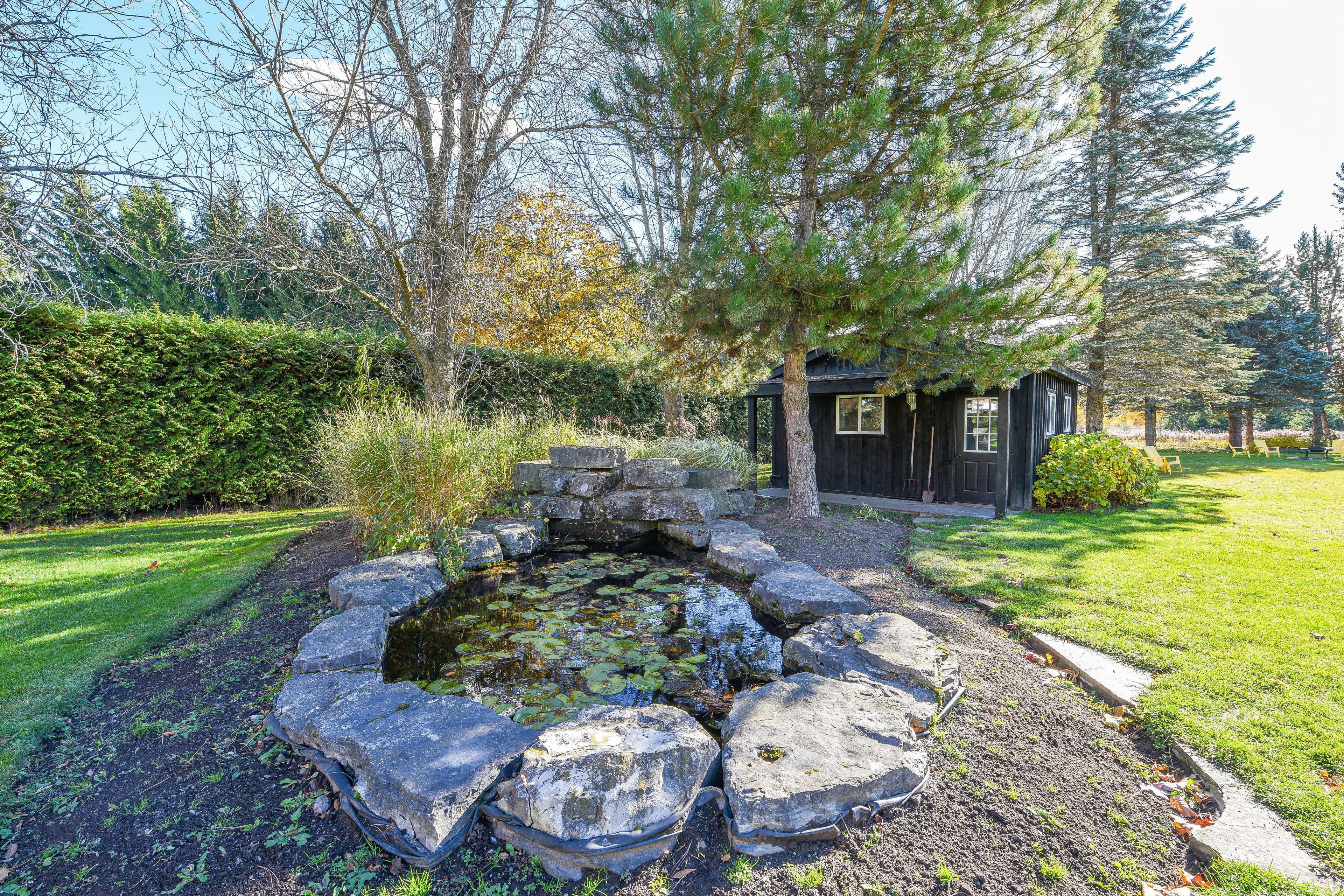 • Tranquil outdoor space with a lily pond, waterfall, and entertaining areas.