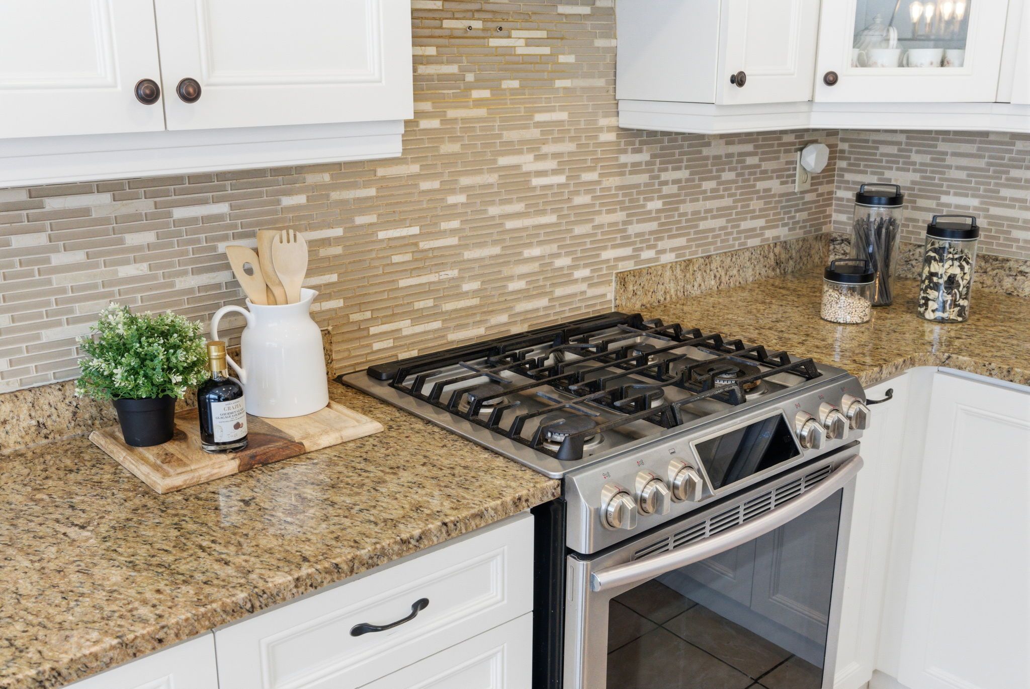 • Well-appointed kitchen features granite countertops and a breakfast area with deck access.