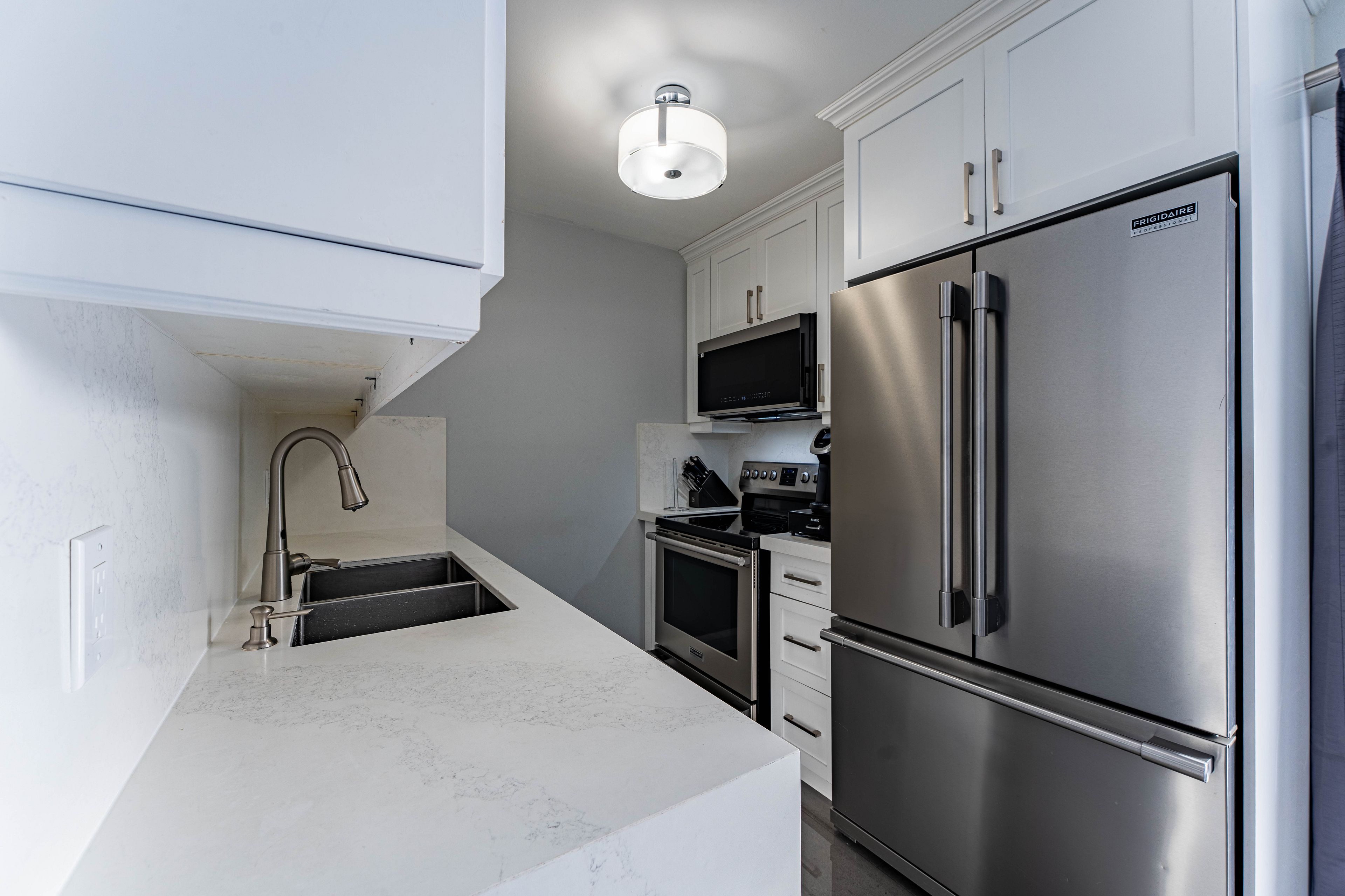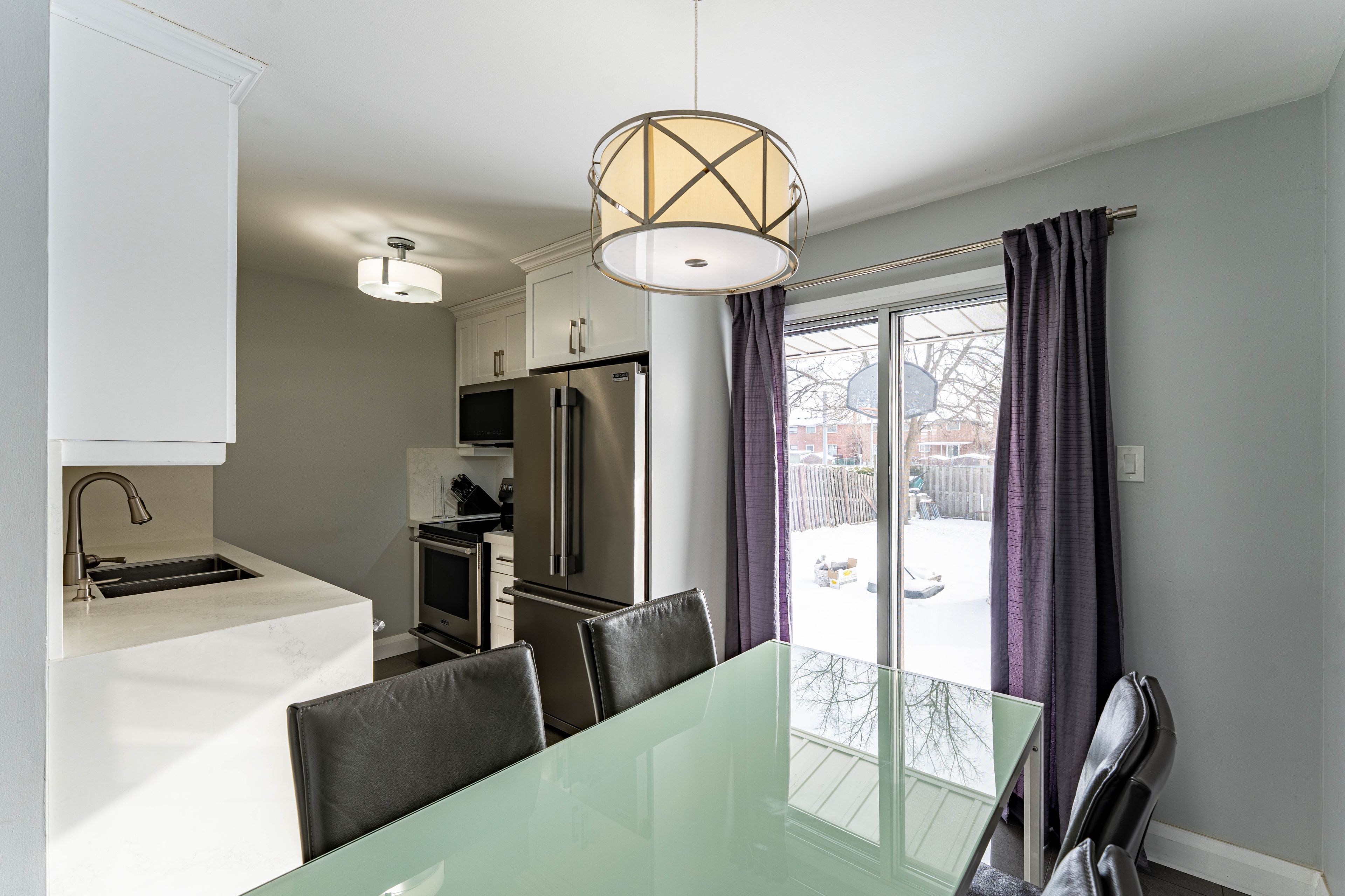 • Updated kitchen featuring stone counters and stainless steel appliances.