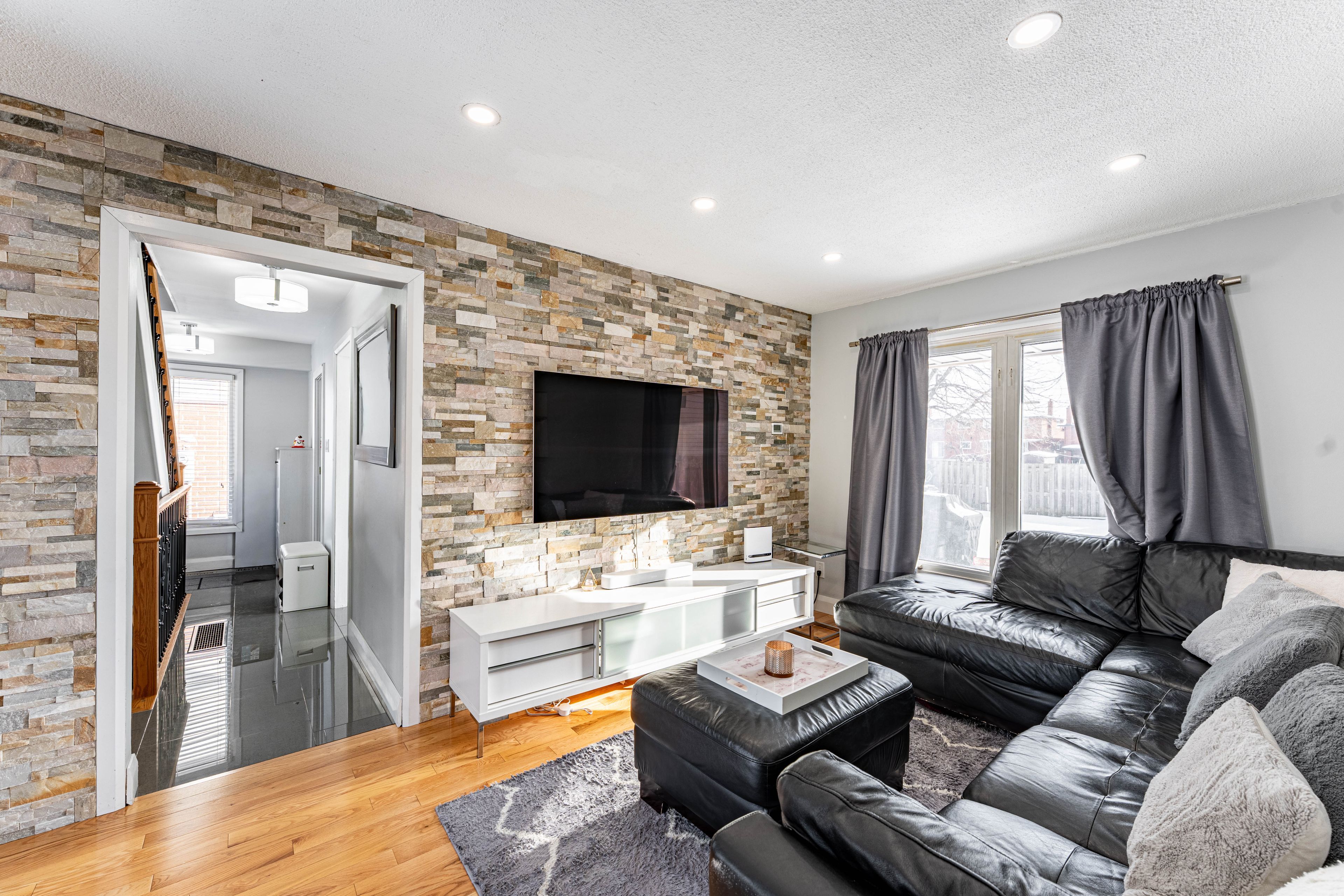 • Large private backyard with stone work, great for summer BBQs.