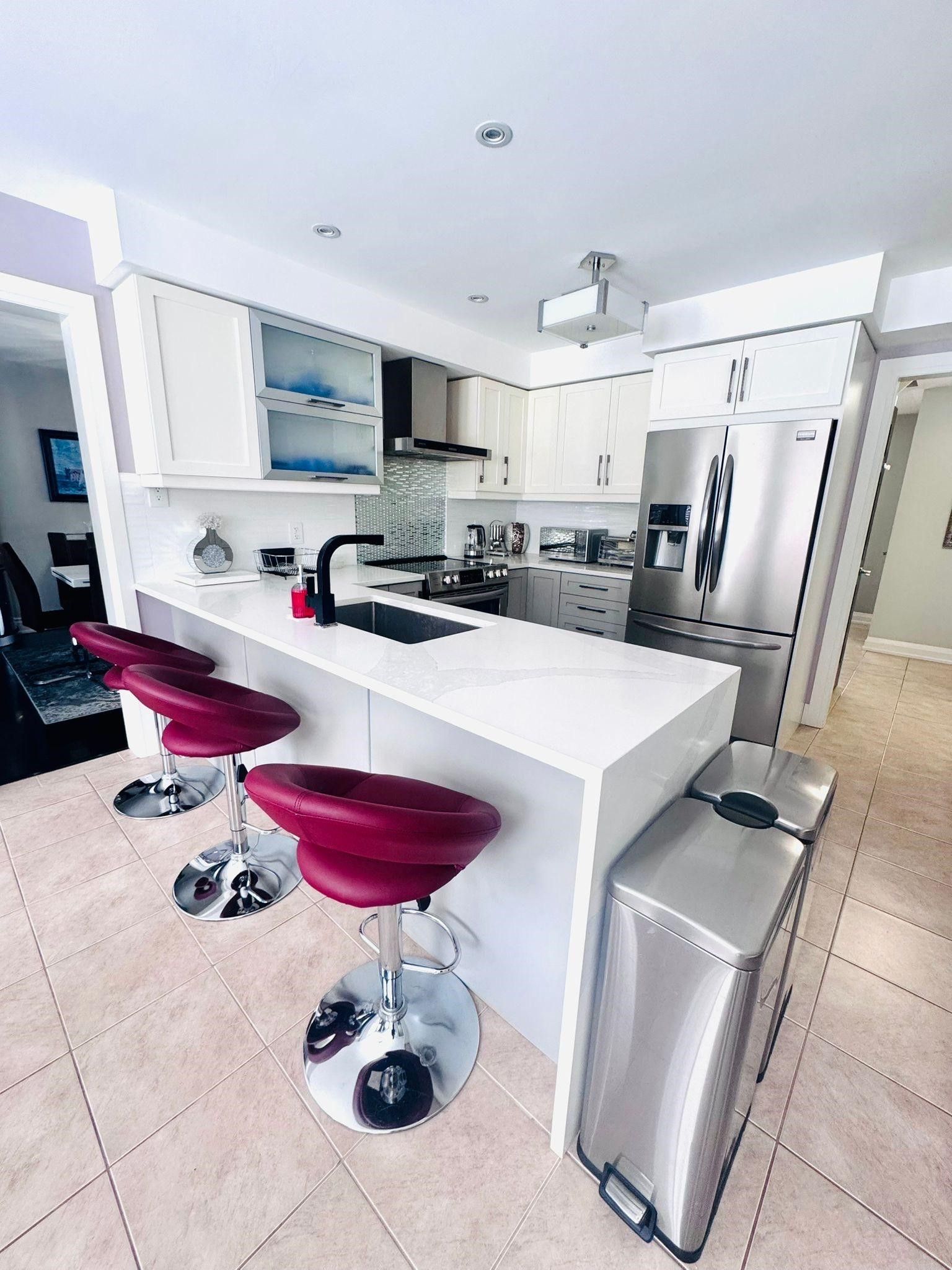 • Renovated kitchen with quartz counters and stainless steel appliances.