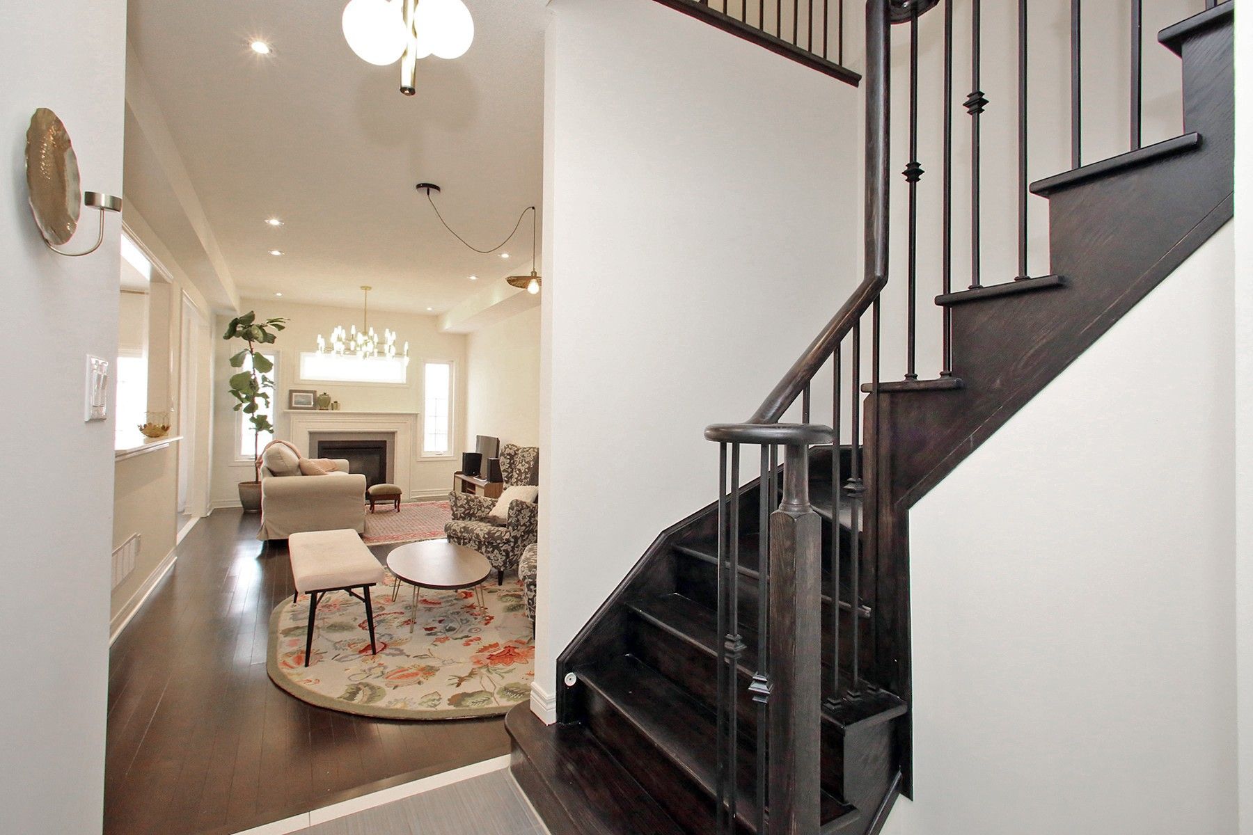 Welcome to this modern john boddy homes built freehold townhome (no maintenance fees and no sidewalk to shovel), offering approx. 1,700 sq ft of stylish living space and built less than 5 years ago. A spacious foyer with inside garage access leads to a bright open-concept main floor featuring an eat-in kitchen with ceramic flooring, granite countertops, stainless steel appliances, pantry and ample cabinetry, with walk-out to a private fenced yard. The main level is highlighted by a custom half-wall overlooking the dining and great room with a cozy gas fireplace and large windows, plus a convenient 2-piece powder room. Upstairs, the primary bedroom features a walk-in closet and 4-piece ensuite with double sinks, along with two additional generous bedrooms and a rare upper-level laundry room with sink. The unfinished basement offers a 3-piece rough-in and awaits your personal touch. Upgrades include 200-amp service, central air, hardwood stairs, upgraded baseboards, energy-efficient windows and gas bbq hookup, all conveniently located close to shopping, schools, transit and major amenities.