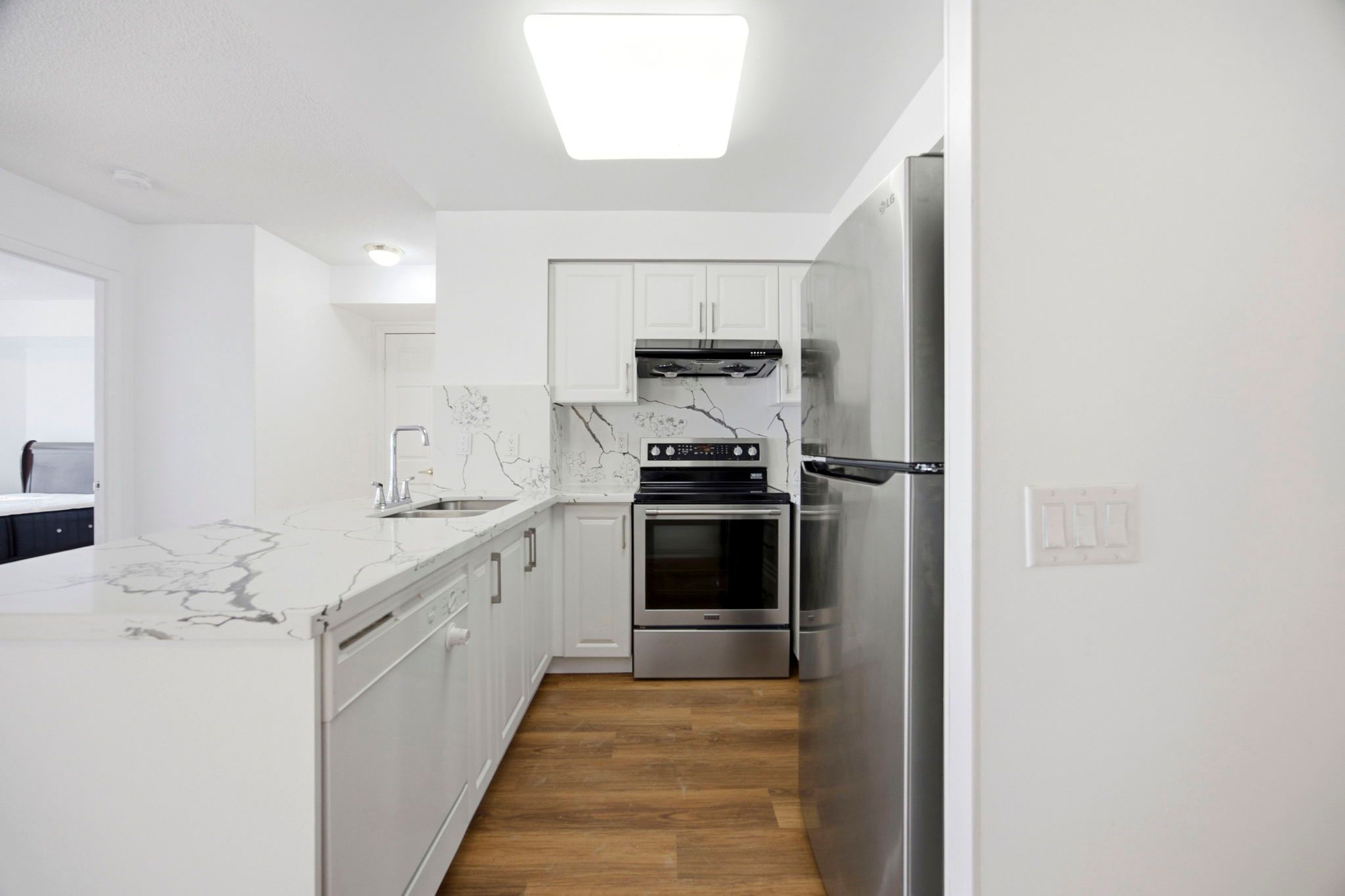 Move in ready renovated 2br 2wr north facing condo with unobstructed east & west skyline views in the sought after skymark west condominiums by tridel. Luxury vinyl & hardwood floors, updated modern kitchen cabinets & countertops, big bright bedrooms have large windows, and built in closet system in the primary bedroom. Condo living without the compromise of space and lifestyle. Skymark west ii is known for its extensive, well-maintained amenities including 24-hour concierge, indoor pool, fitness centre, bowling alley, squash/badminton courts, library theatre room, party room, and landscaped grounds located in access to downtown toronto and pearson airport while maintaining a residential feel. A rare opportunity for those seeking space, light, and location in a great building.