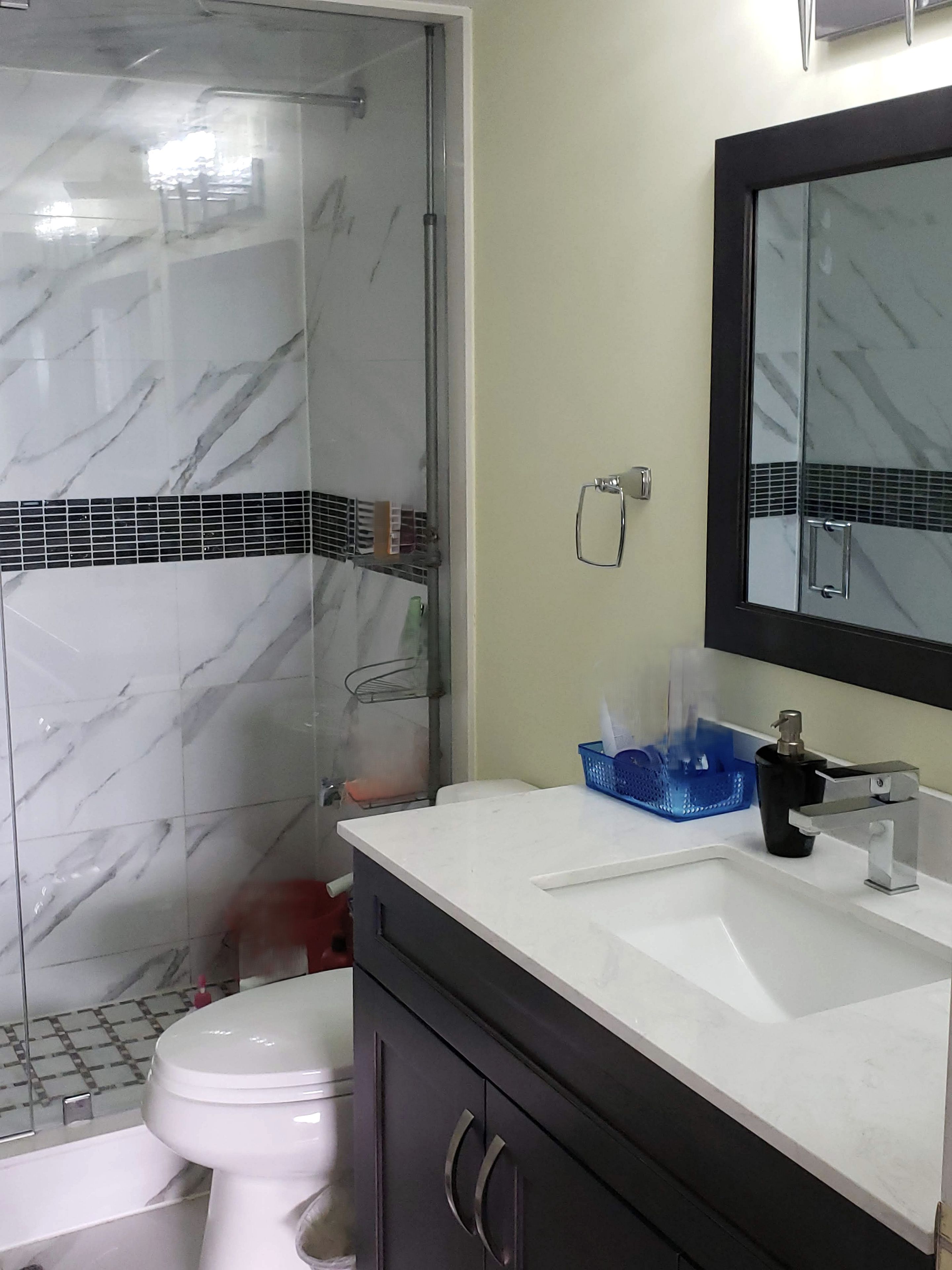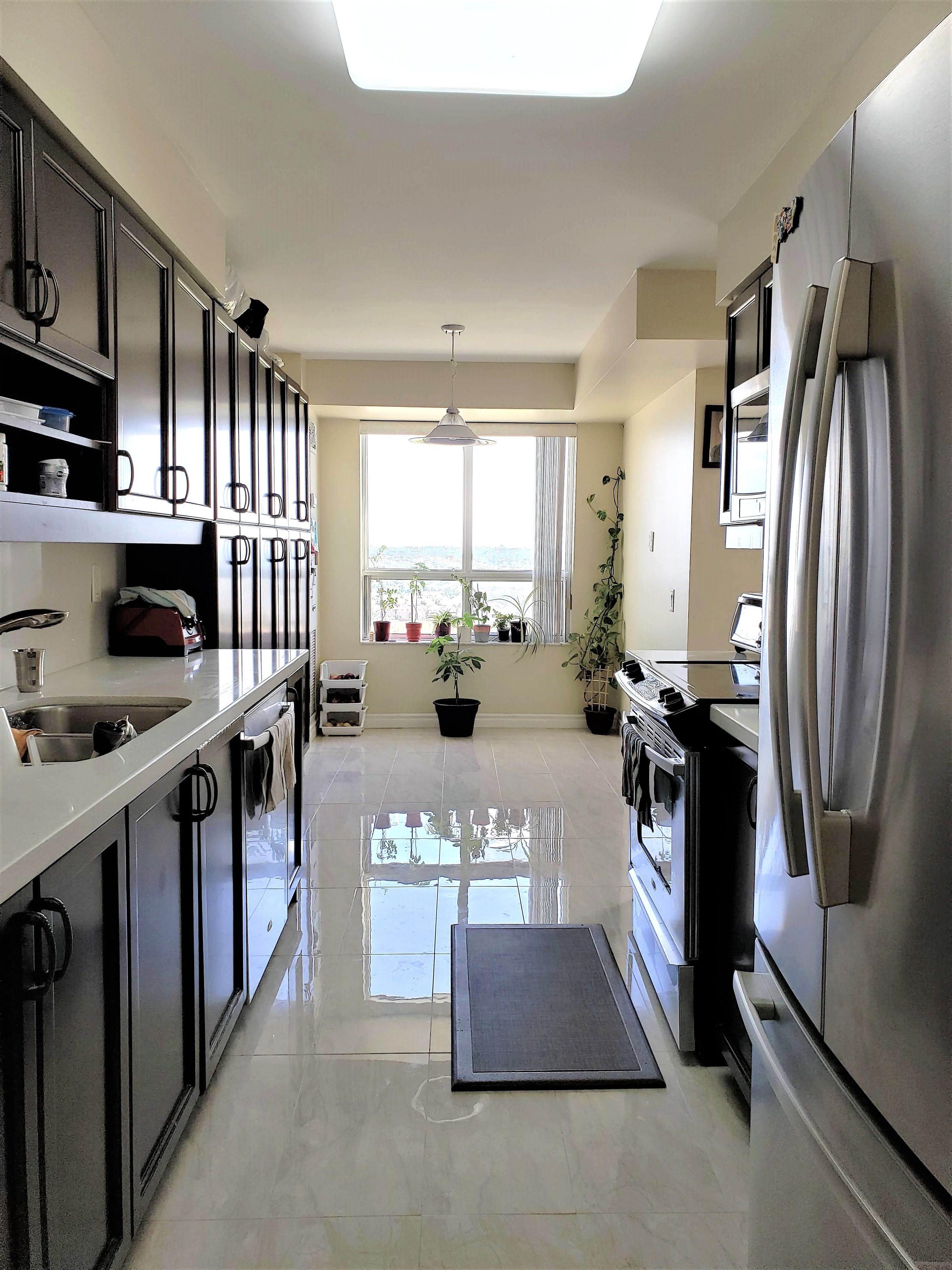 • Modern kitchen featuring quartz counters and stainless steel appliances.