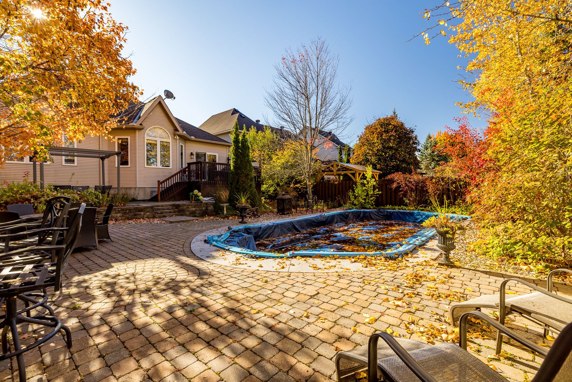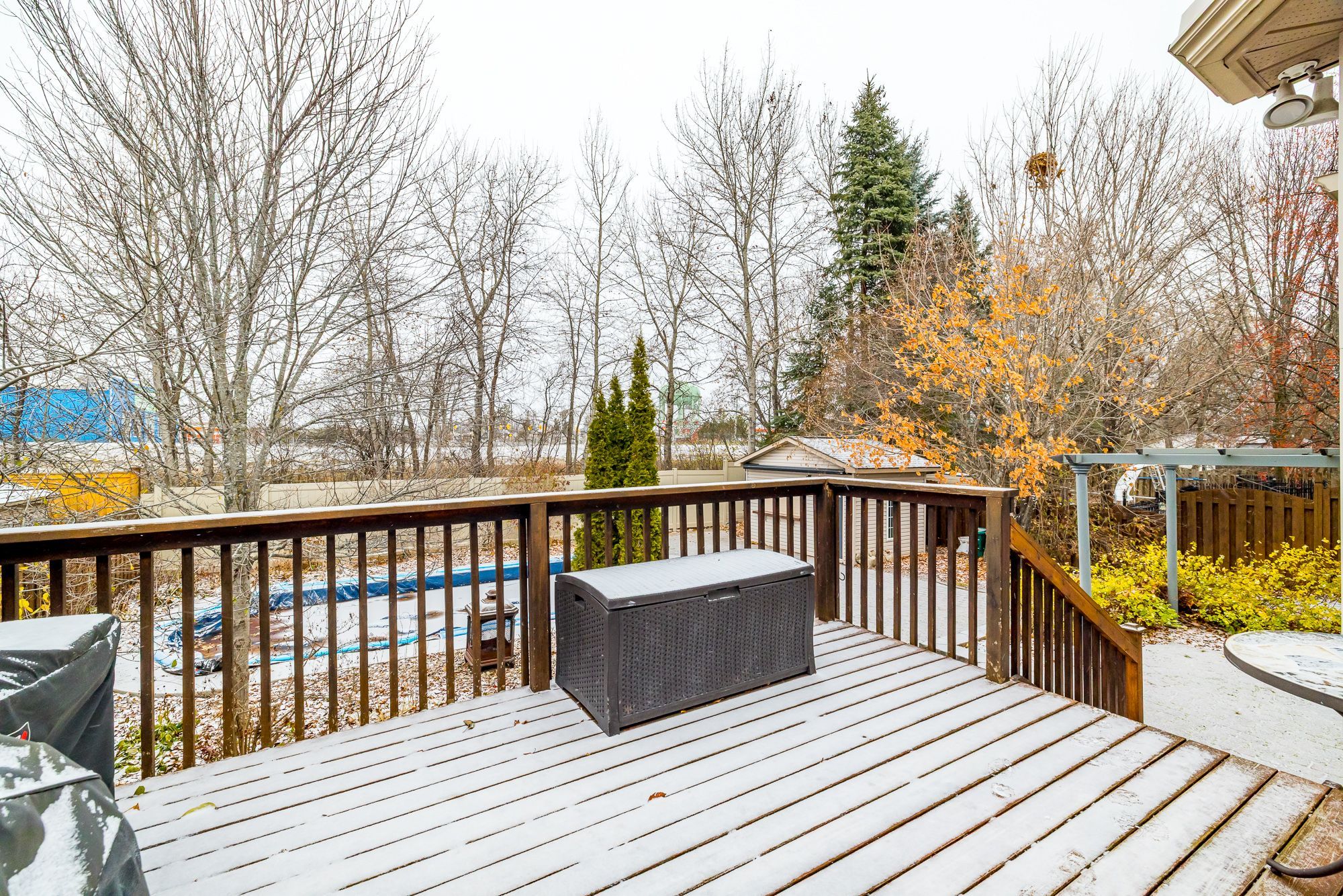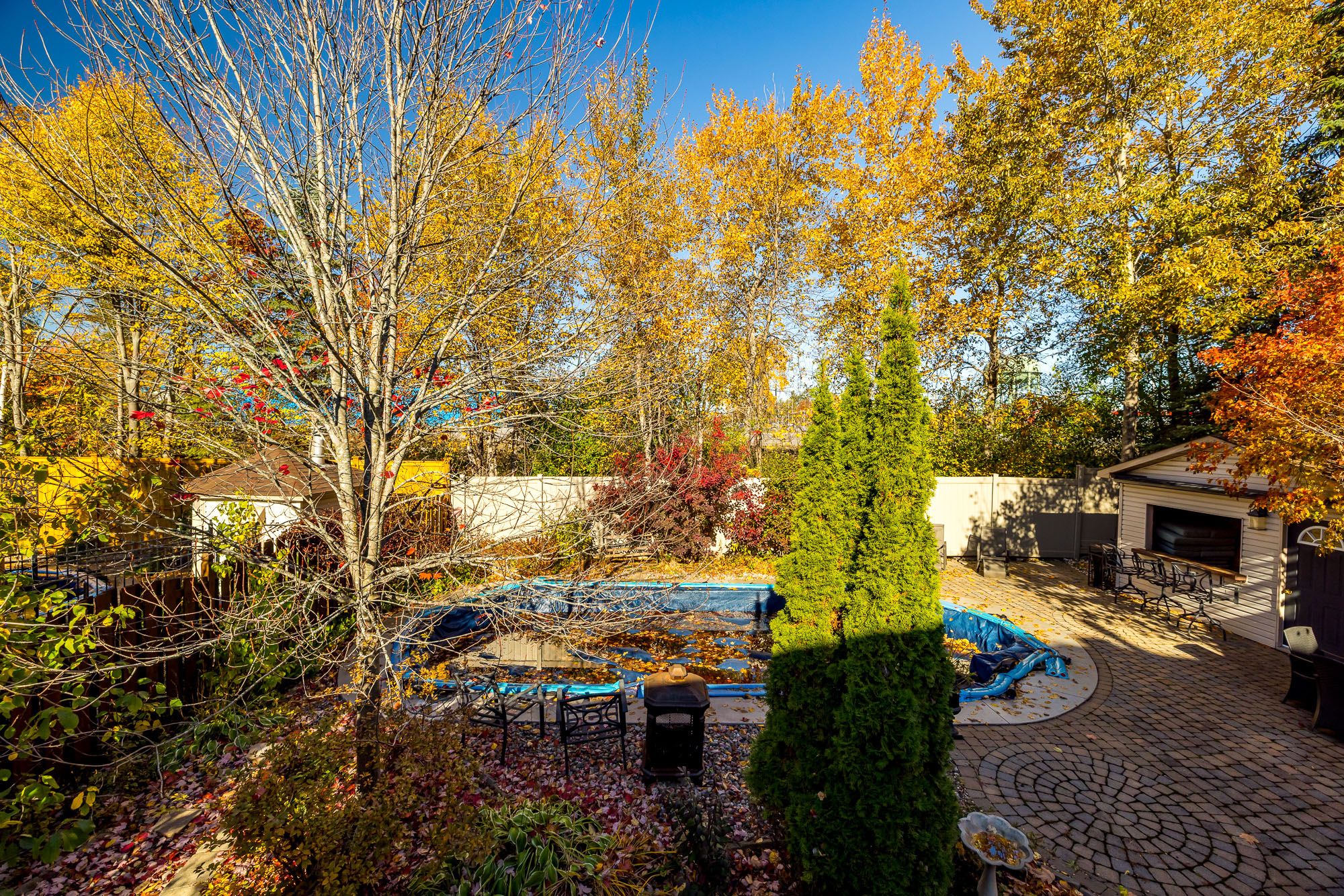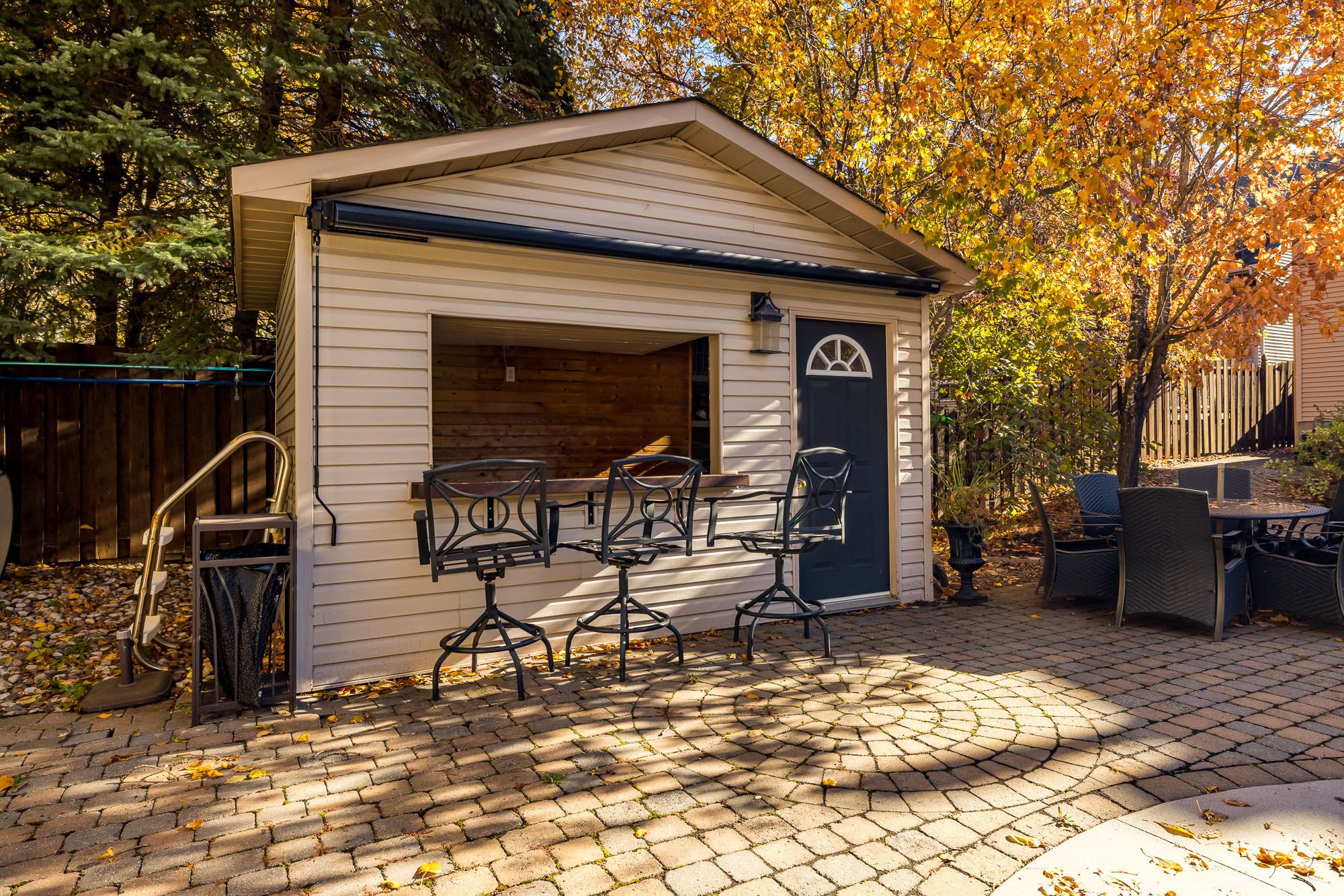 A rare find in crossing bridge - premier bungalow living! Step into a well-built custom bungalow blending main-floor ease, smart accessibility features, and a highly desirable crossing bridge address. Wide hallways, 36" doorways, and exterior ramps support living at every life stage, framed by an oversized, beautifully landscaped lot. Inside, the grand open layout suits modern living and entertaining. The bright family room-with cathedral ceiling and cozy gas fireplace-flows into a generous eat-in kitchen. Granite counters, deep pot drawers, extensive pantry cabinetry, and high-end stainless steel appliances (including a monogram gas stove with commercial-grade hood) make cooking a joy. A separate dining room welcomes family meals, shared laughter, and celebrations. The front bedroom serves as a home office, while the private primary suite boasts a walk-in closet and spa-like 4-piece ensuite with corner tub and separate shower. The second bedroom has cheater access to the second full bathroom; both feature durable granite countertops. A practical mudroom with direct ramp access from the garage ensures daily convenience. Summers shine here in the fully fenced backyard: interlock patios, heated saltwater pool (consistent 4'6" depth), pool house with retractable awning, and pergola-perfect for quiet mornings, family play, or warm summer evenings with friends. The lower level, with bathroom rough-in, offers potential for a gym, home theatre, games area, and generous storage. Bungalows of this size, quality, and condition rarely come available in crossing bridge. Enjoy spacious main-floor living steps from parks, pathways, restaurants, schools, and amenities in this friendly, community-focused neighbourhood. (a/c 2020, pool liner 2024, gaf roof 2016, monogram stove 2022, front lawn irrigation )