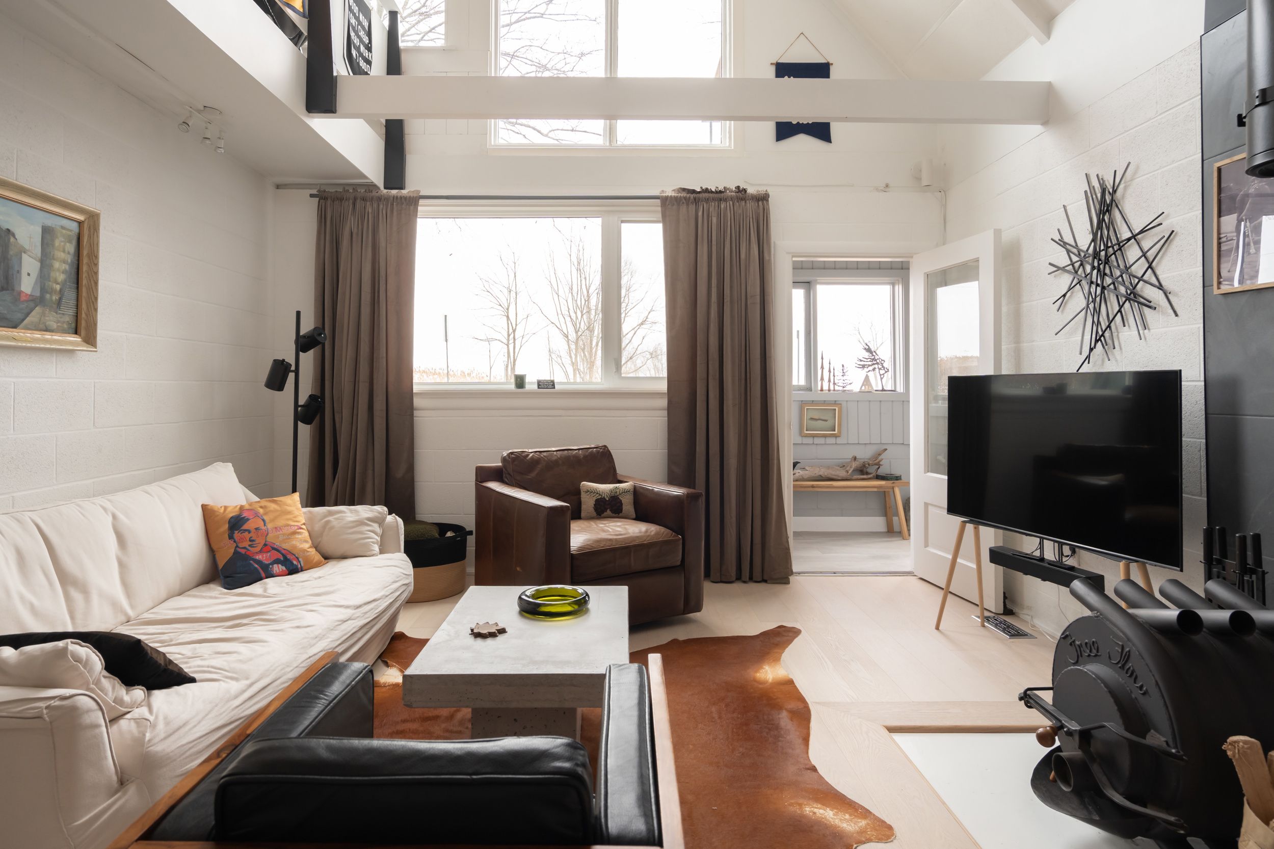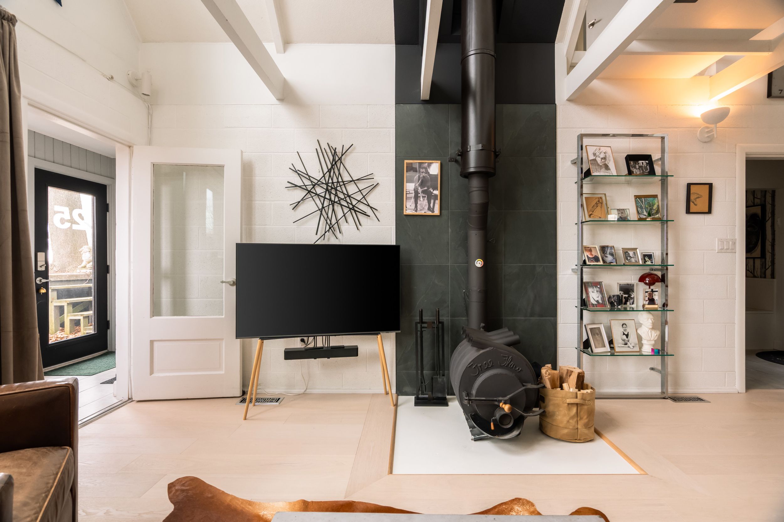 • Open-concept living area with a cozy wood stove and impressive window views.