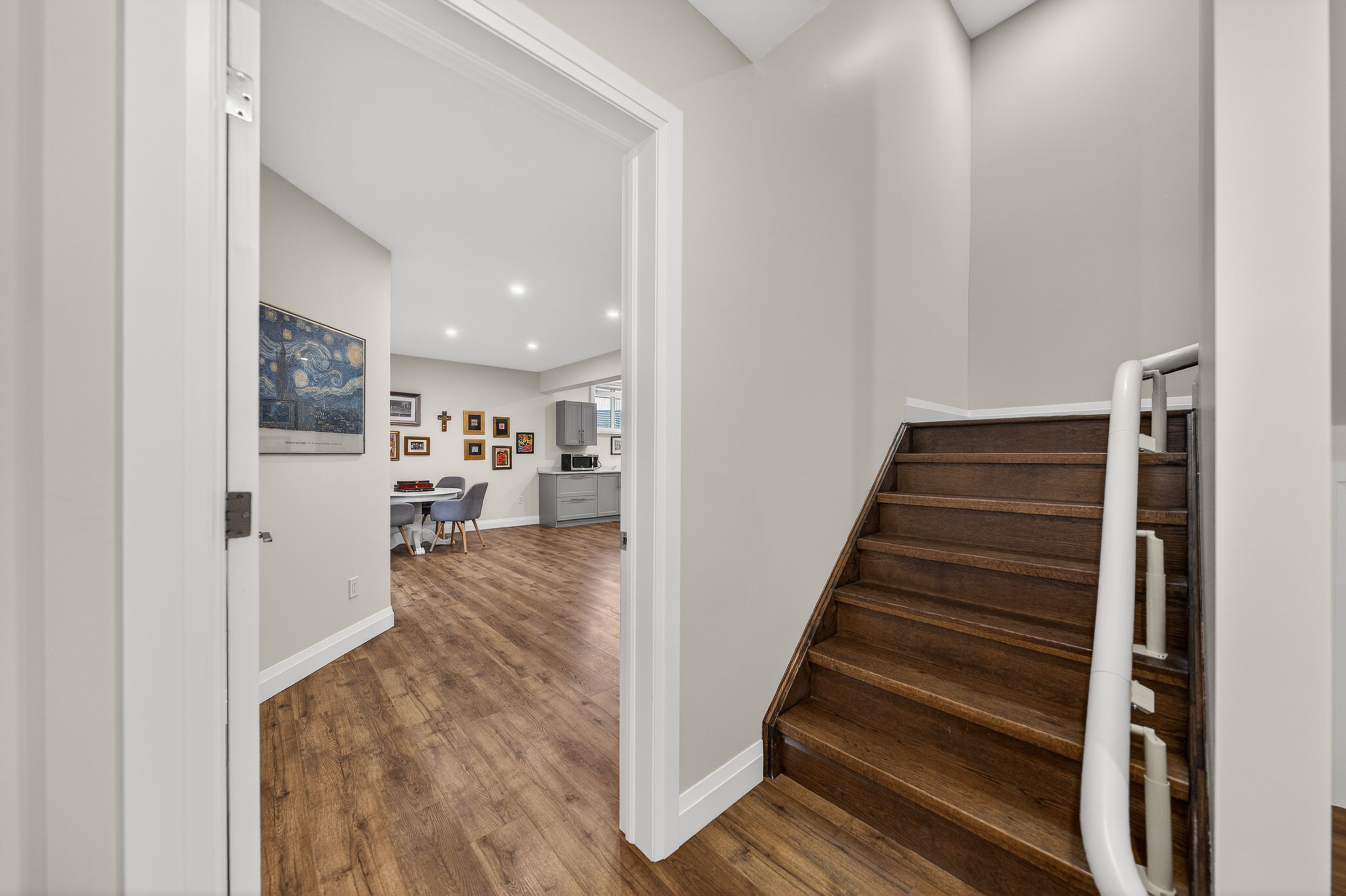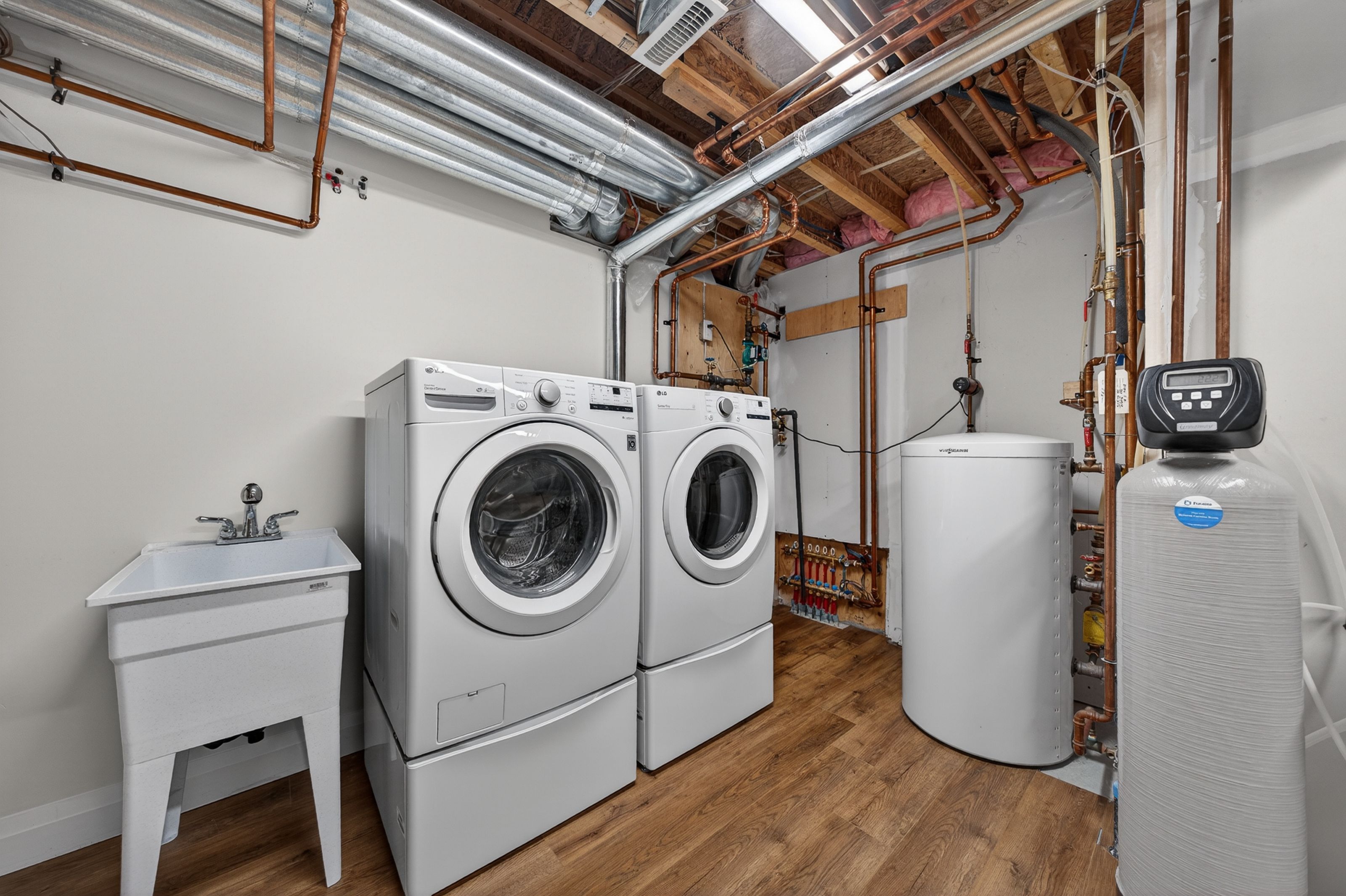 • Finished basement with large windows, fireplace, and separate laundry room.