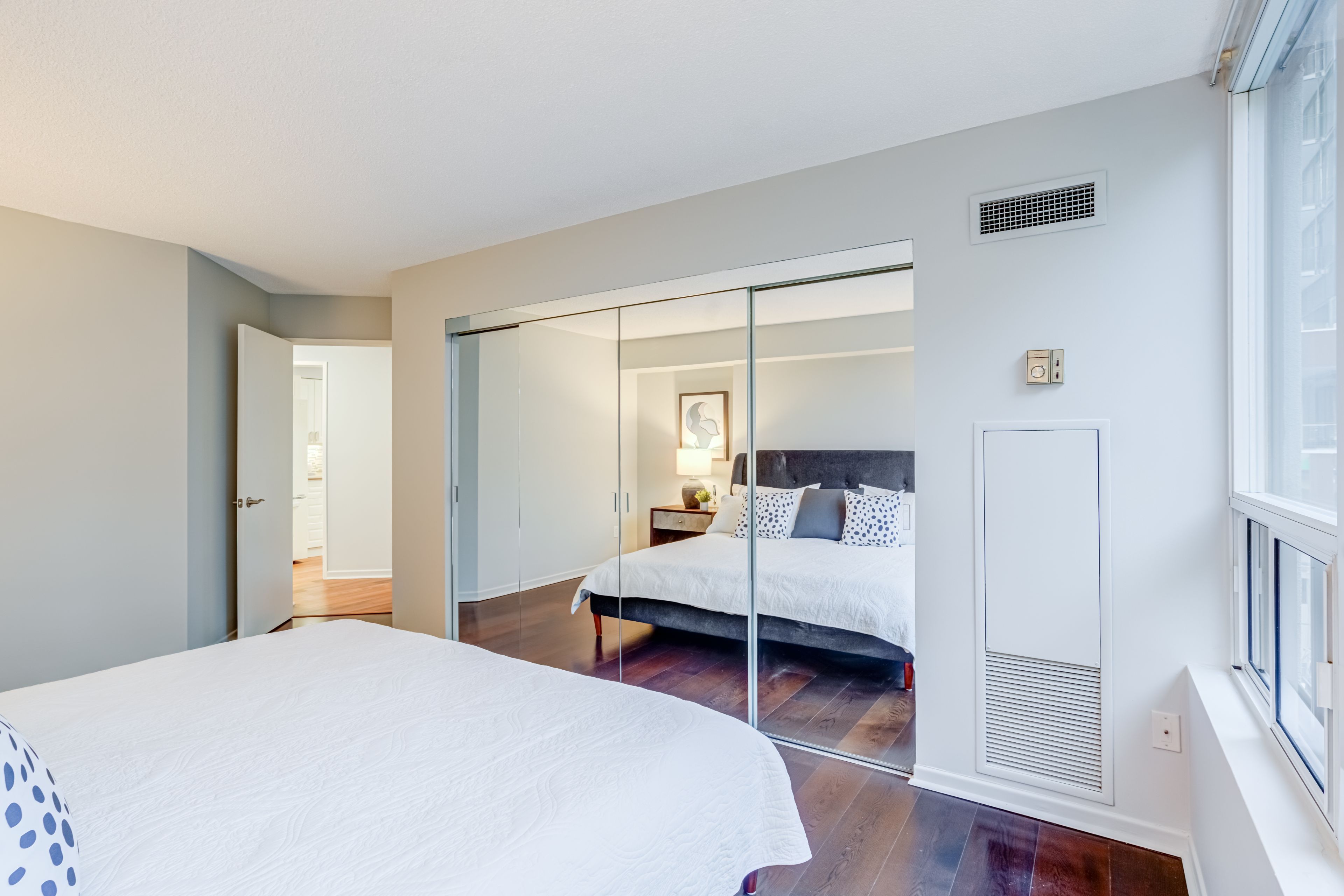 Welcome to the cosmopolitan at 25 maitland street - where style, space, and convenience meet in the heart of downtown toronto! This stunning 1 bedroom, 1 bathroom corner suite with north-east exposure offers over 900 square feet of thoughtfully designed living space, combining sophistication with everyday comfort. Freshly painted and featuring engineered black walnut flooring throughout, with laminate in the bedroom and ceramic tile in the bath, this home is move-in ready. The updated galley-style kitchen opens to a bright eat-in breakfast area overlooking maitland street, a perfect spot for morning coffee or a cozy work-from-home space. With updated lighting throughout, enjoy the open concept and large windows that fill the living/dining space with natural light. The spa-like bathroom impresses with a glass-enclosed shower, a freestanding clawfoot tub, and a large vanity offering ample storage. The spacious bedroom features a full wall of mirrored closets with ample shelves and closet organizer within. Residents of the cosmopolitan enjoy an exceptional list of amenities: a rooftop deck and outdoor pool with city views, 24-hour concierge, gym, sauna, library, billiards room, guest suites, party and meeting rooms, and visitor parking. All utilities, heat, hydro, water and a/c are included in the maintenance fees, leaving only cable and internet to you. Nestled in the vibrant church & wellesley corridor, you're surrounded by some of toronto's best dining, nightlife, shopping and cultural attractions. The village, eaton centre, sankofa square and toronto metropolitan university are all moments away, with the ttc right at your doorstep for seamless access across the city. Whether you're a first-time buyer, downsizer, or investor, this suite offers a lifestyle that's as dynamic as the neighbourhood itself; chic, convenient and completely connected to everything downtown toronto has to offer.