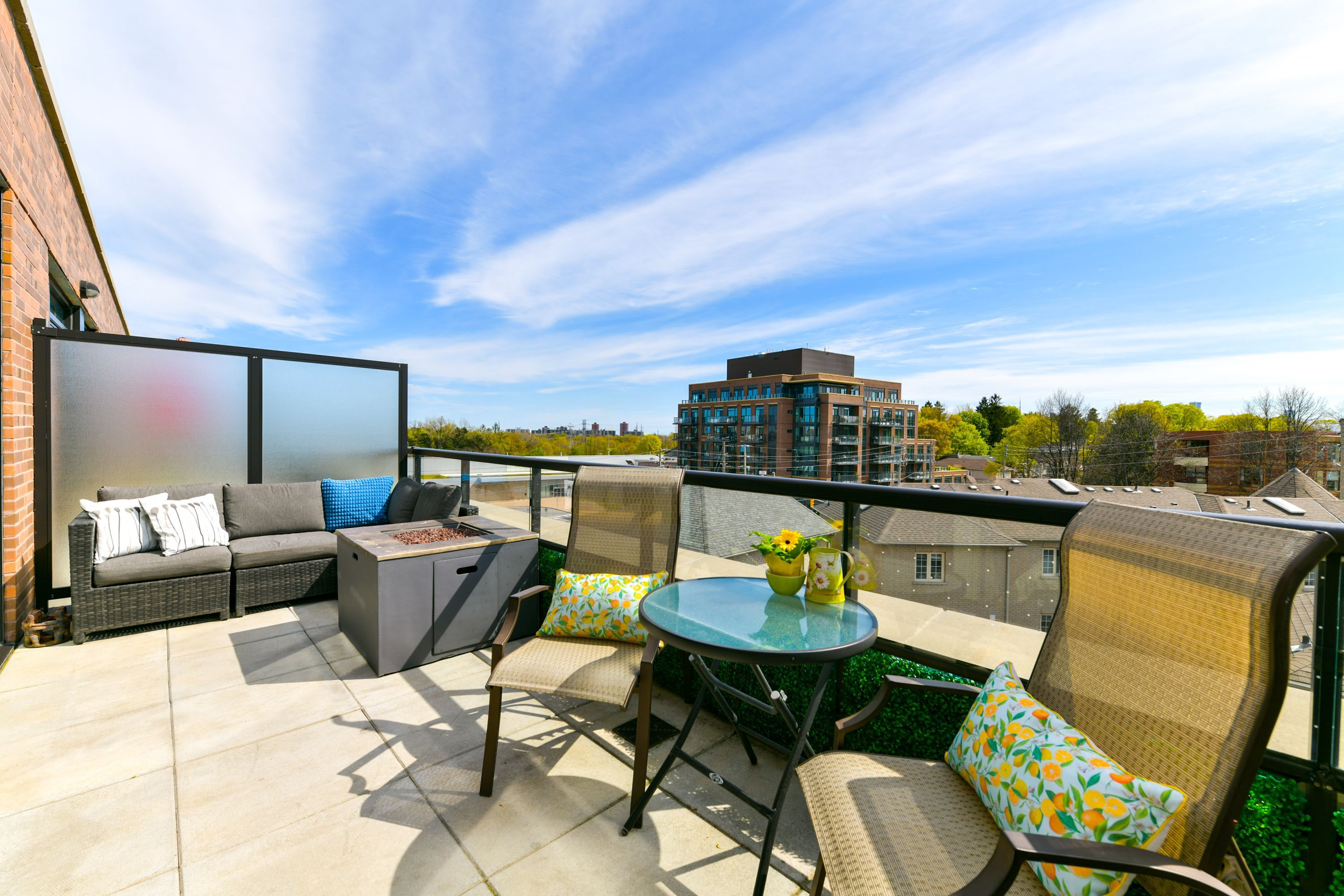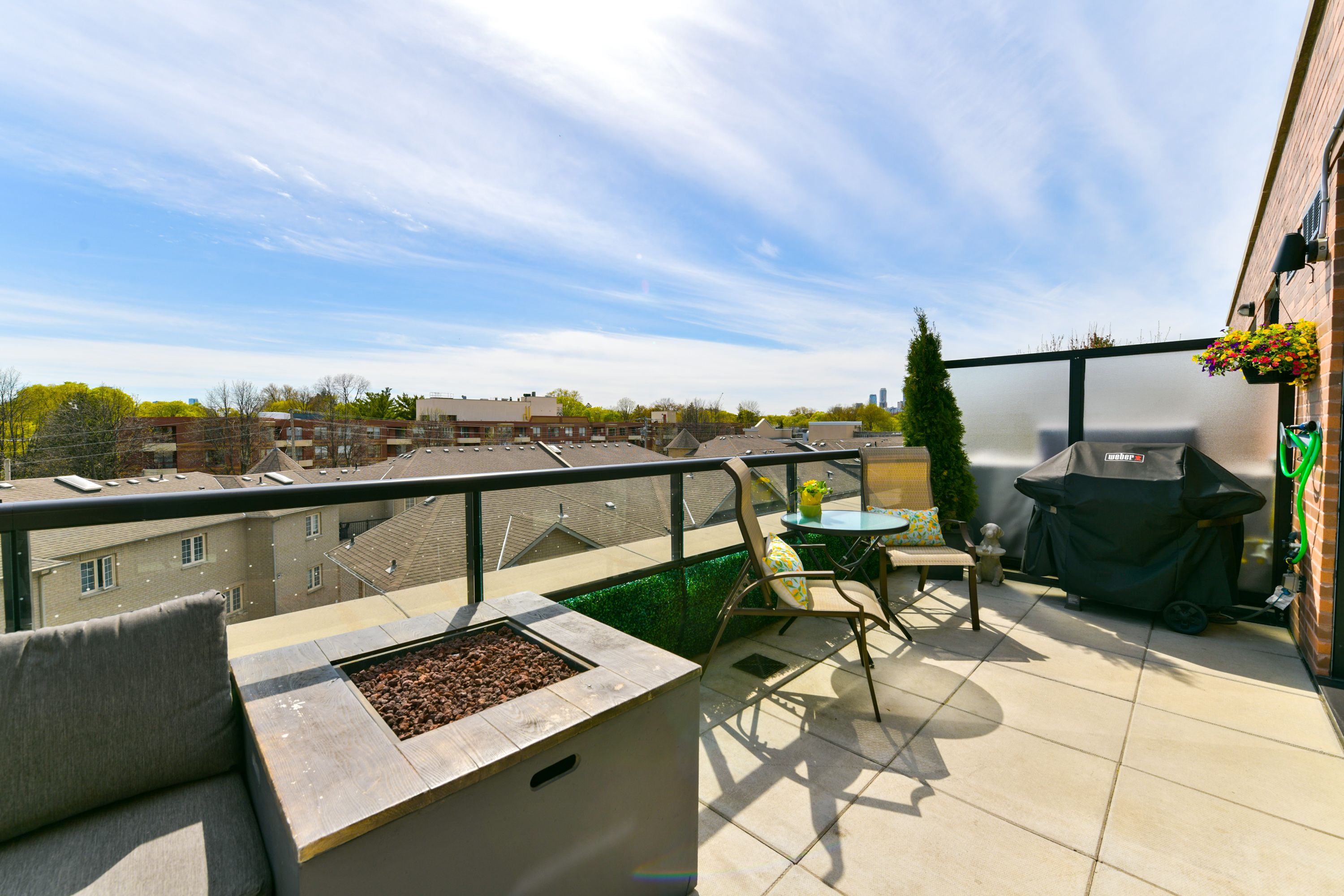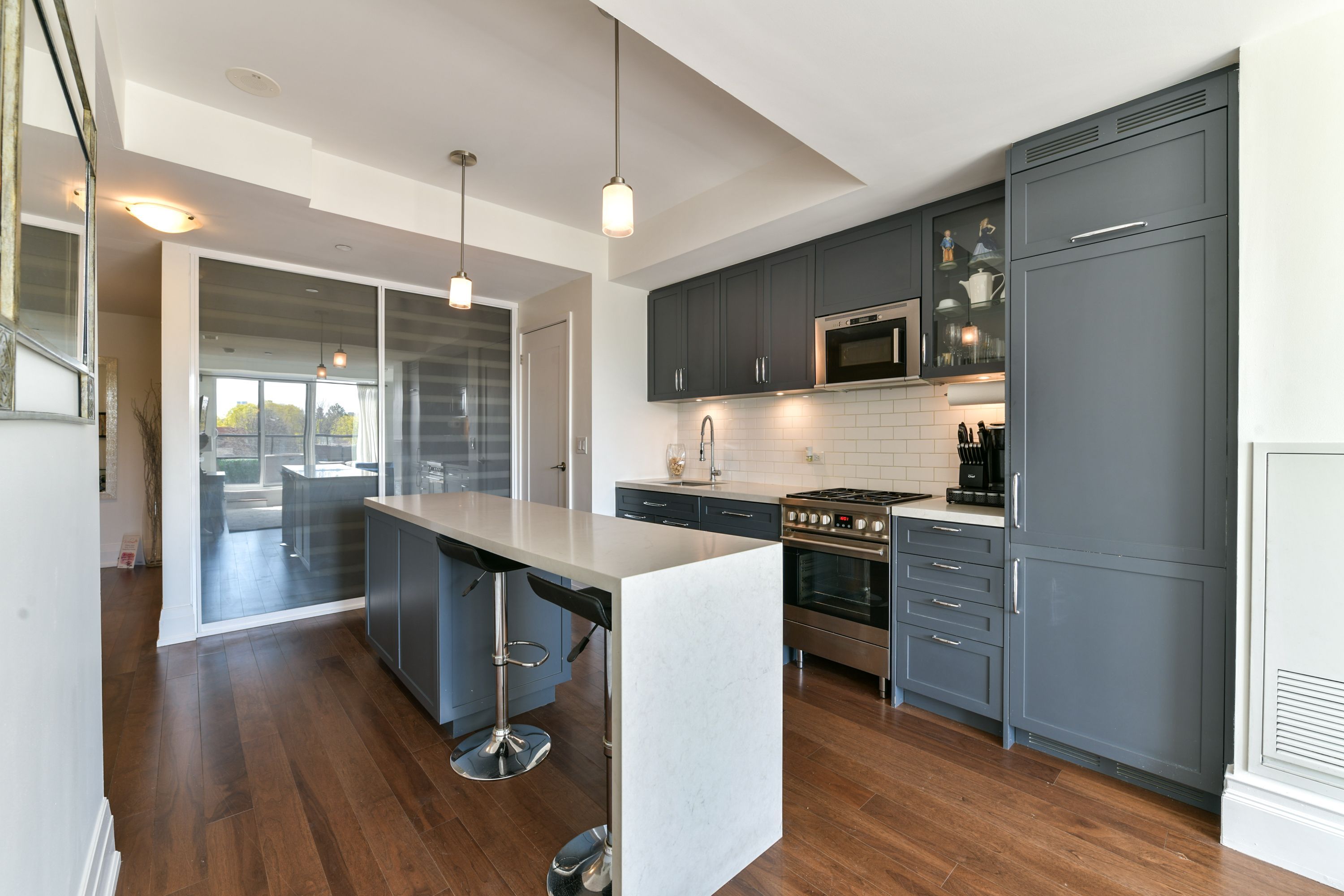 This stunning, bright 2 bedroom, 2 bathroom condo unit is unique with a huge terrace (171 sf) and an unobstructed view towards the cn tower. Engineered hardwood floors, granite waterfall counters, and centre island. This unit has many upgrades, including a gas stove, water and gas hook-ups on the terrace and two walkouts to the oversized terrace. This boutique condo is equipped with a rooftop patio, dog spa, guest suite, party room, gym and concierge. Close to excellent schools, several grocery stores, shops and restaurants.