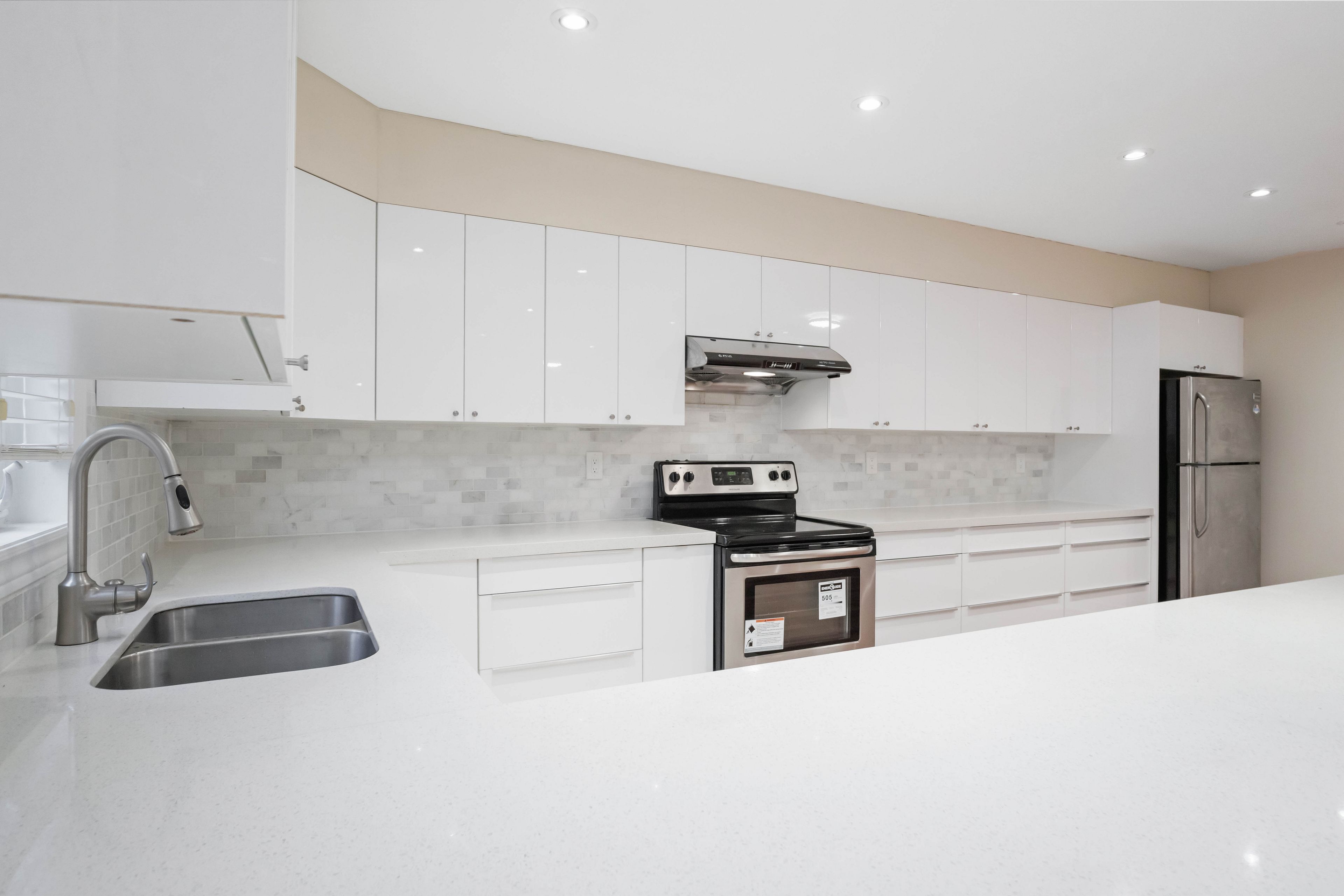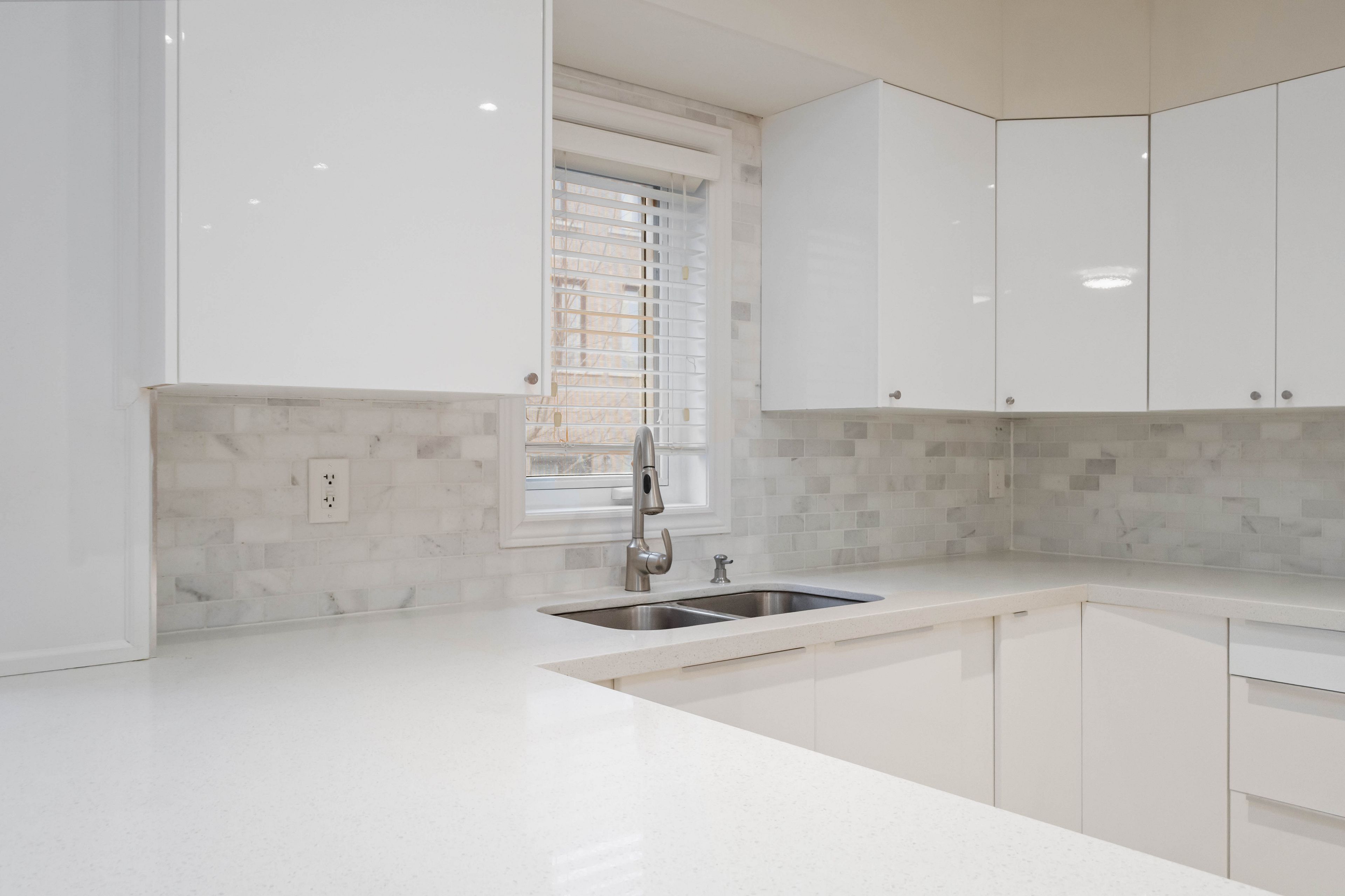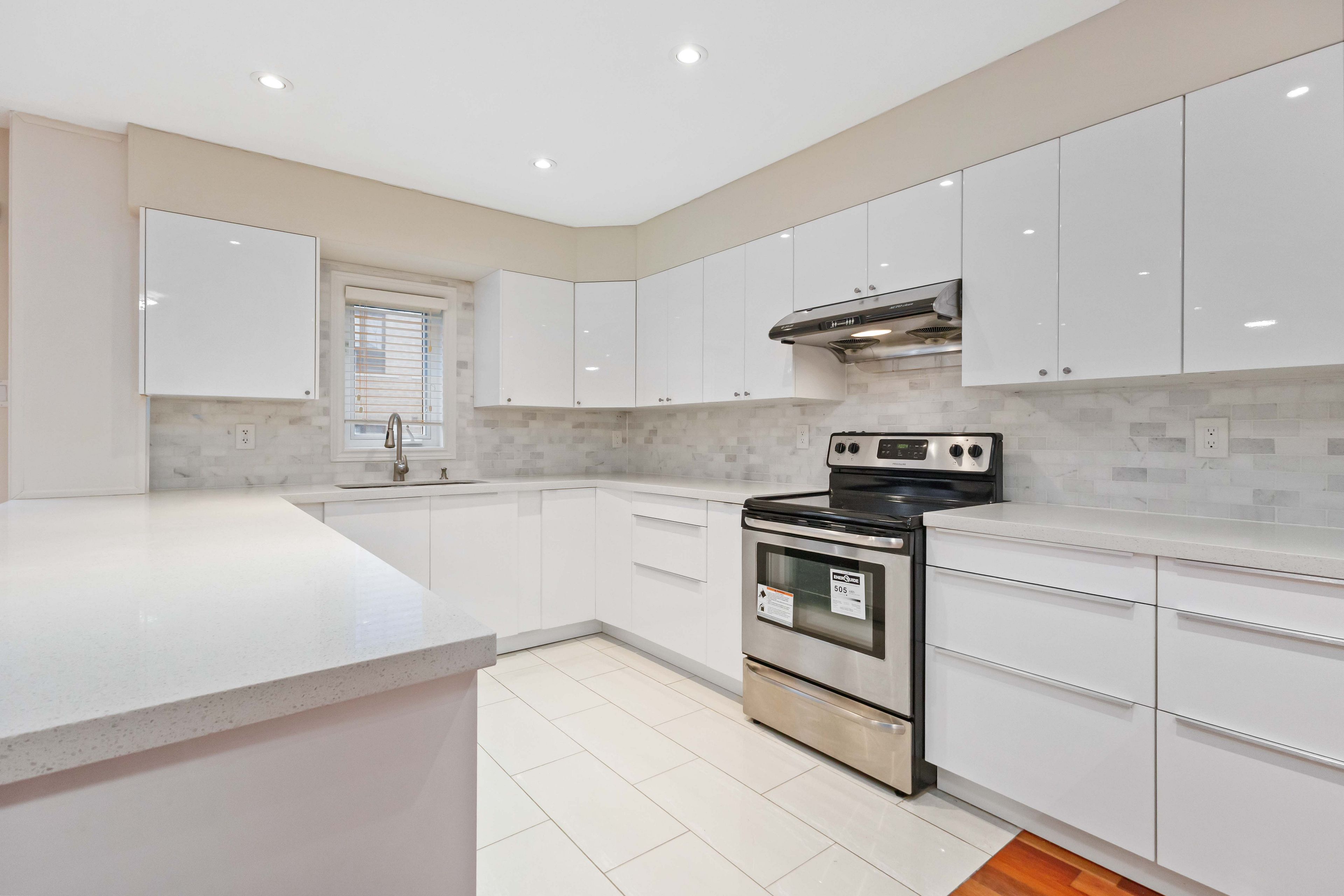 • Beautifully renovated kitchen with quartz countertops and stainless steel appliances.