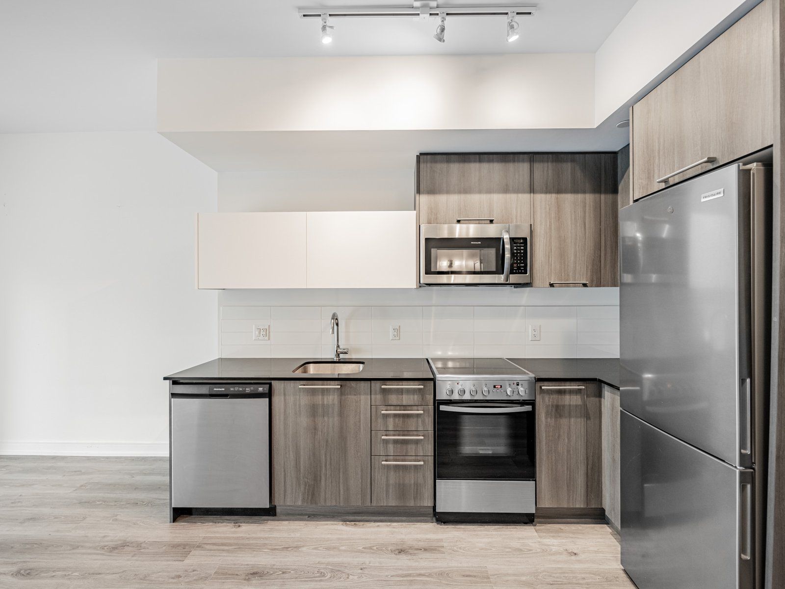 • Modern laminate floors and stylish Caesar stone countertops in the kitchen.
