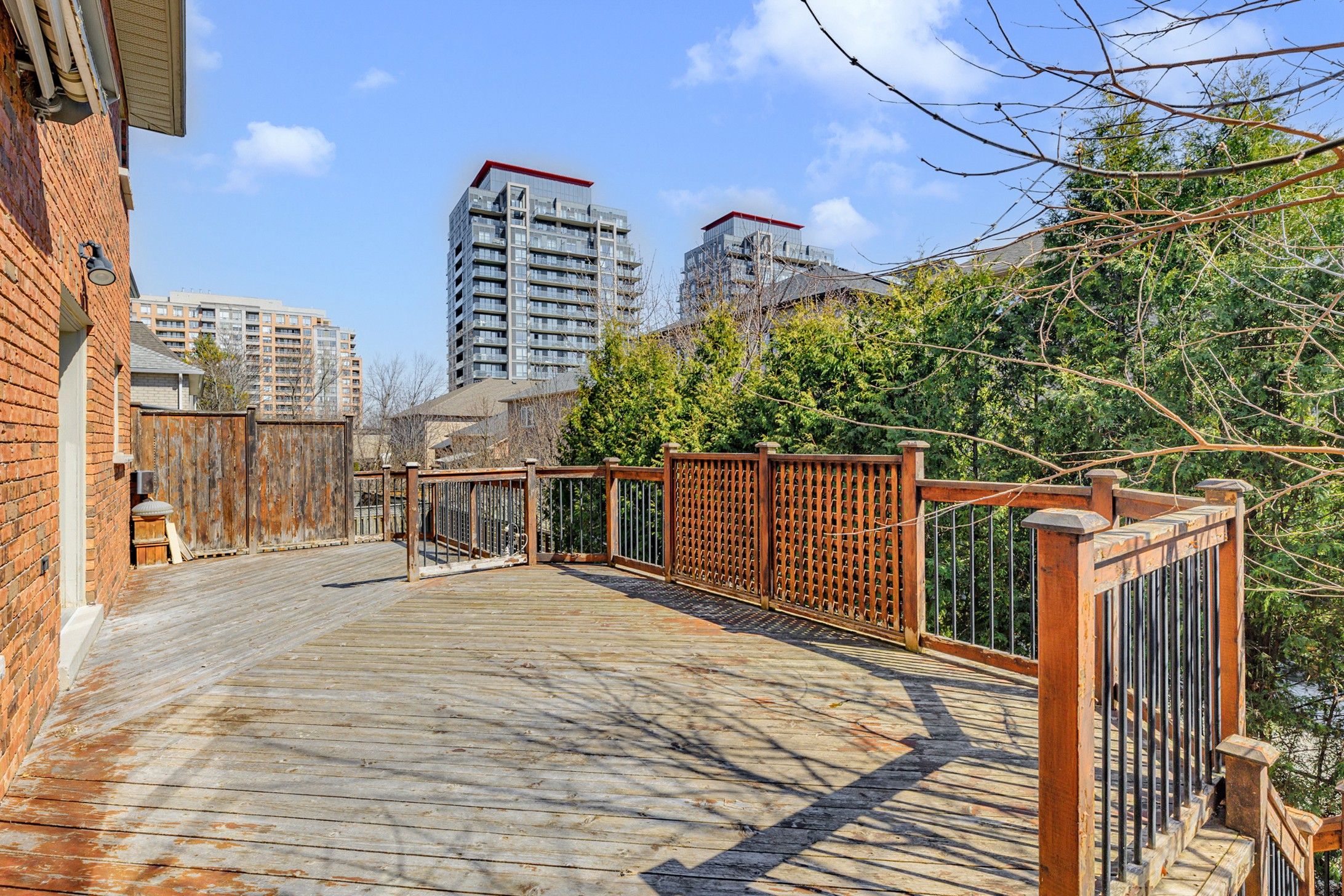 • Oversized deck surrounded by mature trees for privacy.